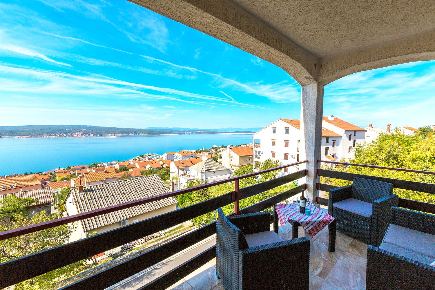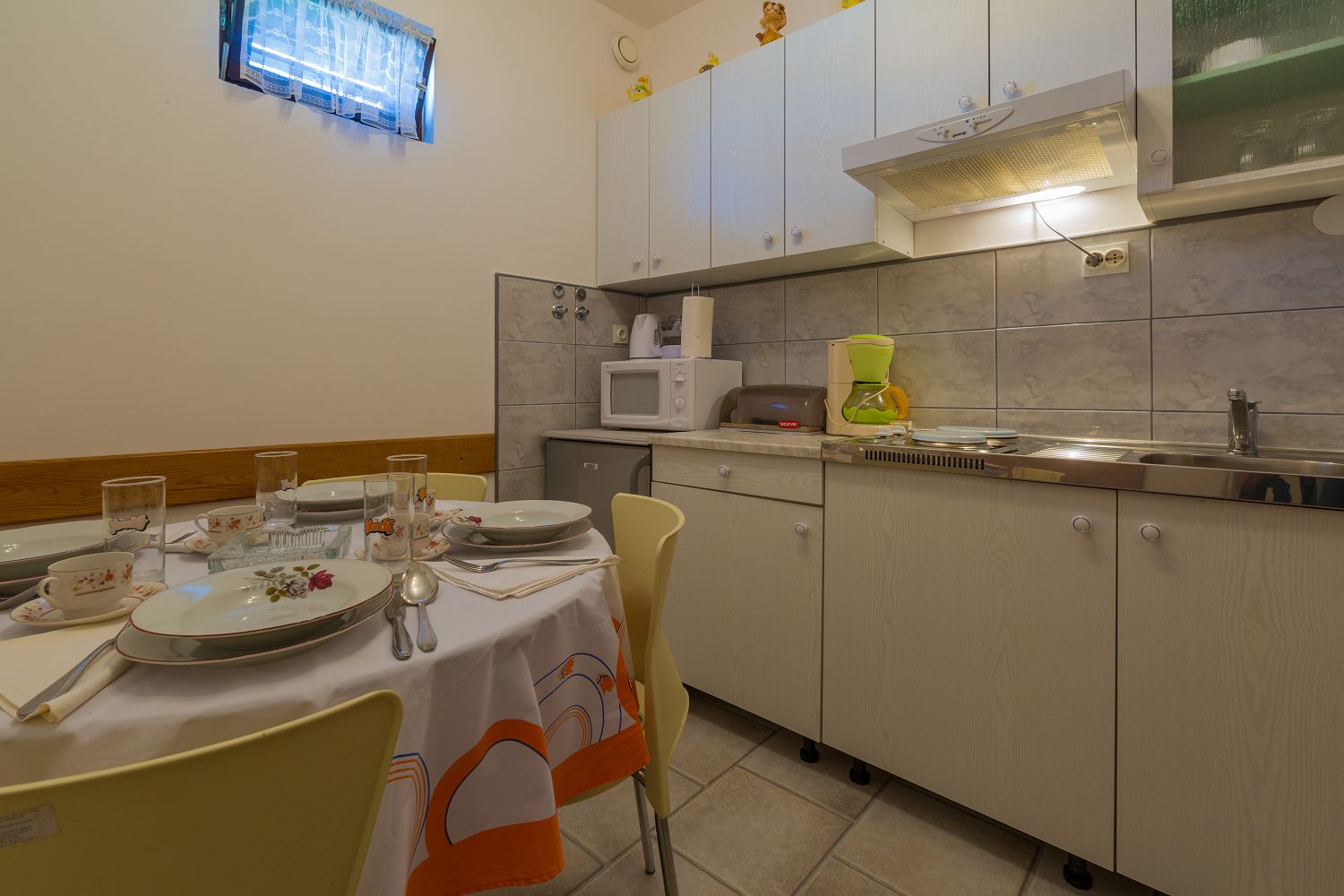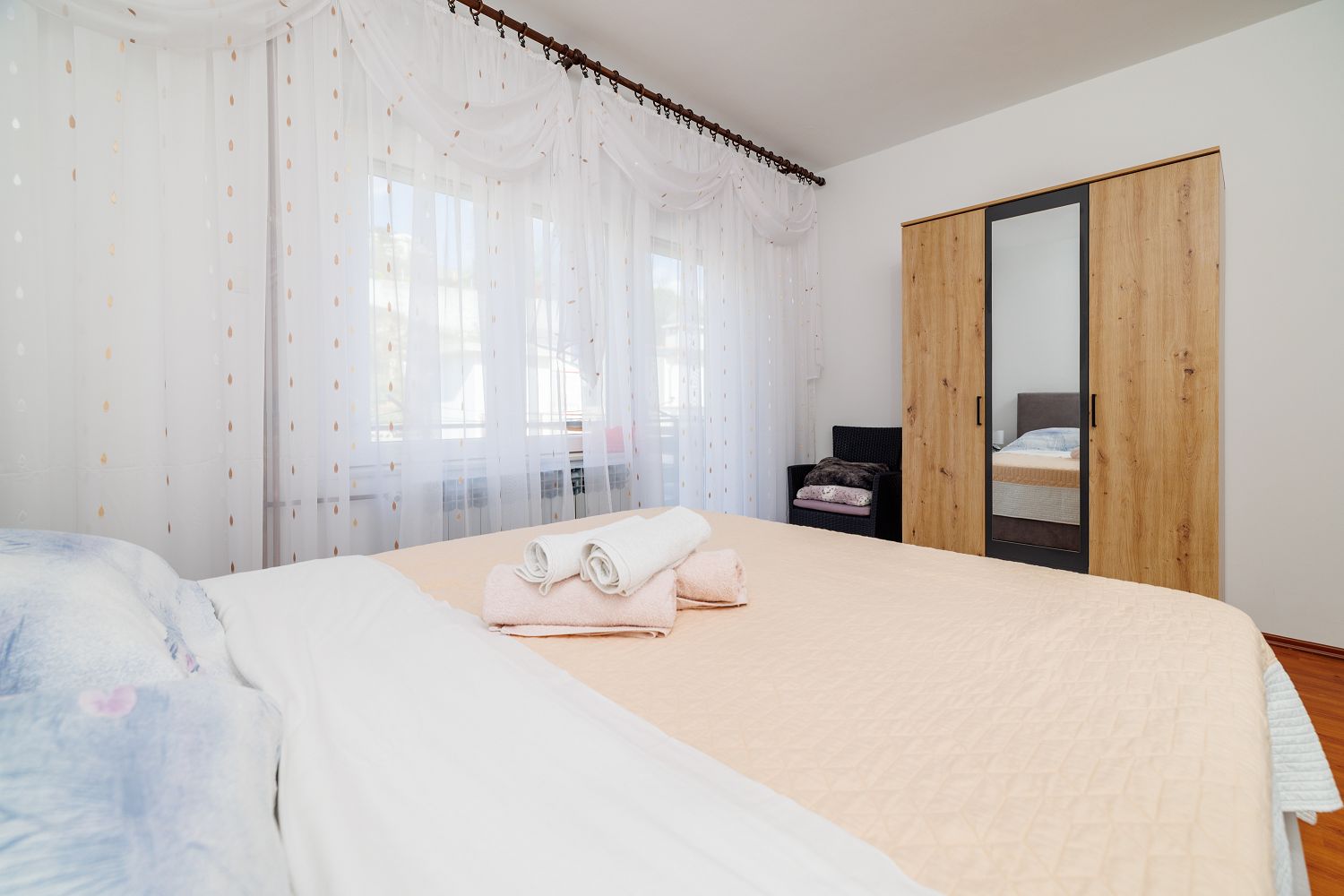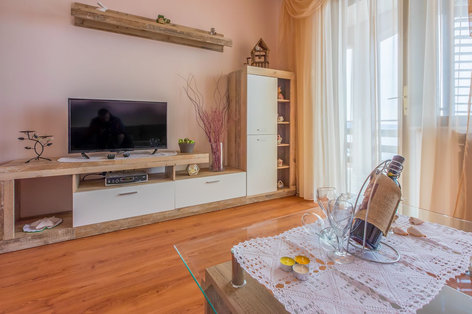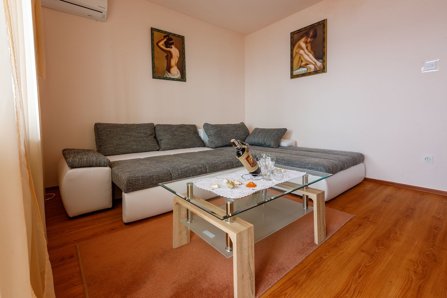 Dieses Apartment besteht aus einem Wohnzimmer, einem Schlafzimmer, einer Essküche, einem Badezimmer sowie zwei Balkonen: einem 6 m² großen zur Rückseite des Hauses und einem 10 m² großen mit Meerblick zur Vorderseite. Ein Kinderbett ist auf Anfrage verfügbar. Es gibt einen Fitnessraum. Vom Objekt bis zum Strand sind es 650 Meter und die Entfernung zum Zentrum beträgt 1,5 km. Das nächstgelegenste Lebensmittelgeschäft befindet sich 650 Meter von der Ferienimmobilie entfernt. In 700 Metern ist das umliegende Restaurant zu erreichen.