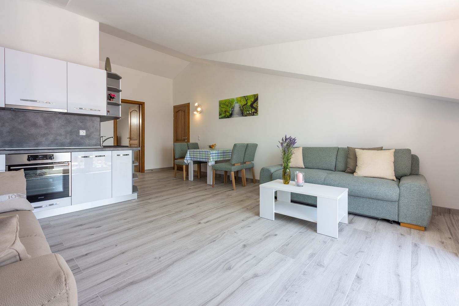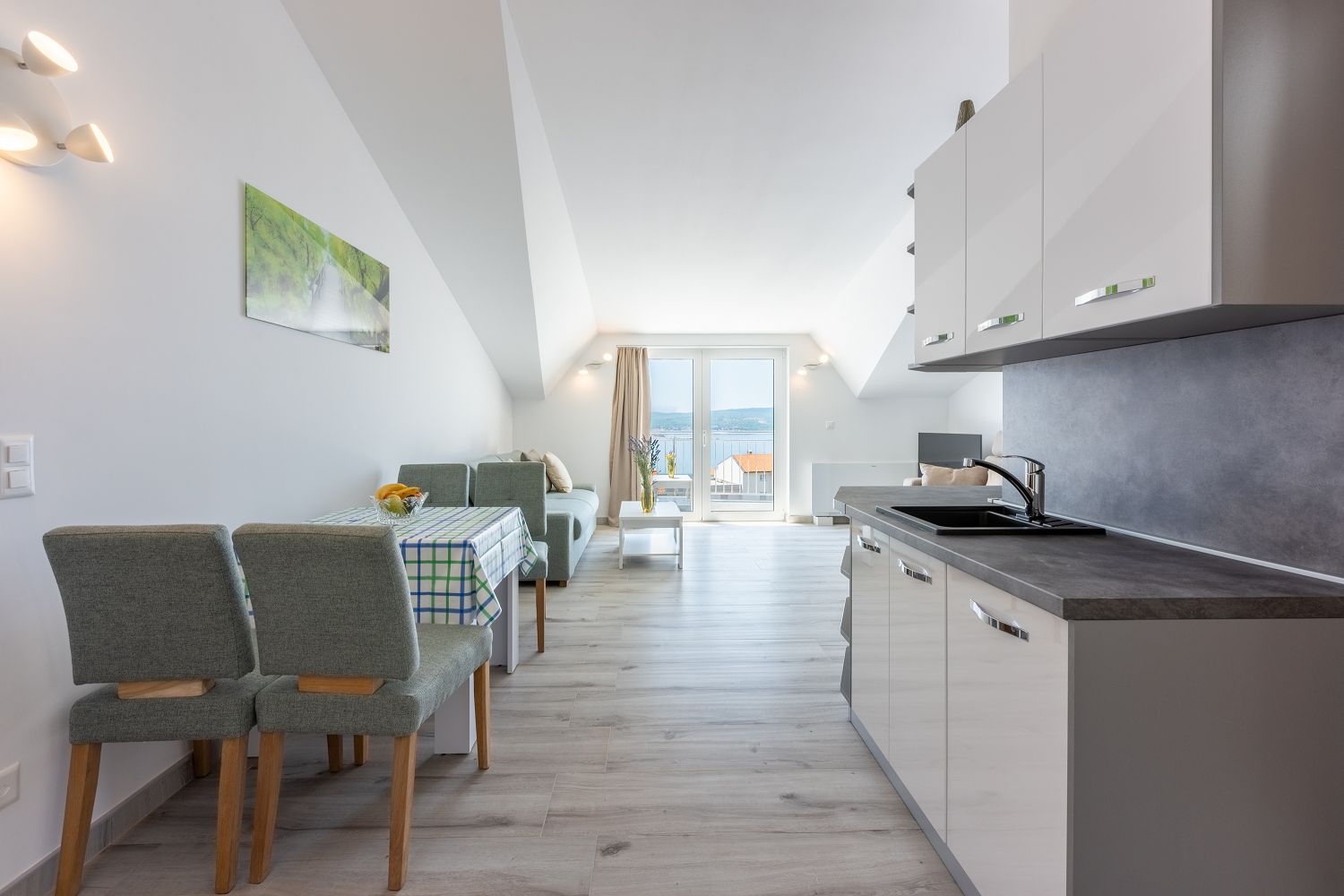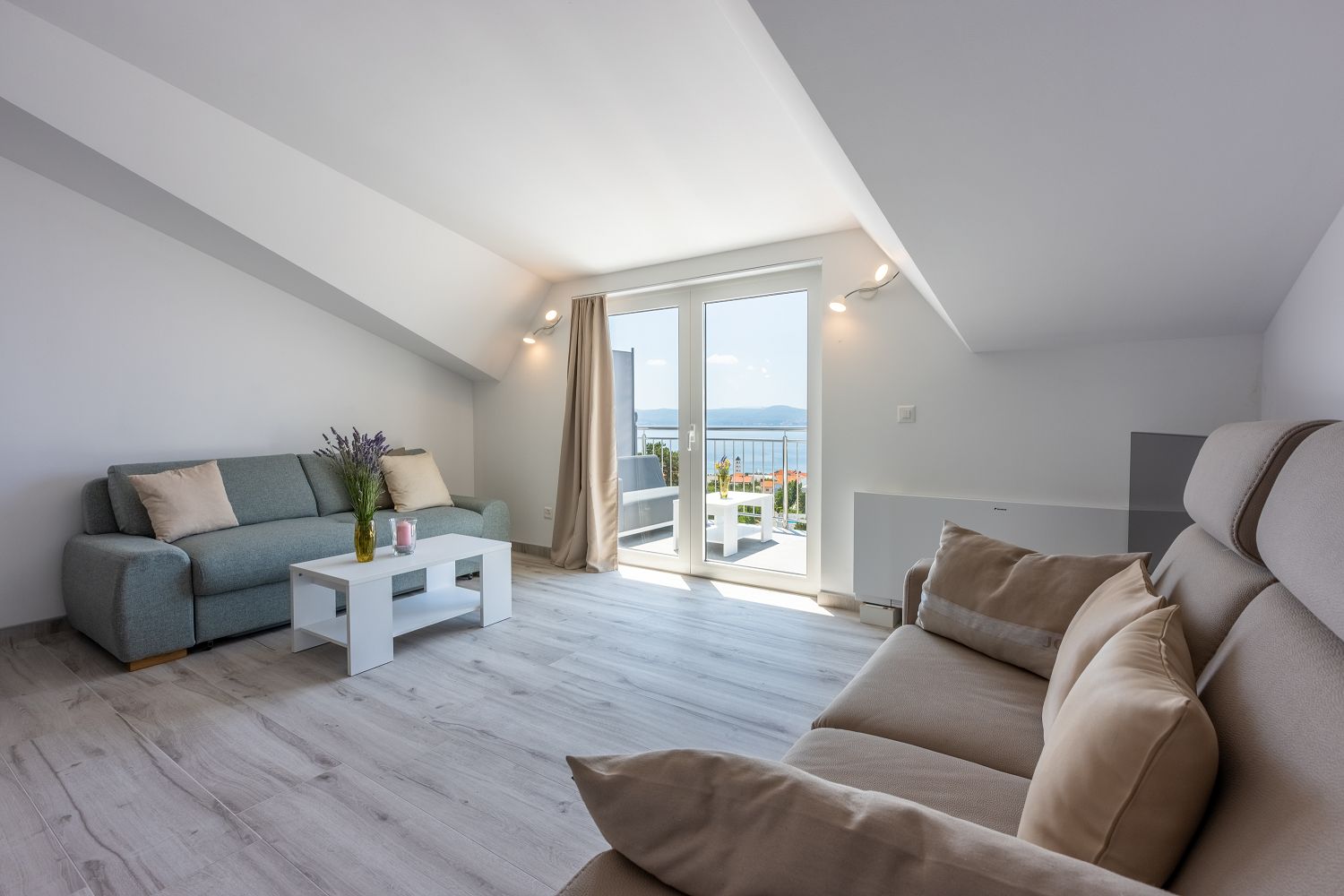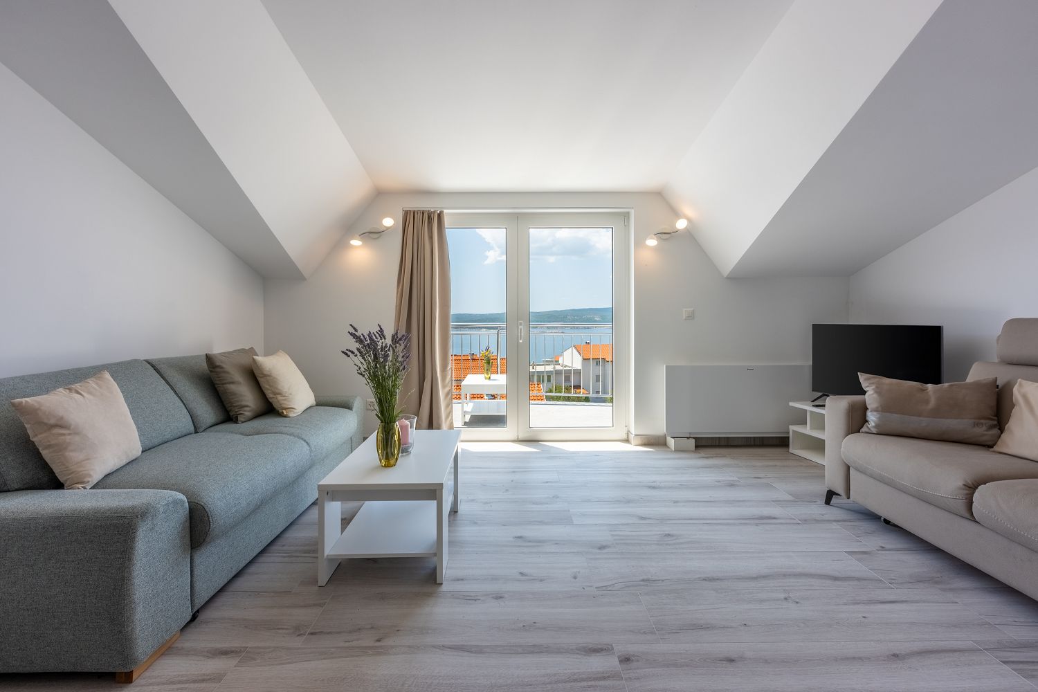 Die Wohnung liegt im dritten Obergeschoss und besteht aus einem geräumigen Wohn-/Esszimmer mit offener Küche, einem Schlafzimmer und einem Badezimmer. Vom Wohnbereich aus hat man direkten Zugang zu dem Balkon der Wohnung, der einen traumhaften Meerblick bietet. Ein privater Parkplatz befindet sich auf dem Grundstück des Hauses und kann kostenfrei genutzt werden. Vom Objekt bis zum Strand sind es 950 Meter und die Entfernung zum Zentrum beträgt 900 Meter. Das nächstgelegenste Lebensmittelgeschäft befindet sich 900 Meter von der Ferienimmobilie entfernt. In 900 Metern ist das umliegende Restaurant zu erreichen.