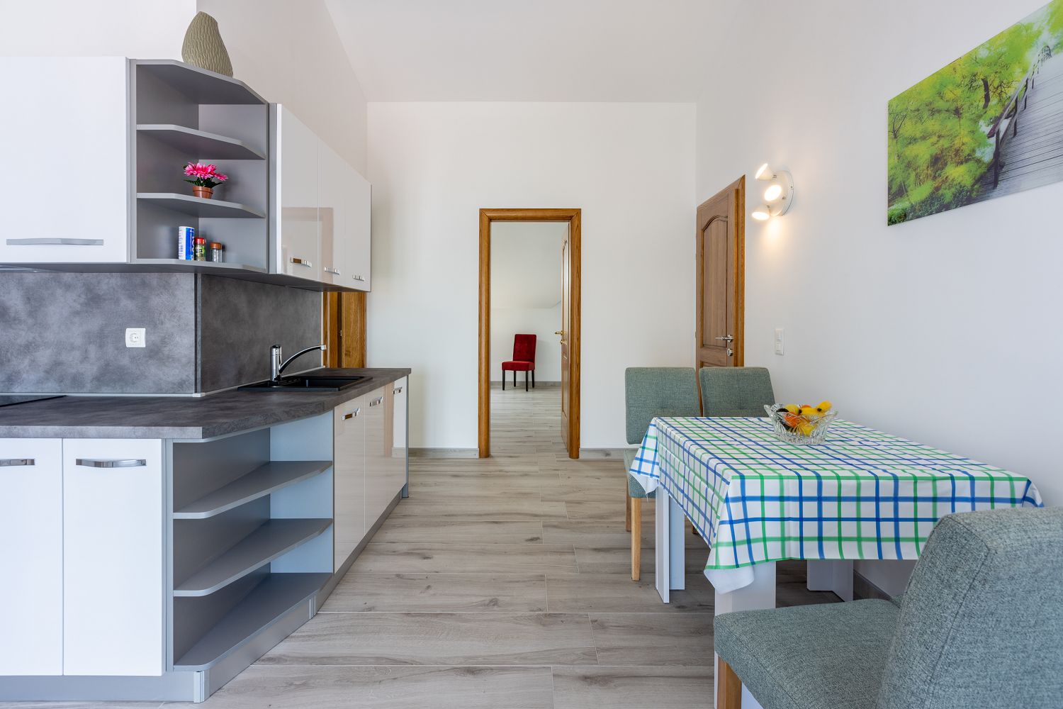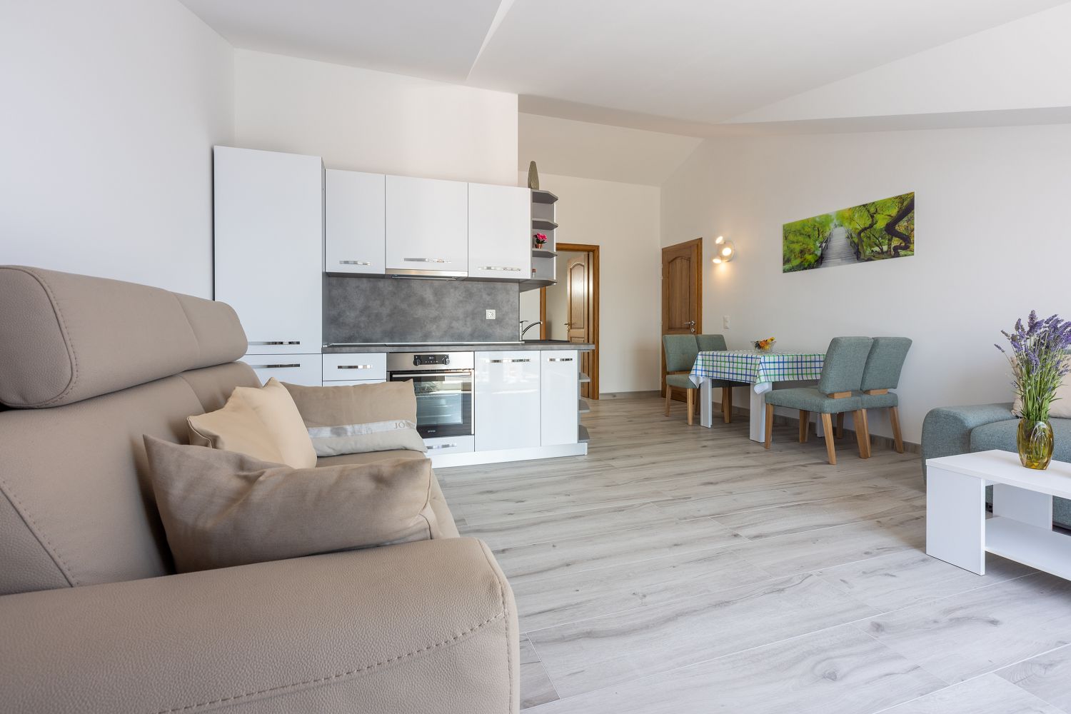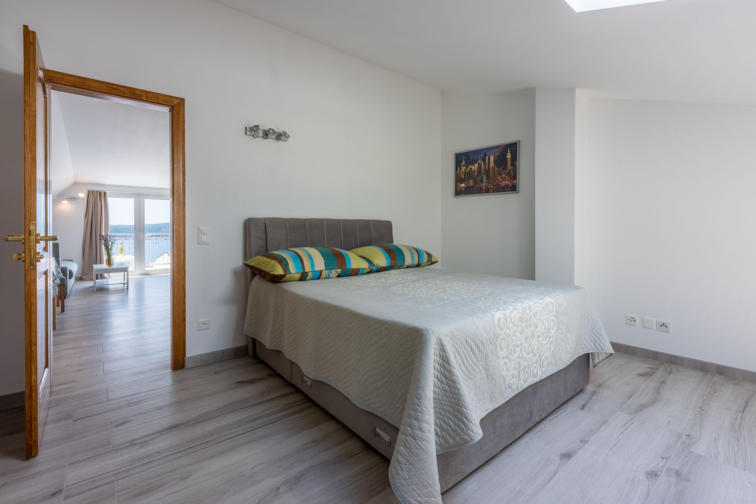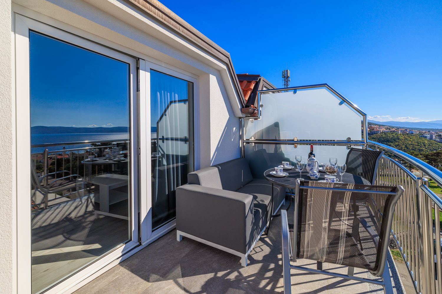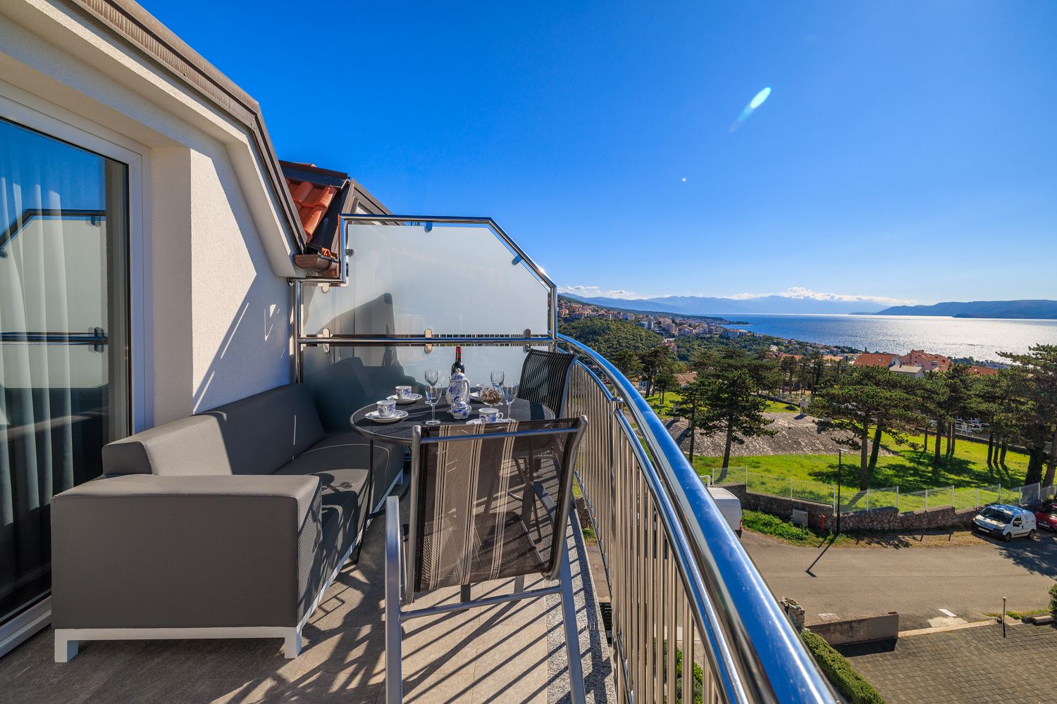 Die Wohnung liegt im dritten Obergeschoss und besteht aus einem geräumigen Wohn-/Esszimmer mit offener Küche, einem Schlafzimmer und einem Badezimmer. Vom Wohnbereich aus hat man direkten Zugang zu dem Balkon der Wohnung, der einen traumhaften Meerblick bietet. Ein privater Parkplatz befindet sich auf dem Grundstück des Hauses und kann kostenfrei genutzt werden. Vom Objekt bis zum Strand sind es 950 Meter und die Entfernung zum Zentrum beträgt 900 Meter. Das nächstgelegenste Lebensmittelgeschäft befindet sich 900 Meter von der Ferienimmobilie entfernt. In 900 Metern ist das umliegende Restaurant zu erreichen.