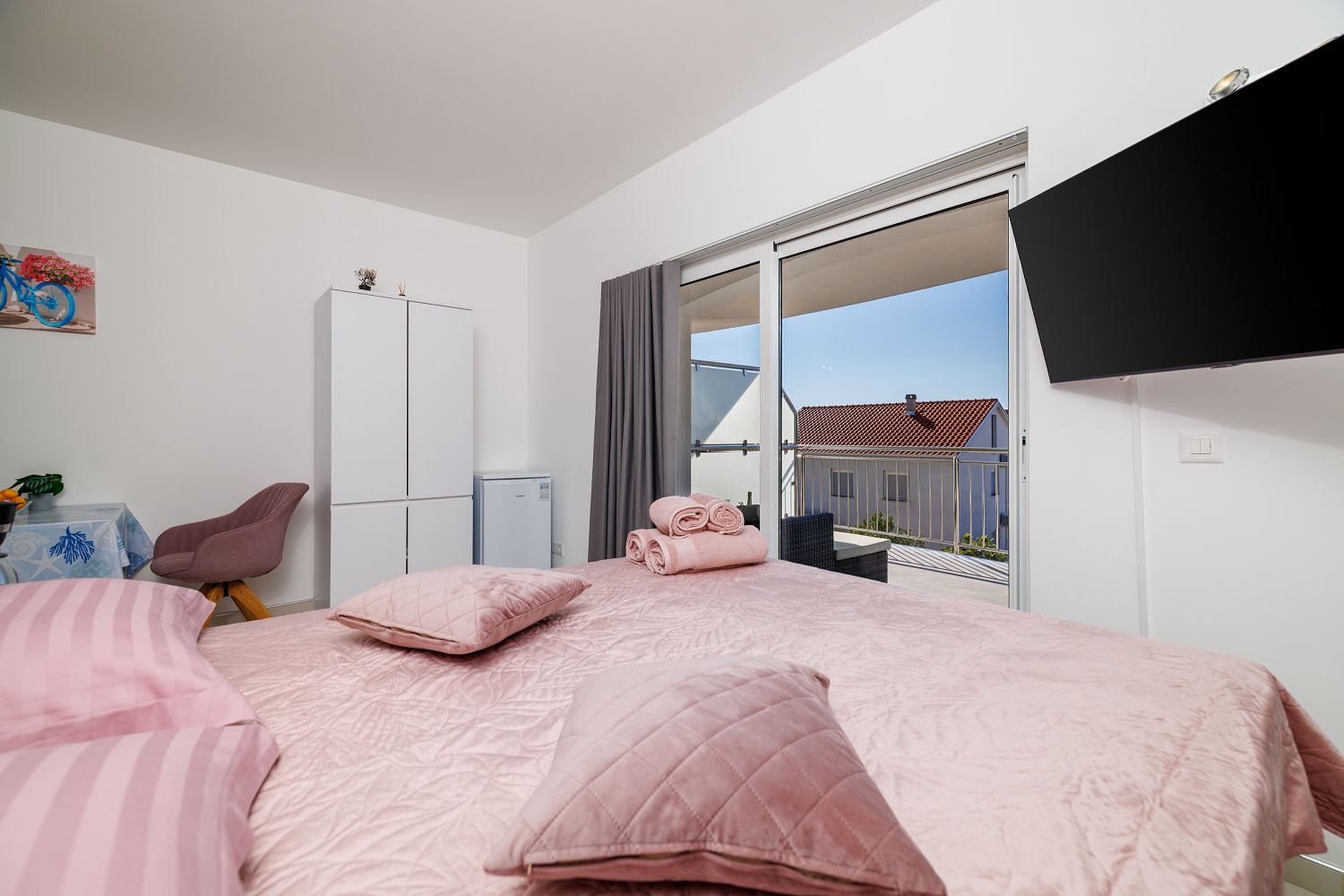 Diese moderne Ferienwohnung für bis zu zwei Personen befindet sich in ruhiger Lage oberhalb des Ortszentrums. Das Apartment liegt im ersten Obergeschoss und besteht aus einem geräumigen Wohn-/Esszimmer mit Küche und Schlafbereich im selben Raum, einem Badezimmer und einem Balkon. Eine Klimaanlage sorgt für eine angenehme Raumtemperatur. Vom Wohnbereich aus hat man direkten Zugang zum überdachten Balkon dieser Wohnung. Ein privater Parkplatz befindet sich auf dem Grundstück des Hauses und steht kostenfrei zur Verfügung.