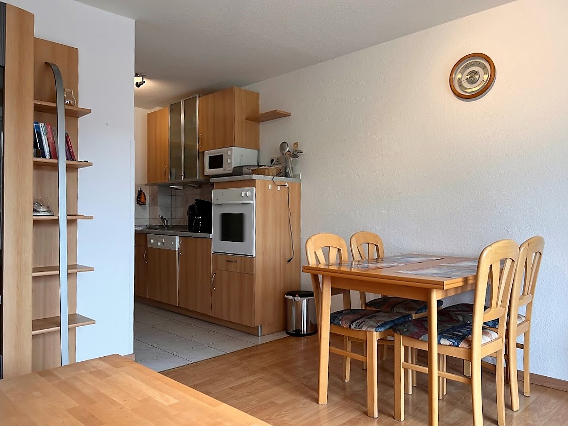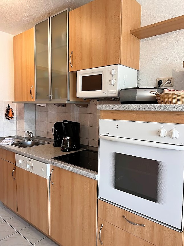 Die Wohnung besteht aus einem geräumigen Wohnzimmer mit bequemer Sitzecke, einem Esstisch für vier Personen und einem Flachbildfernseher. Die angrenzende Küche ist vollständig ausgestattet und bietet alles, was man zum Kochen und Essen benötigt, einschließlich Herd mit 4 Platten, Backofen, Kühlschrank, Mikrowelle, Geschirrspüler, Toaster, Wasserkocher und Kaffeemaschine.