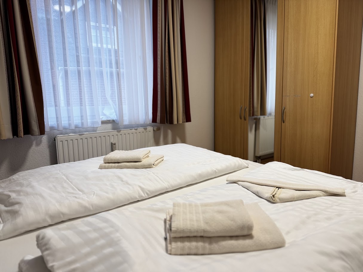 Das Schlafzimmer ist mit einem bequemen Doppelbett und einem großen Kleiderschrank ausgestattet. Im zweiten Schlafzimmer befinden sich ebenfalls ein Doppeltbett und ein weiterer Kleiderschrank. Das Badezimmer verfügt über eine Dusche, ein WC und ein Waschbecken.