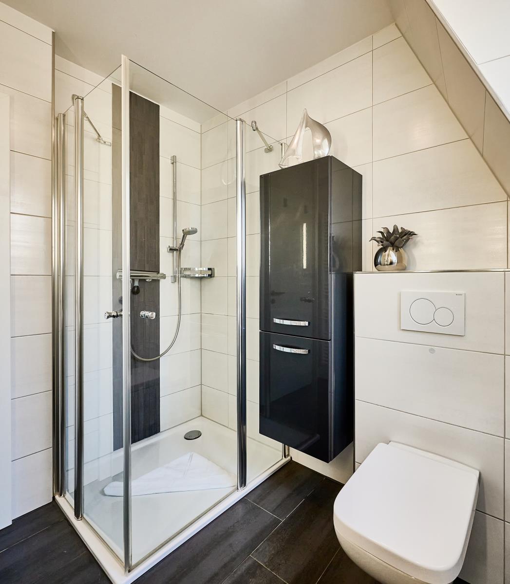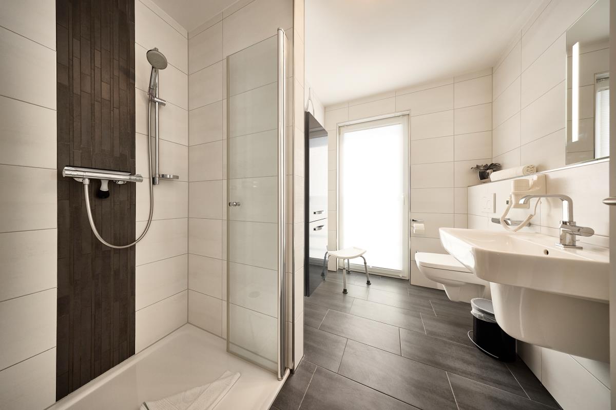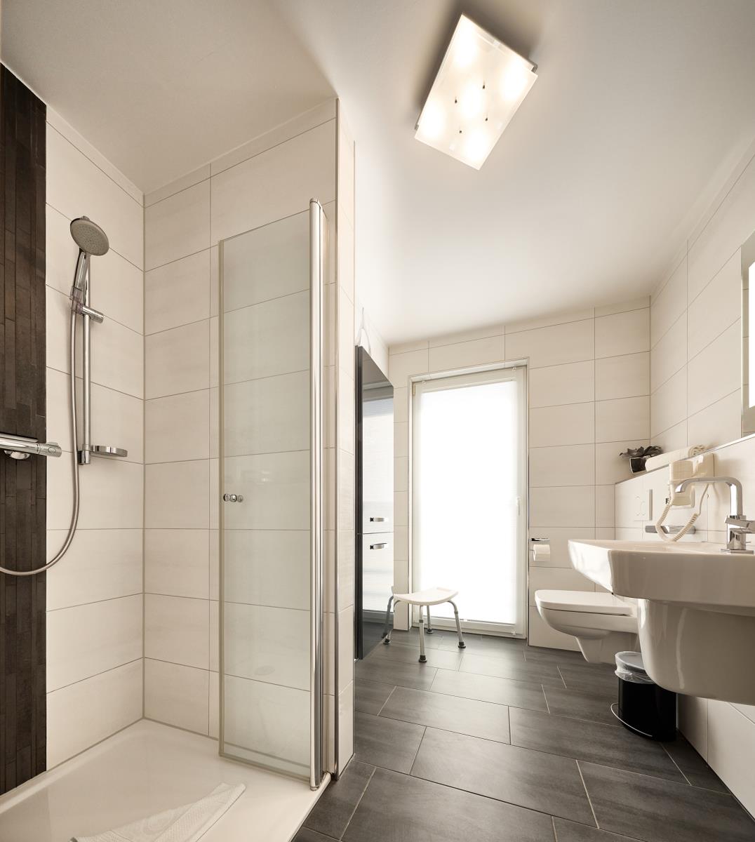 Die Wohnung verfügt über zwei moderne Badezimmer, jeweils ausgestattet mit: • 1,00 m großer Dusche • WC • Waschtisch • beleuchtetem Spiegel • Schrank • Handtuchtrockner • Fußbodenheizung • Badhocker • Fön • Kosmetikspiegel • Radio