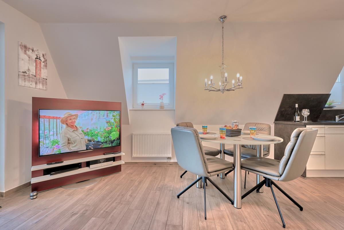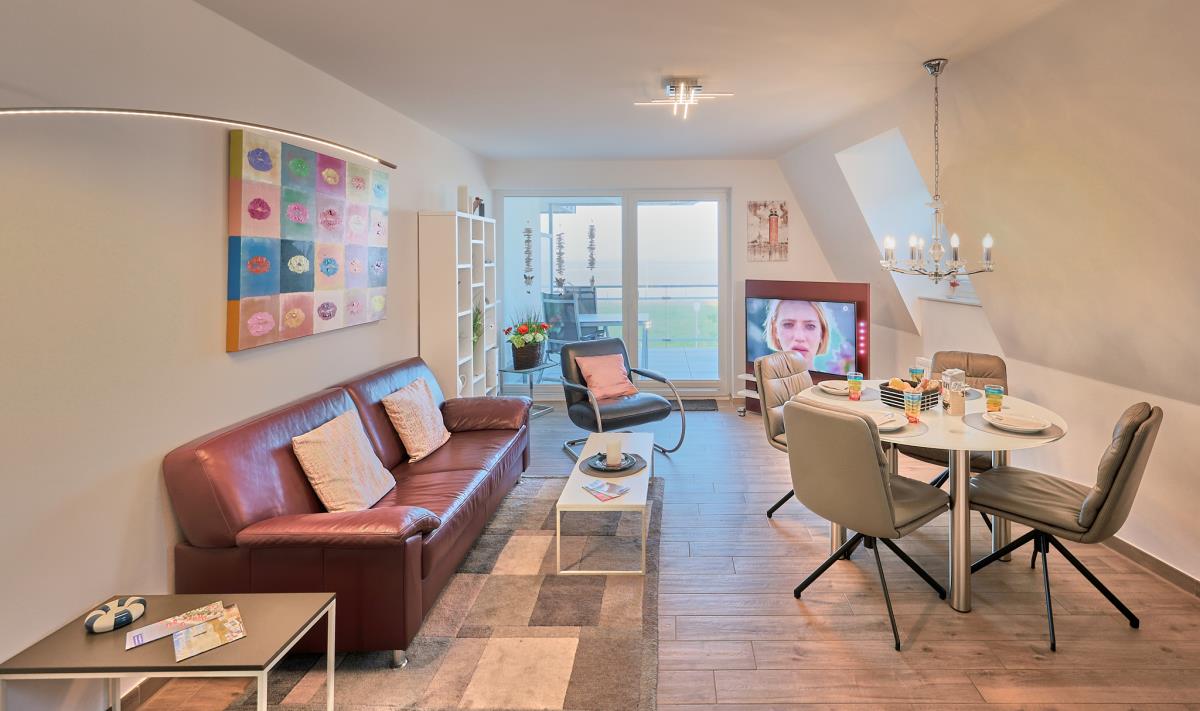 Der helle Wohnbereich bietet direkten Balkonzugang und einen traumhaften Blick auf die Nordsee. Zur Ausstattung gehören eine 3‑Sitzer‑Couch, zwei Sessel, ein Couchtisch, eine Regalwand, ein TV‑Board mit Flachbild‑TV, Blu‑ray/DVD‑Player sowie ein Radio mit CD‑Funktion. Der Esstisch mit vier Stühlen und die vollständig ausgestattete Küchenzeile machen den Wohnraum zum perfekten Mittelpunkt für gemeinsame Stunden.
