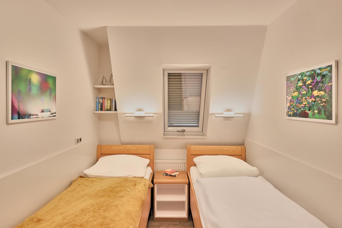 Die beiden Schlafzimmer sind komfortabel eingerichtet: • Schlafzimmer 1: Zugang zum Südbalkon, Doppelbett, zwei Bettkonsolen, Kleiderschrank, Stuhl, TV und Radio. • Schlafzimmer 2: Zwei Einzelbetten, Schrank, Stuhl, Sekretär, TV und Radio.