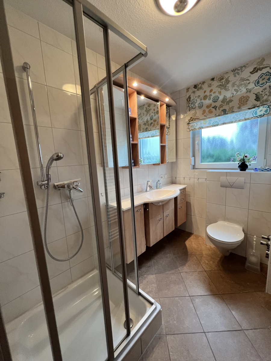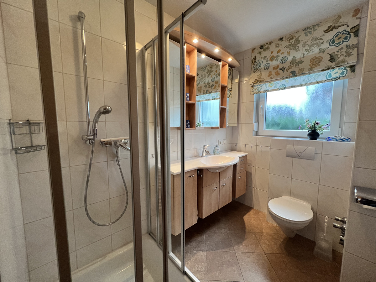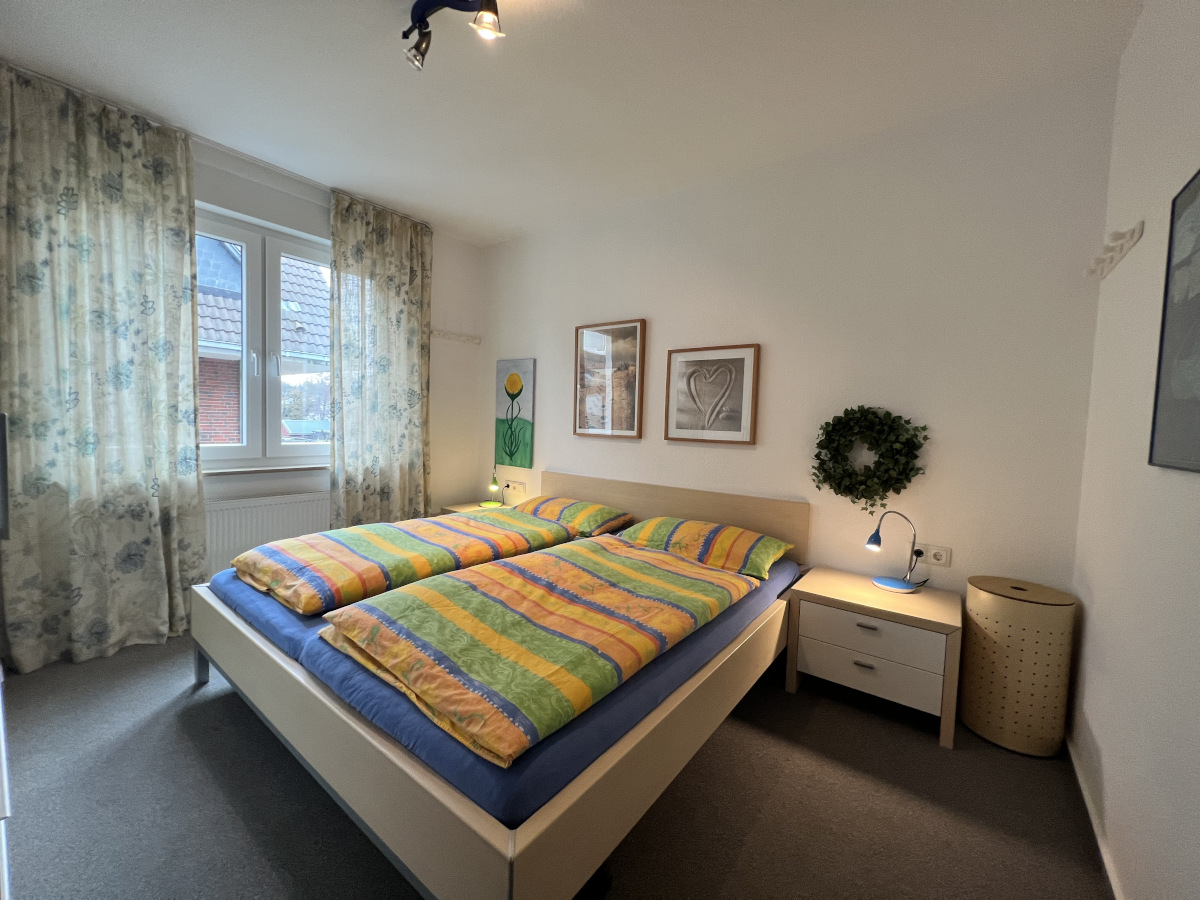 Das Schlafzimmer ist mit einem komfortablen Doppelbett (180 x 200 cm) ausgestattet und bietet viel Ruhe für erholsame Nächte. Das Duschbad ist praktisch und funktional gestaltet.