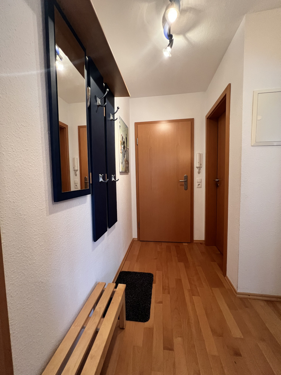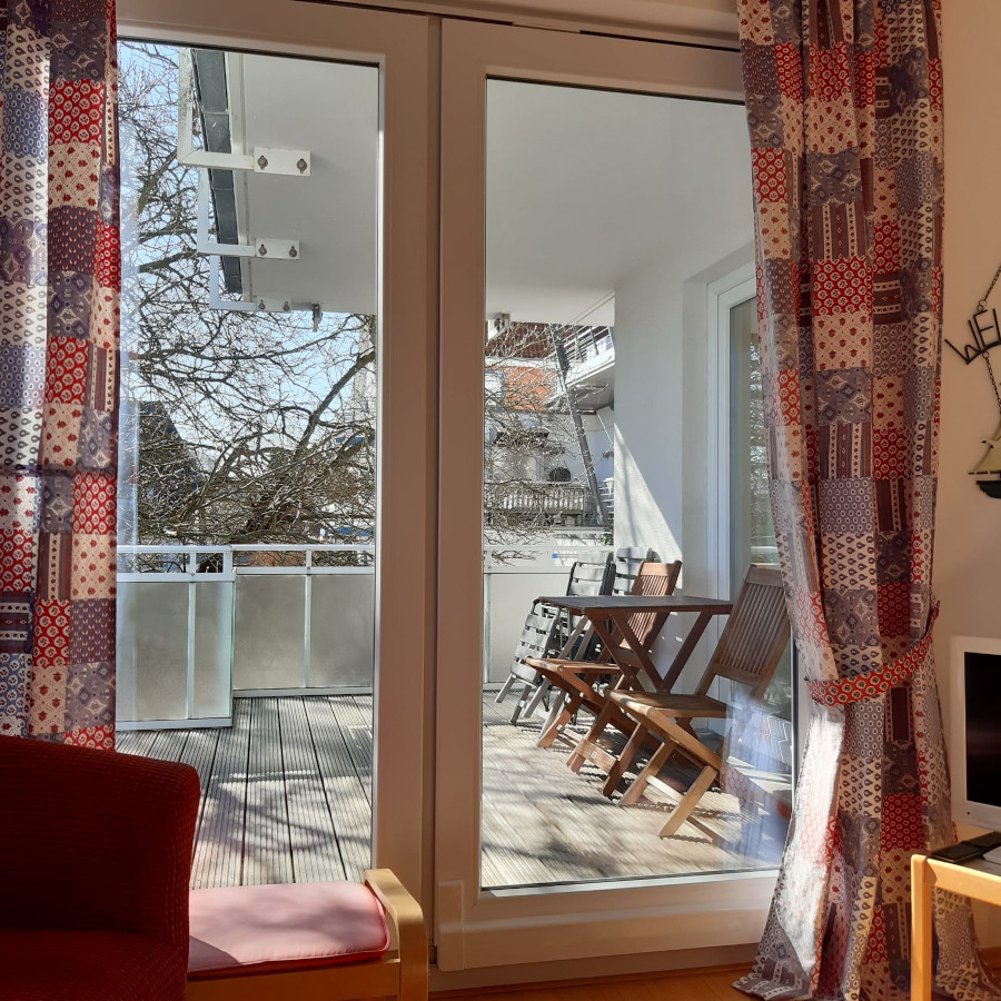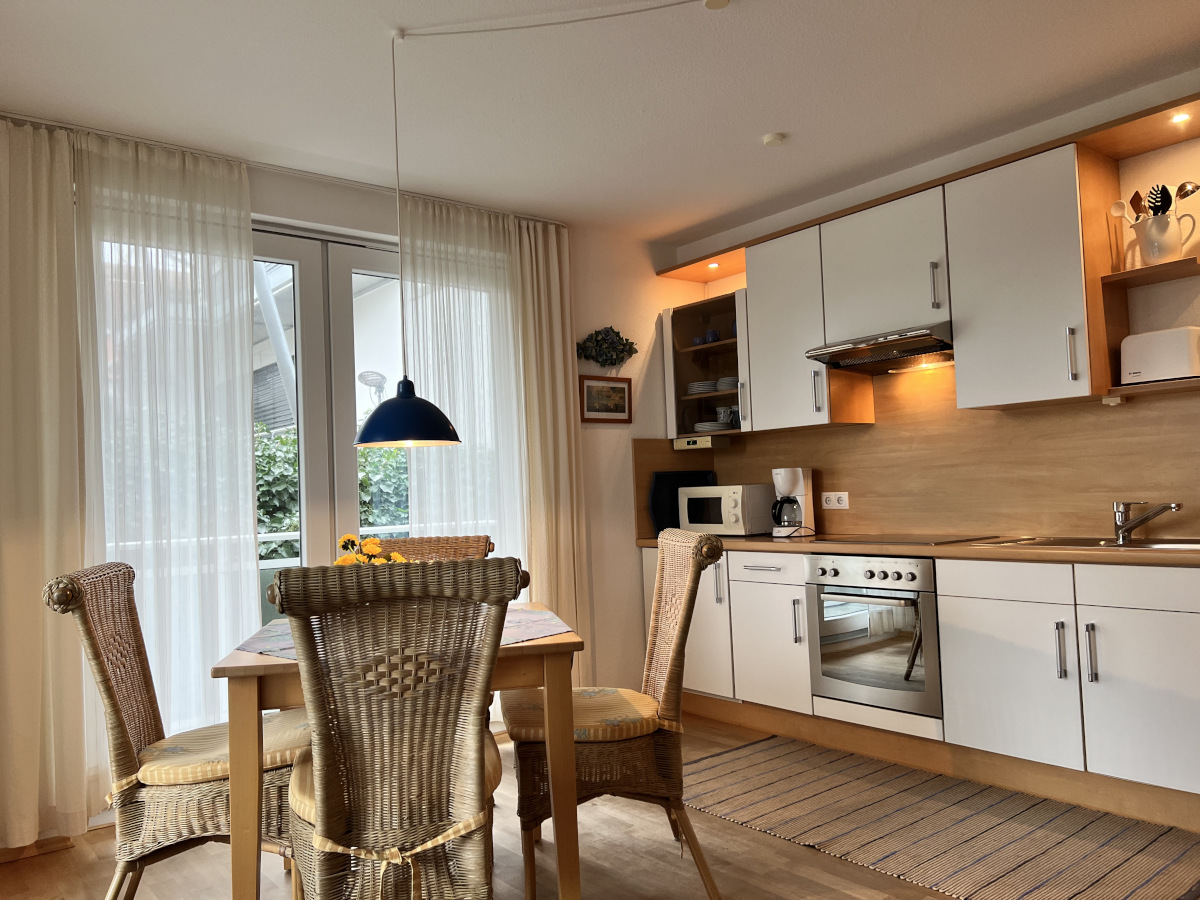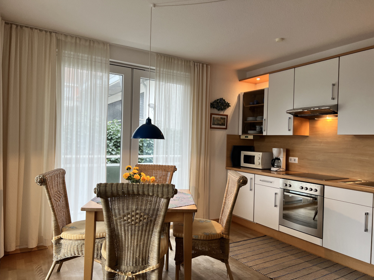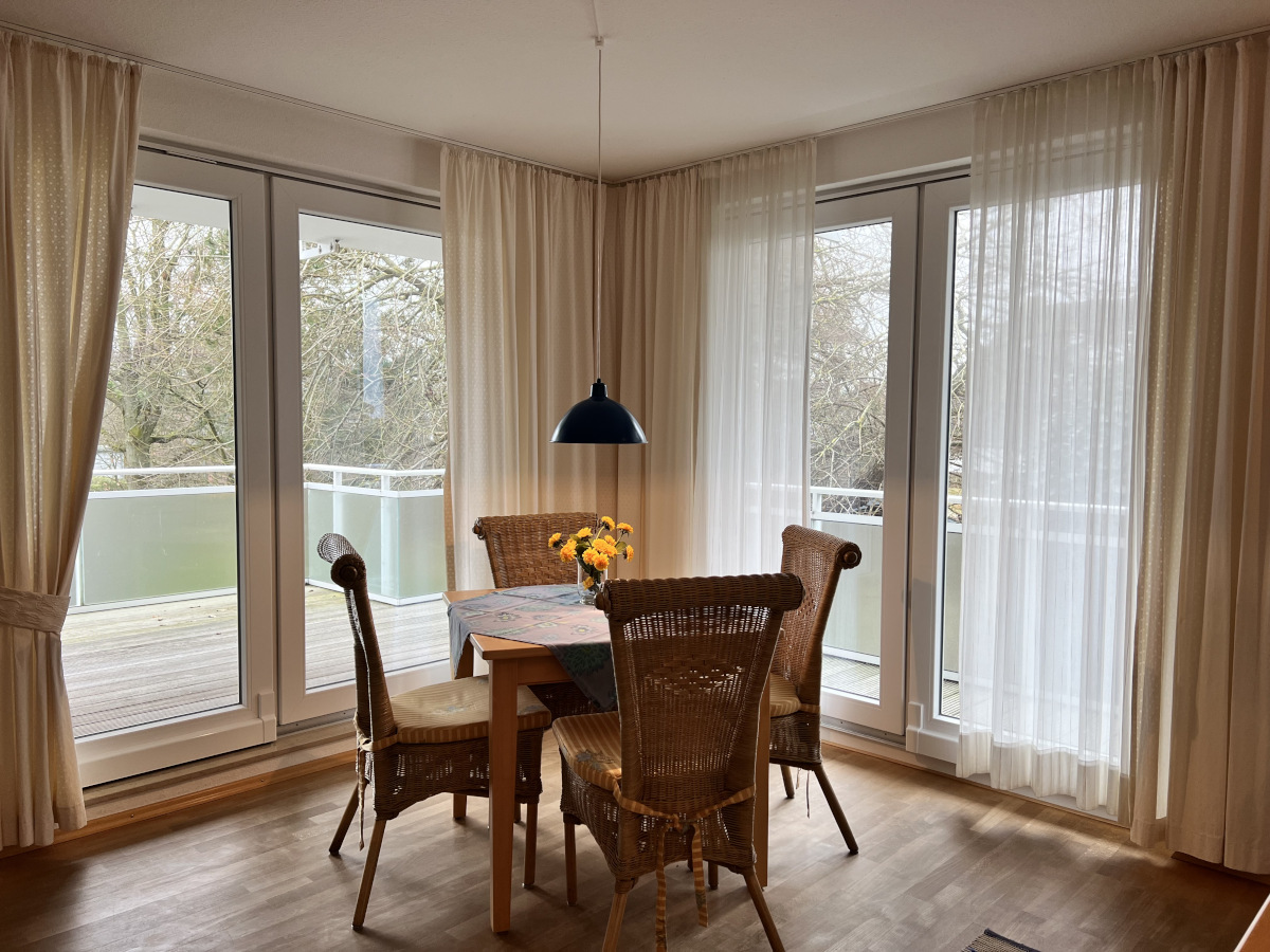 Der Wohn‑ und Essbereich ist offen mit der hell gestalteten Küche verbunden und schafft eine angenehme, luftige Atmosphäre. Von hier aus gelangen Sie direkt auf den großzügigen Balkon, der viel Platz zum Entspannen bietet. Ein besonderes Highlight: Von diesem Balkon aus können Sie sogar einen Blick auf das Meer genießen – perfekt für einen Kaffee am Morgen oder einen entspannten Abend an der frischen Nordseeluft.