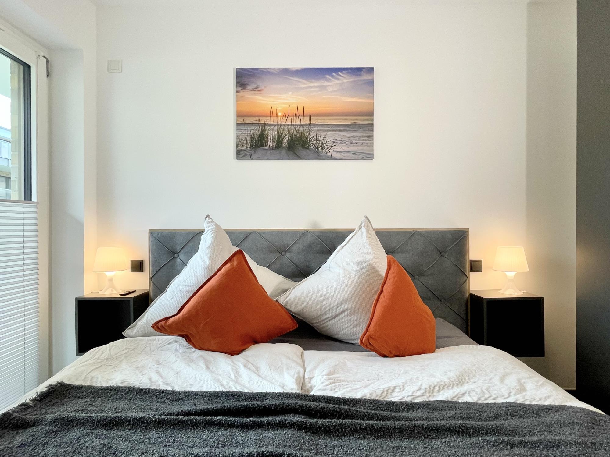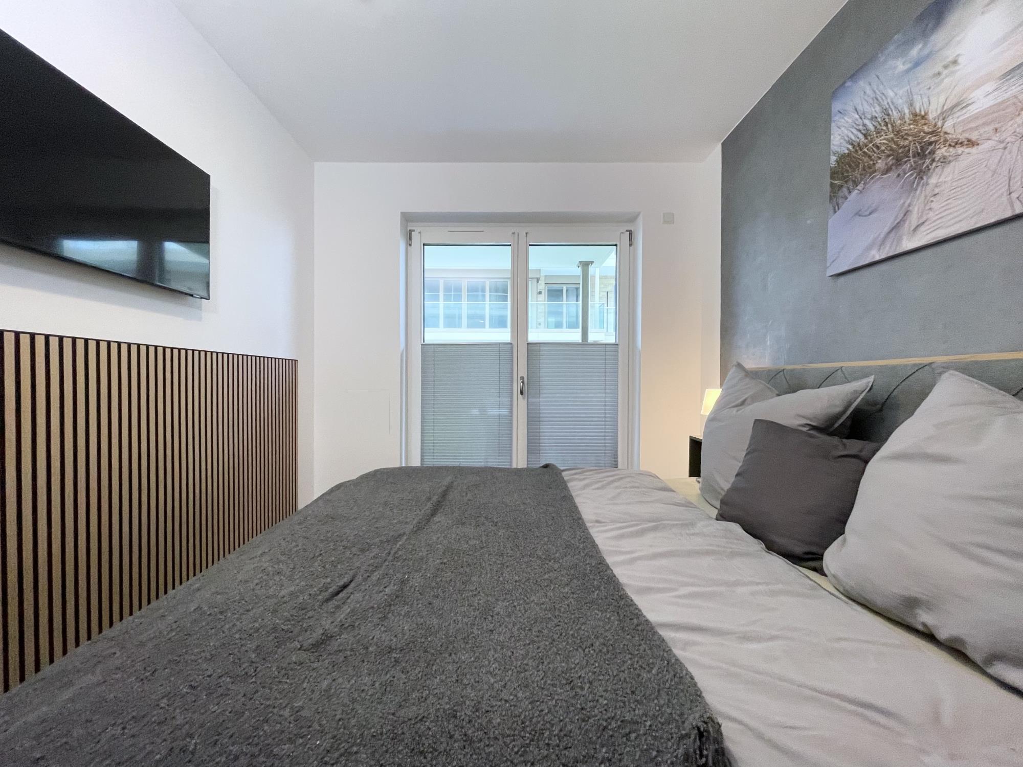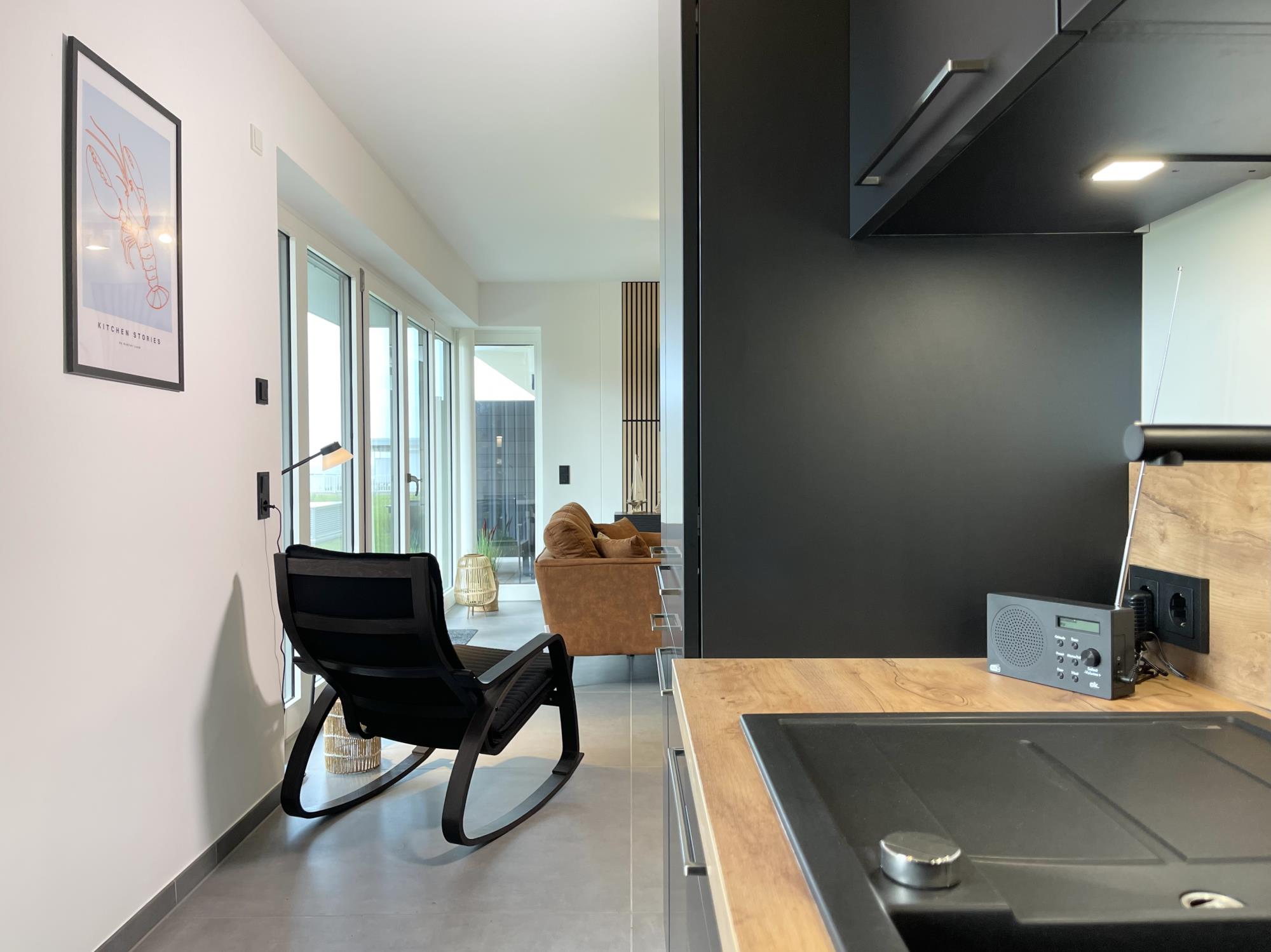 Der moderne und top-ausgestattete offene Küchenbereich ist clever in den Ess- & Wohnbereich integriert. Von hier aus sind das Bad, mit bodengleicher Dusche, die Saunaräumlichkeit (Infrarotsauna), zwei Schlafzimmer und die Terrasse zugänglich, von der es einen herrlichen Ausblick bis zur Nordsee gibt.