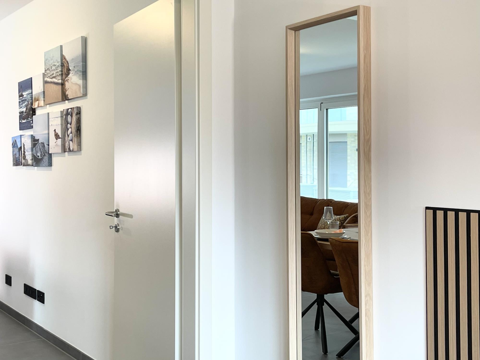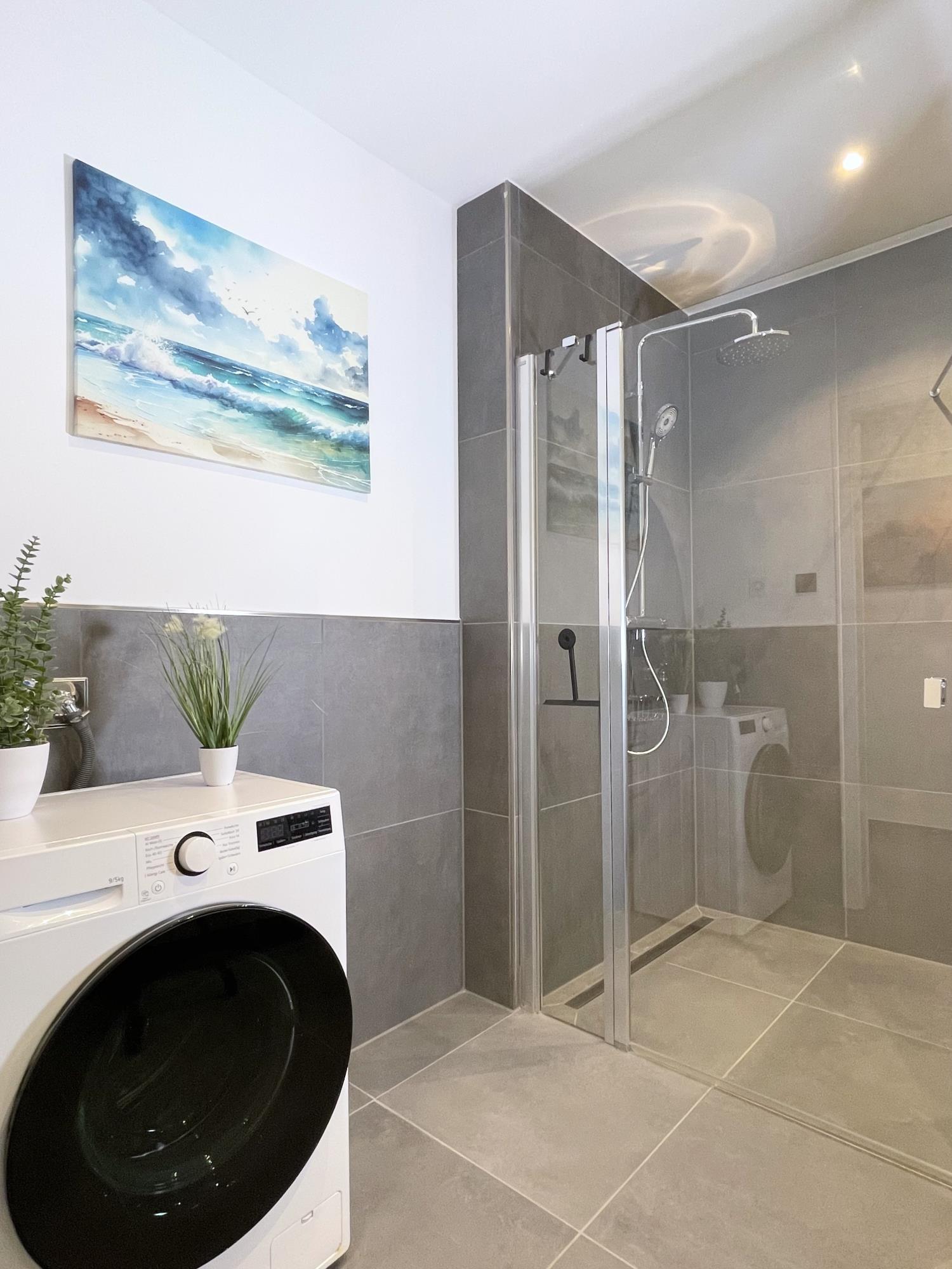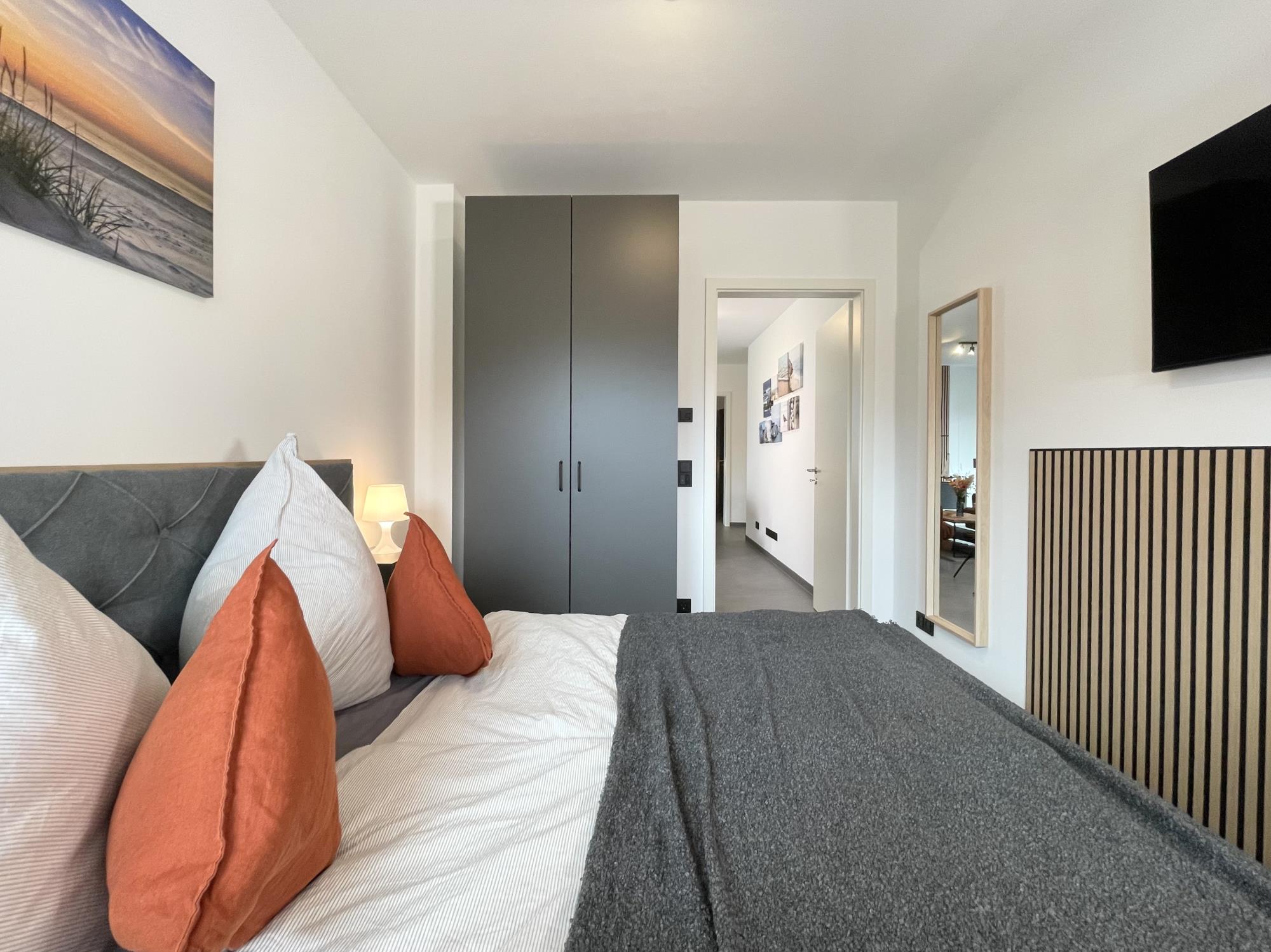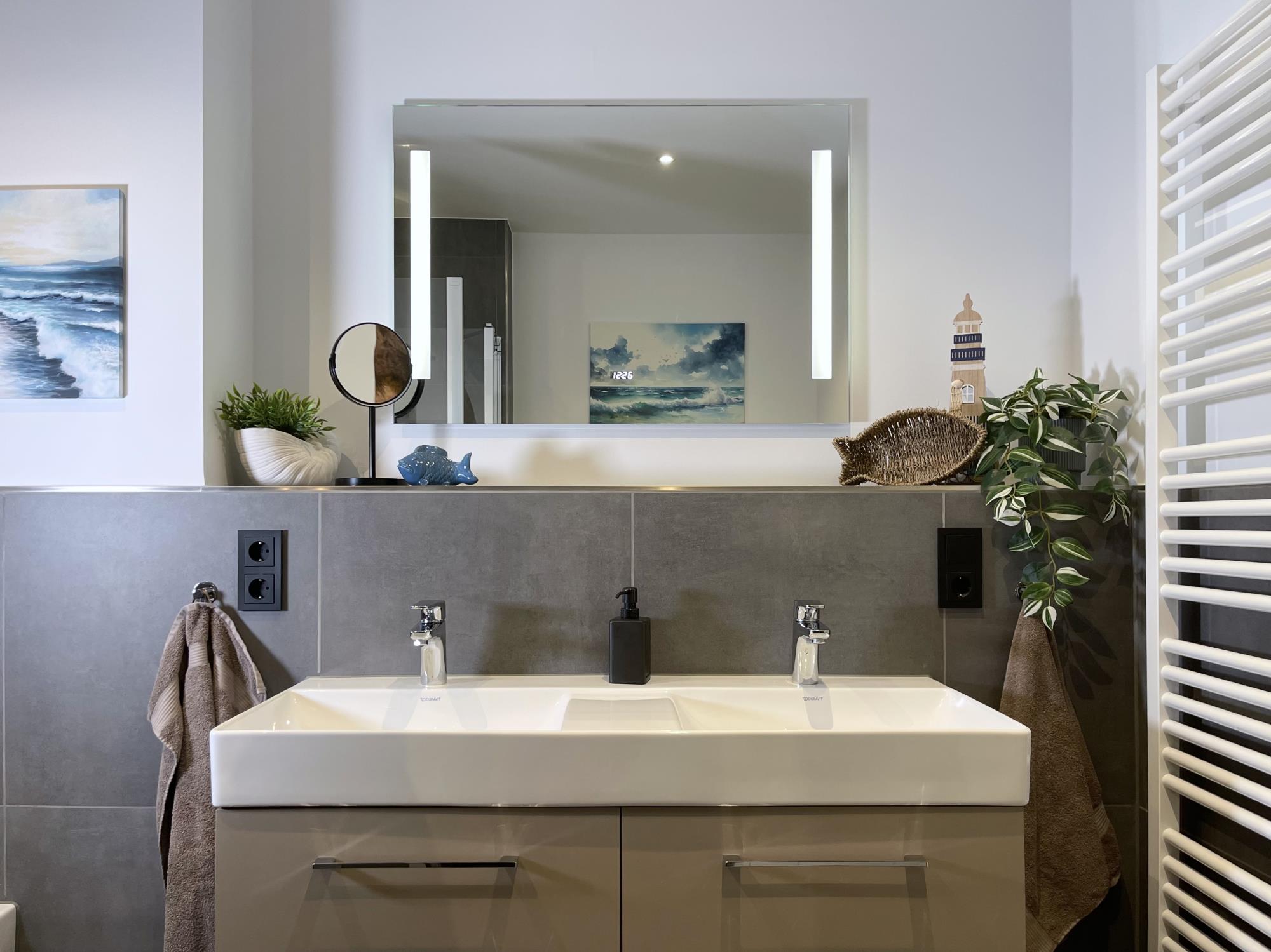 Der moderne und top-ausgestattete offene Küchenbereich ist clever in den Ess- & Wohnbereich integriert. Von hier aus sind das Bad, mit bodengleicher Dusche, die Saunaräumlichkeit (Infrarotsauna), zwei Schlafzimmer und die Terrasse zugänglich, von der es einen herrlichen Ausblick bis zur Nordsee gibt.