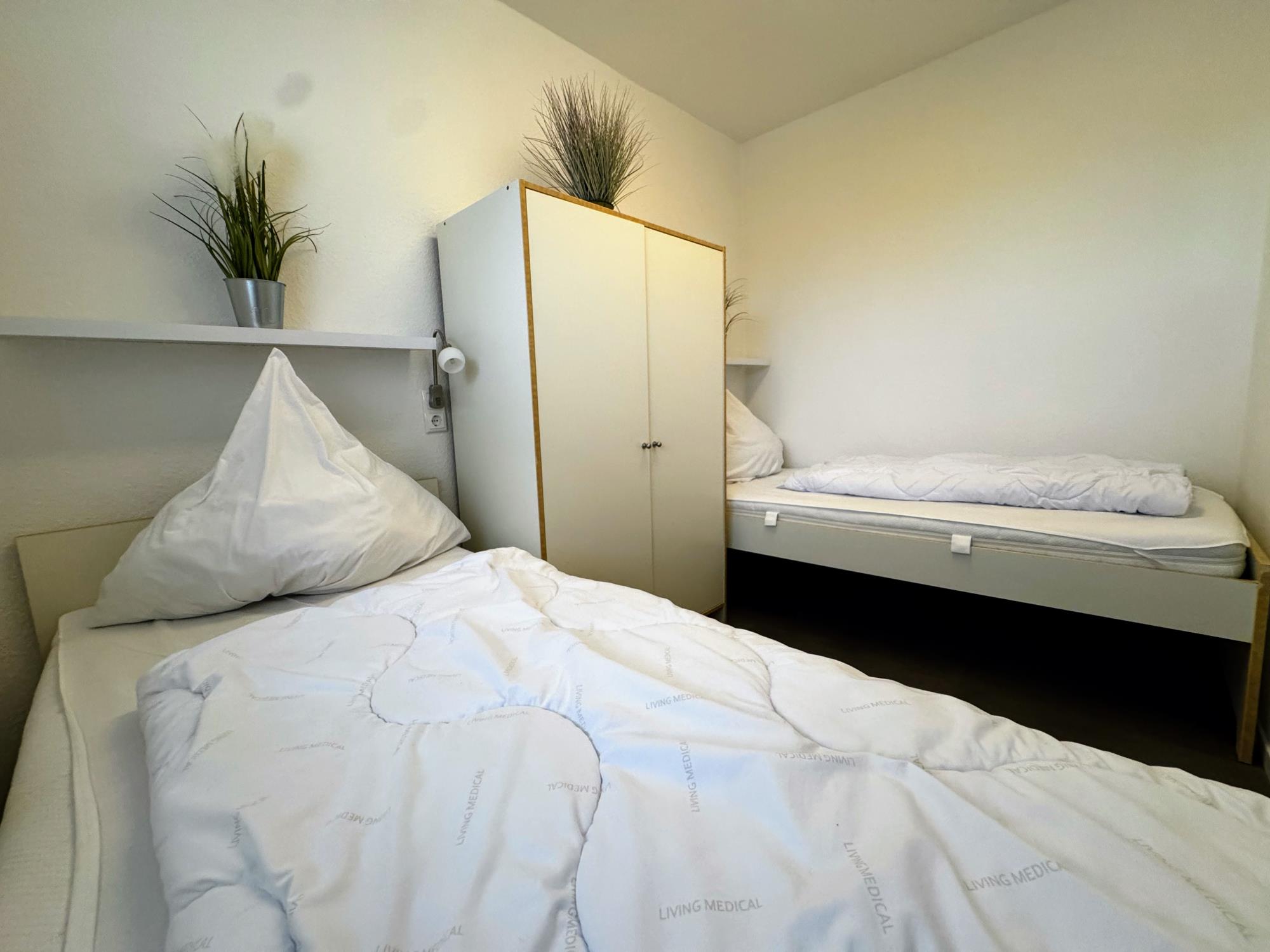 Der separate Schlafbereich ist mit zwei Einzelbetten, einem Kleiderschrank und Außenjalousien ausgestattet – perfekt für erholsame Nächte nach einem Tag am Meer.