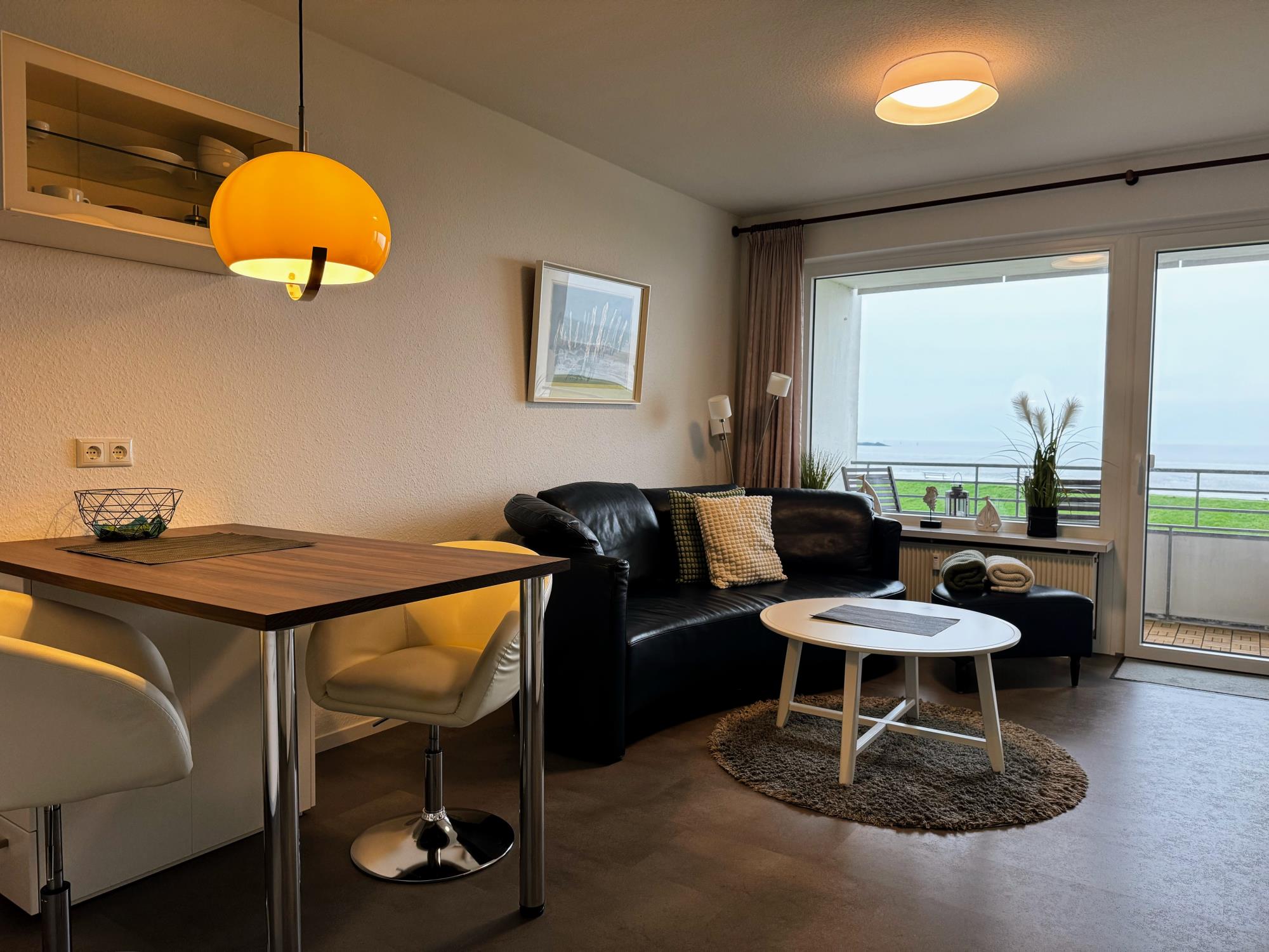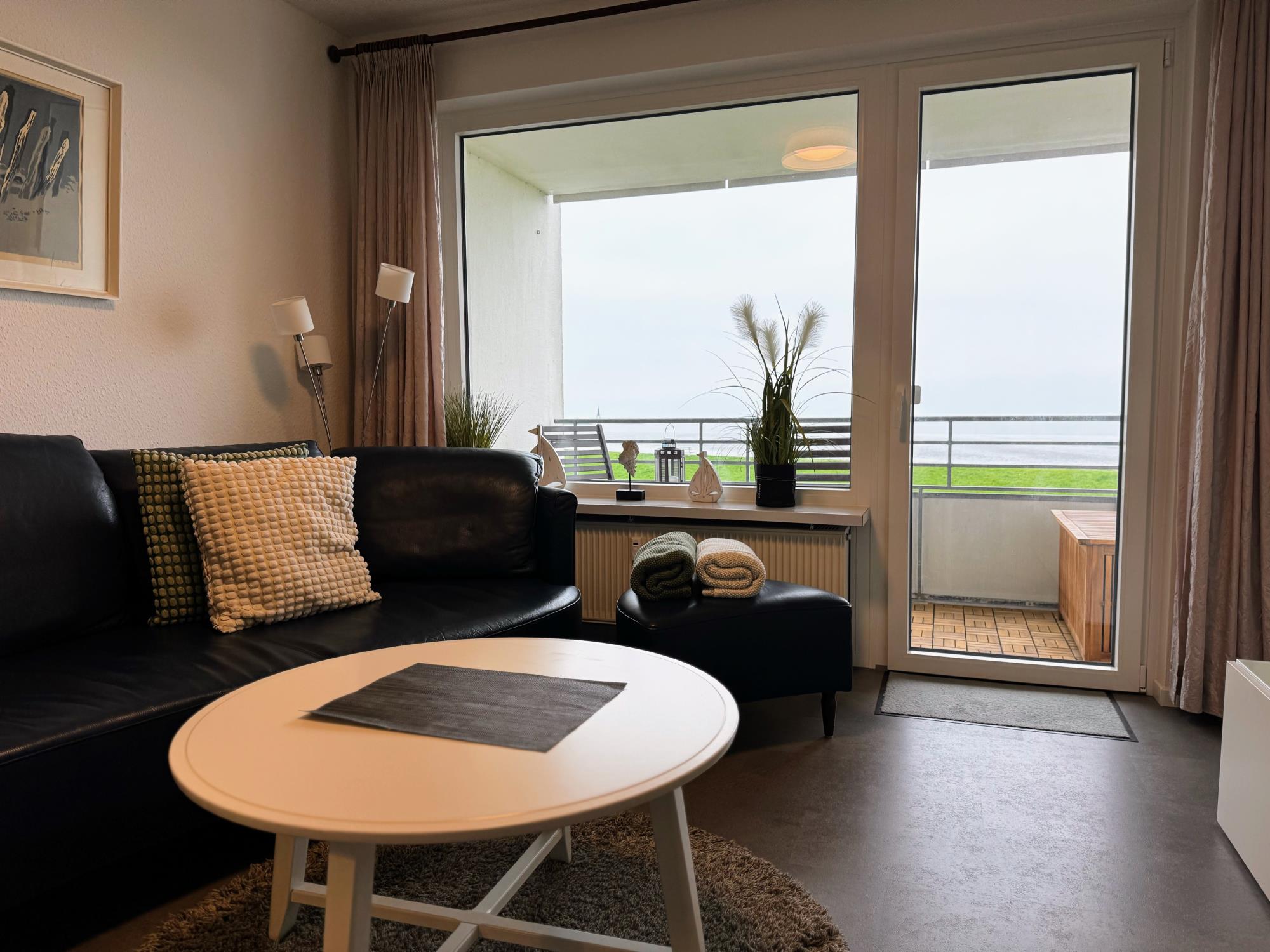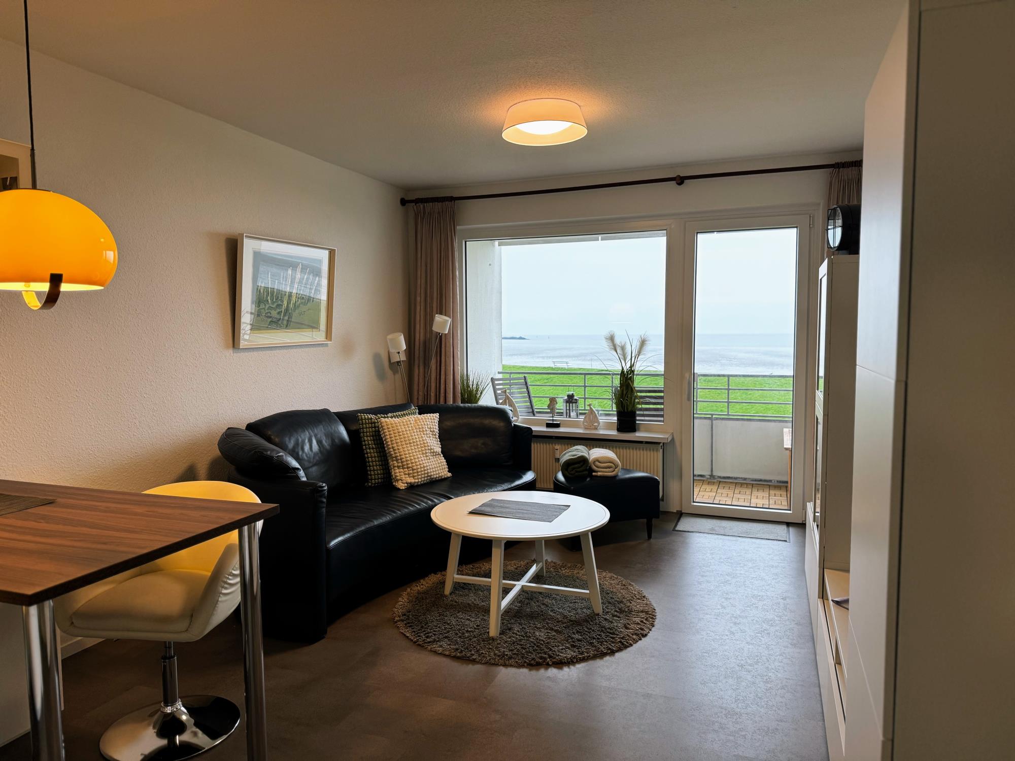 Mit dem Fahrstuhl erreichen Sie Ihre Wohnung ganz bequem. Der helle Wohnbereich bietet eine gemütliche Couch, einen modernen SMART-TV und natürlich schnelles Gigabit-WLAN. In der offenen Wohnküche finden Sie alles, was Sie brauchen – von der Geschirrspülmaschine bis zur Backofen-Mikrowellen-Kombi. Vom Balkon aus genießen Sie bei einer Tasse Kaffee oder einem Glas Wein den wunderbaren Blick auf Elbe und Nordsee – maritimes Urlaubsgefühl inklusive.