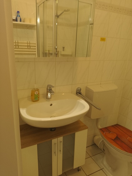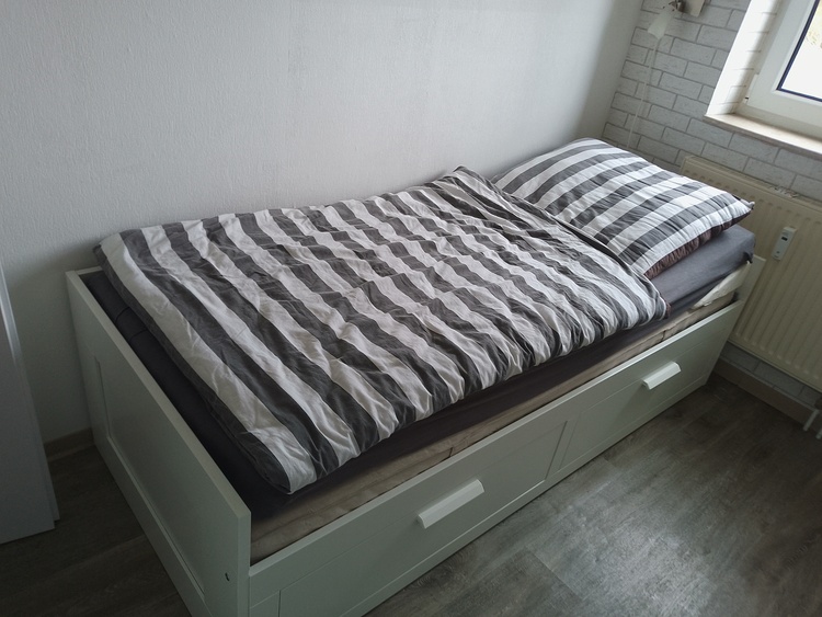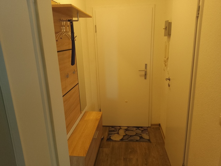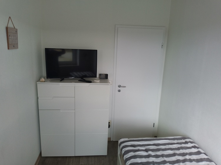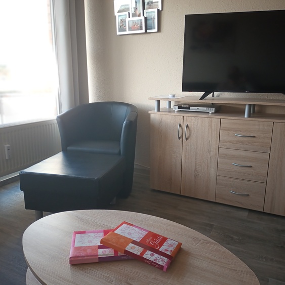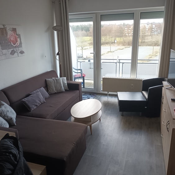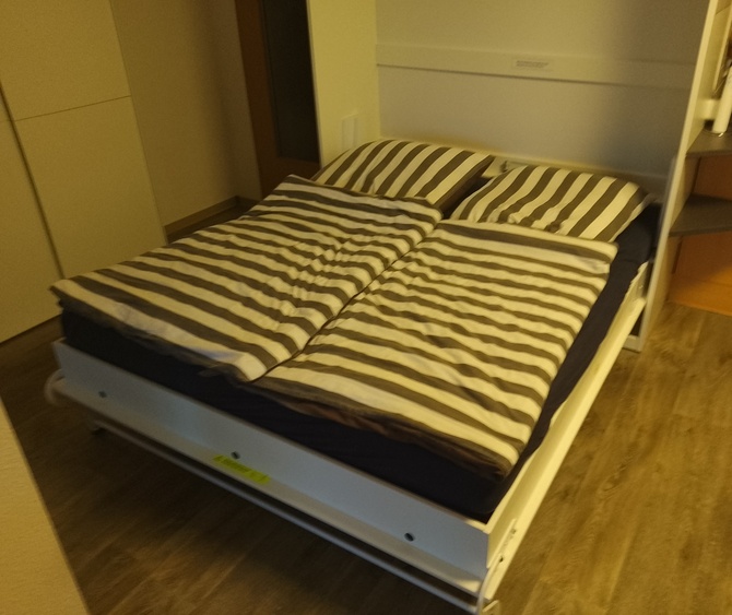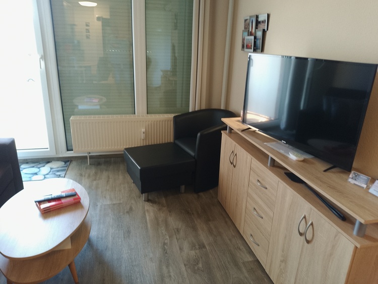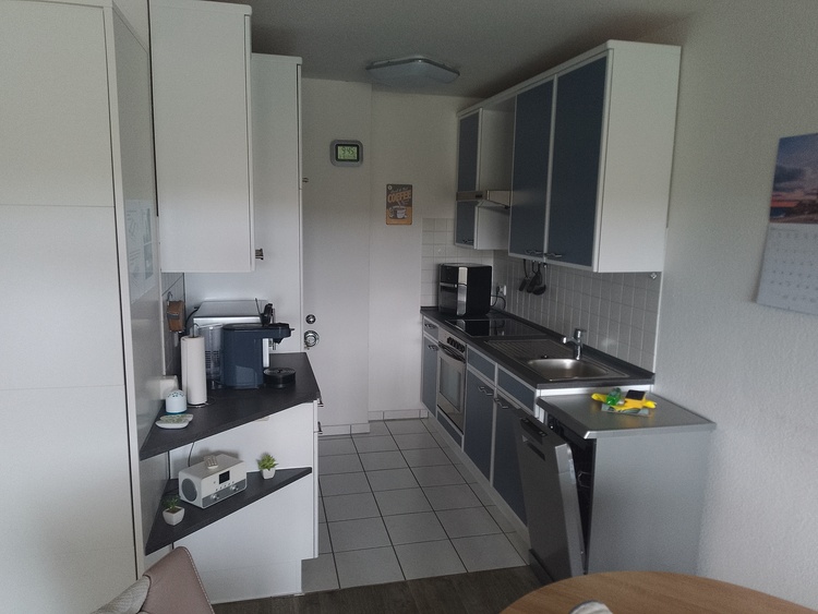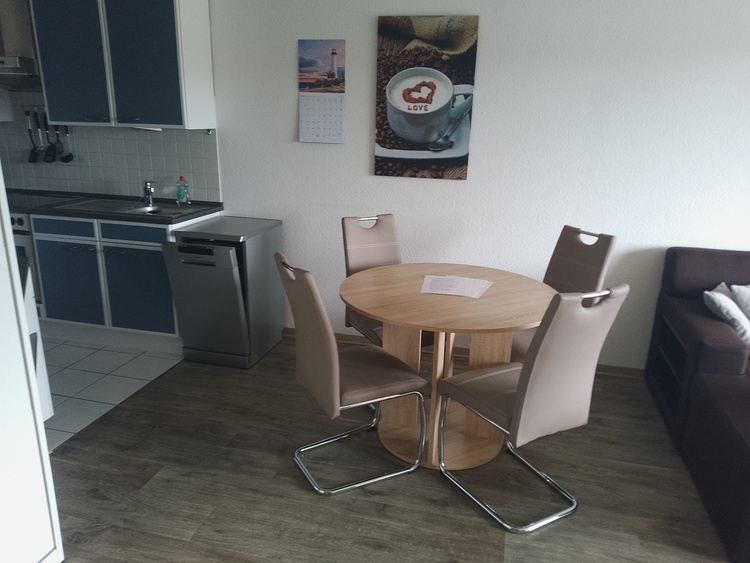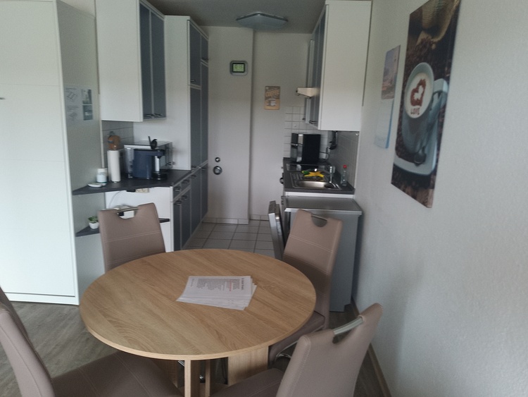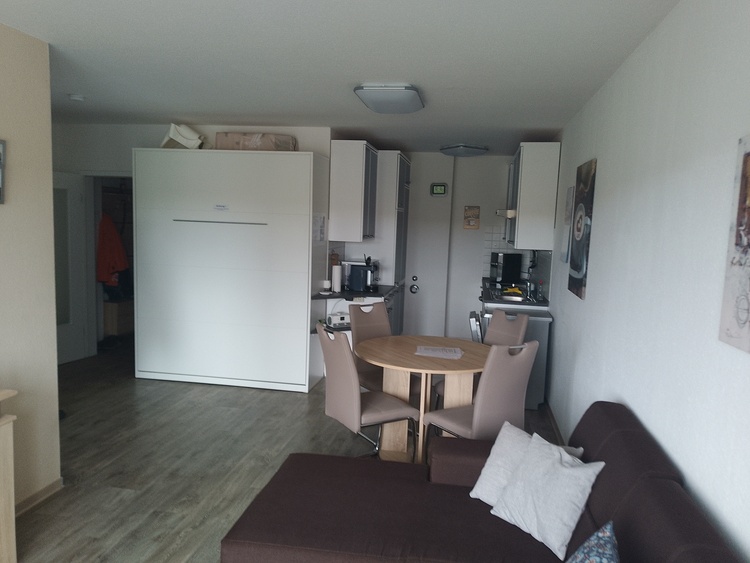 Die Wohnung verfügt über einen gemütlichen Wohn- und Essbereich mit einem Schrankbett, einer bequemen Schlafcouch, einem Flachbildfernseher und einem Esstisch für 4 Personen. Die offene Küche ist vollständig ausgestattet mit einem Ceranfeld, einem Backofen, einem Kühlschrank mit Gefrierfach, einer Spülmaschine und einer Mikrowelle.