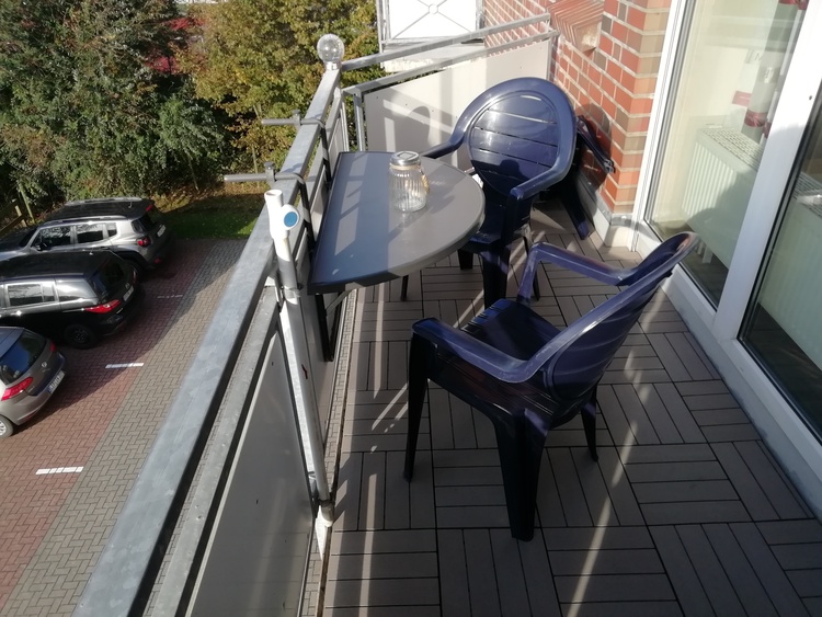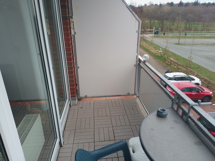 Vom Wohnzimmer aus gelangt man auf den Balkon, auf dem man den Blick auf die Umgebung genießen kann.