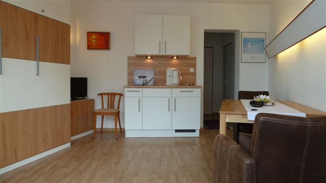 Die Einraum‑Ferienwohnung 306 im Haus Seehütte im Wehrbergsweg 34 in Cuxhaven‑Duhnen befindet sich in der 3. Etage und bietet Ihnen einen freundlichen, hellen Wohnschlafraum mit einem komfortablen Schrankbett (180 x 200 cm), das besten Schlafkomfort garantiert und sich tagsüber platzsparend verstauen lässt. Eine gemütliche Sitzgelegenheit lädt zu entspannten Abenden oder einem gemütlichen Frühstück ein. Die moderne Küchenzeile ist praktisch ausgestattet und ideal für Gäste, die sich im Urlaub gern selbst versorgen möchten.