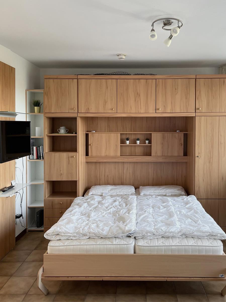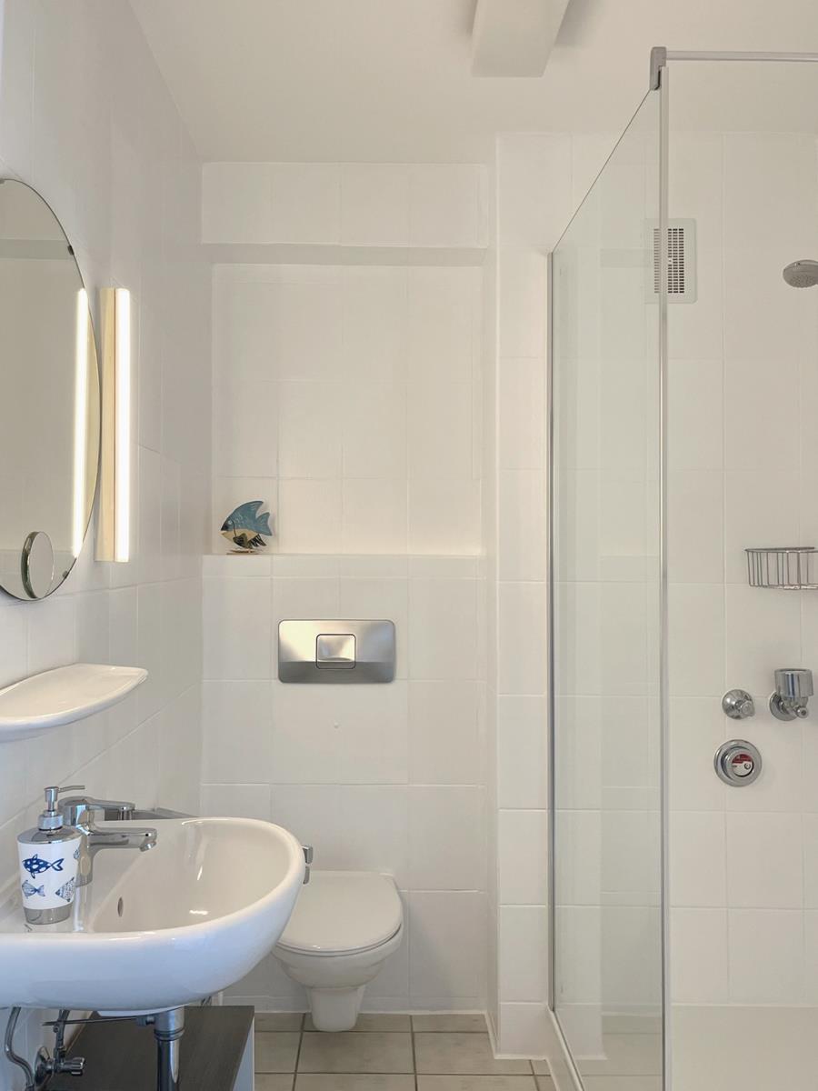 Der Wohn‑ und Schlafbereich ist mit einem praktischen Schrank‑Doppelbett ausgestattet und schafft eine gemütliche Atmosphäre zum Entspannen. Die Küchenzeile verfügt über einen E‑Herd, Backofen, Kühlschrank mit Gefrierfach, Spüle und Dunstabzugshaube – perfekt für die Zubereitung kleiner Mahlzeiten. Das Badezimmer bietet eine großzügige Dusche, die nach einem Tag am Strand oder im Watt für wohltuende Erholung sorgt.
