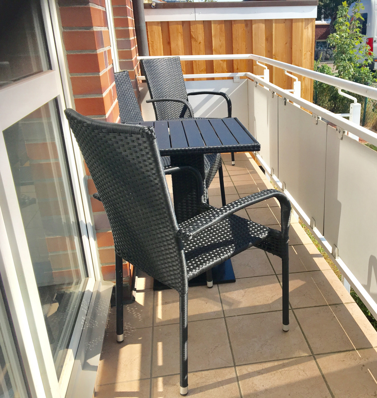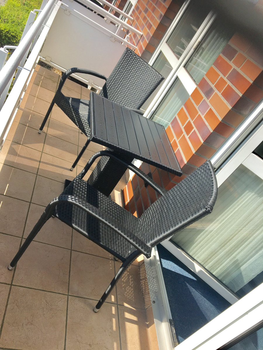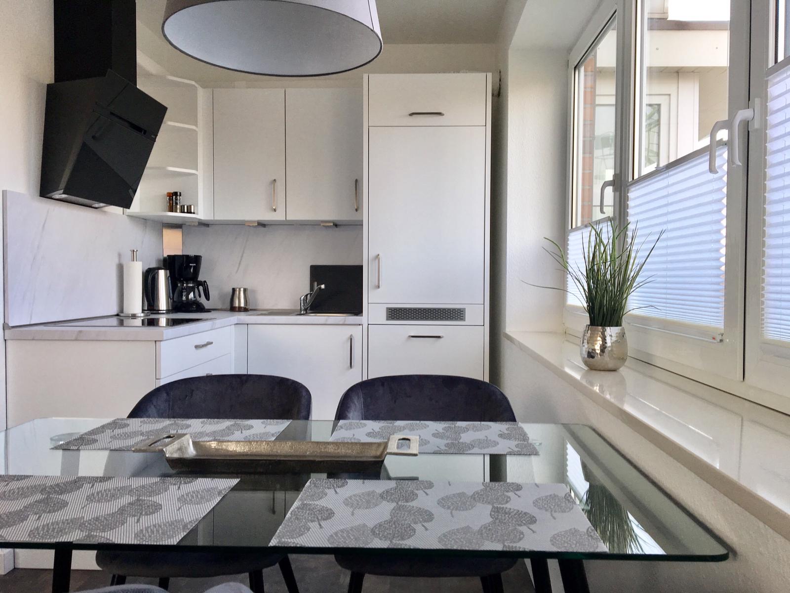 Die moderne Küchenzeile verfügt über ein Cerankochfeld mit vier Platten, einen großen Kühlschrank mit Gefrierfach, eine Spülmaschine und alle wichtigen Kochutensilien, sodass Sie Ihre Mahlzeiten bequem selbst zubereiten können. Ein besonderes Highlight ist der Balkon, der sowohl vom Schlafzimmer als auch vom Wohn‑ und Essbereich zugänglich ist. Hier genießen Sie entspannte Stunden im Freien und den Blick über die ruhige Umgebung.