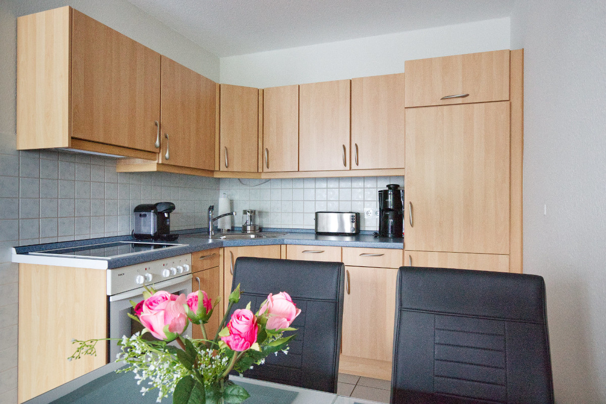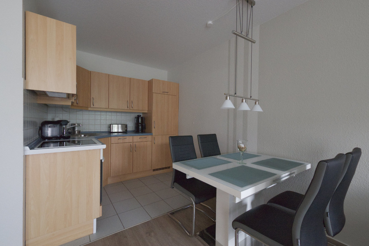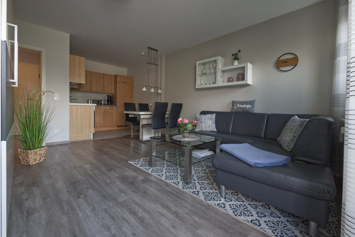 Der offene Wohn- und Essbereich lädt zum Wohlfühlen ein und bietet einen Esstisch mit vier Stühlen, ein bequemes Sofa sowie ein praktisches Doppel-Schrankbett, das zusätzlichen Schlafplatz für Gäste schafft. Ein TV-Gerät im Wohnbereich sorgt auch an regnerischen Tagen für Unterhaltung. Die moderne Küchenzeile ist vollständig ausgestattet und bietet ein vier Platten-Cerankochfeld, Mikrowelle, Wasserkocher, Toaster, Kaffeemaschine, einen großen Kühlschrank mit Gefrierfach sowie einen Backofen – ideal, um im Urlaub leckere Mahlzeiten zuzubereiten.