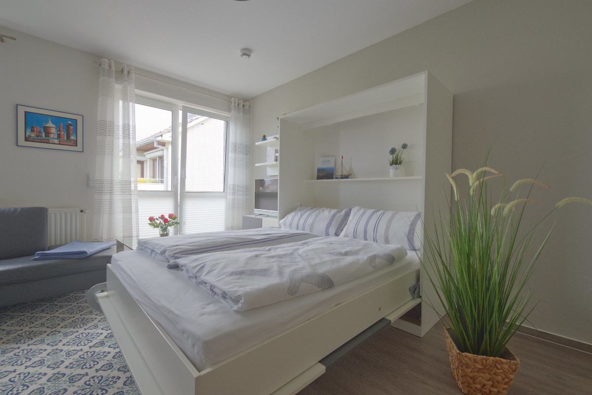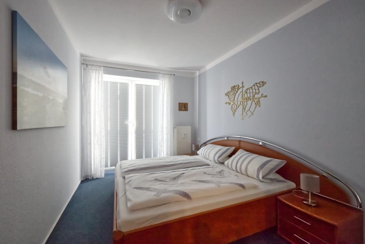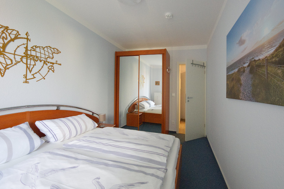 Die Ferienwohnung 9 in der Villa Döser Strand, Mühlentrift 36 in 27476 Cuxhaven-Döse, ist eine charmante und komfortabel ausgestattete 2‑Zimmer‑Ferienwohnung, die sich ideal für Paare, kleine Familien oder einen entspannten Nordseeurlaub zu zweit eignet. Das gemütliche Schlafzimmer verfügt über ein großzügiges Doppelbett (180 x 200 cm), zwei Nachtschränke, einen großen Kleiderschrank mit Schiebetüren – perfekt für erholsame Nächte und entspannte Stunden.