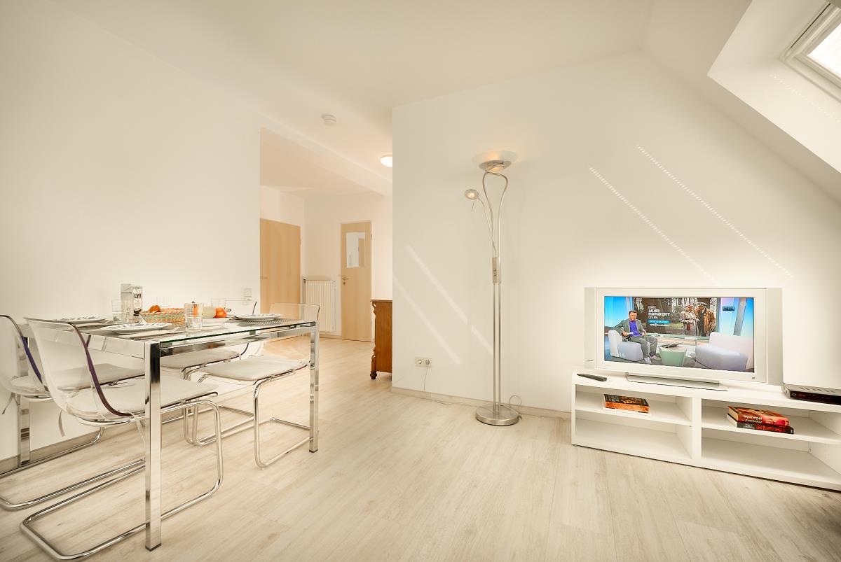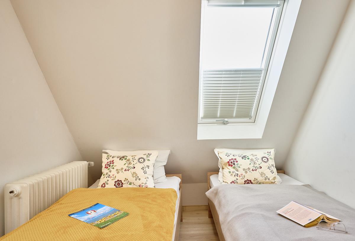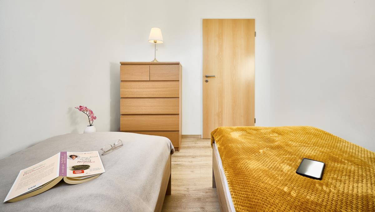 Die beiden Schlafzimmer sind komfortabel eingerichtet – eines davon mit direktem Zugang zum Duschbad, das durch das große Schlafzimmer erreichbar ist. Der Wohn‑Essbereich lädt zum Entspannen ein, sei es beim gemeinsamen Kochen, einem gemütlichen Frühstück oder einem ruhigen Abend nach einem Strandspaziergang. Die integrierte Küchenzeile bietet alles, was man für die Zubereitung kleiner und großer Mahlzeiten benötigt.