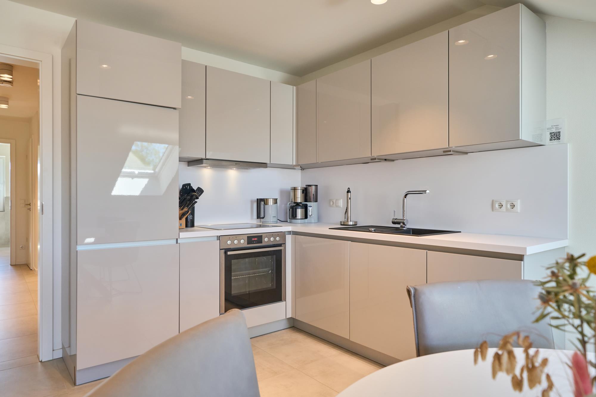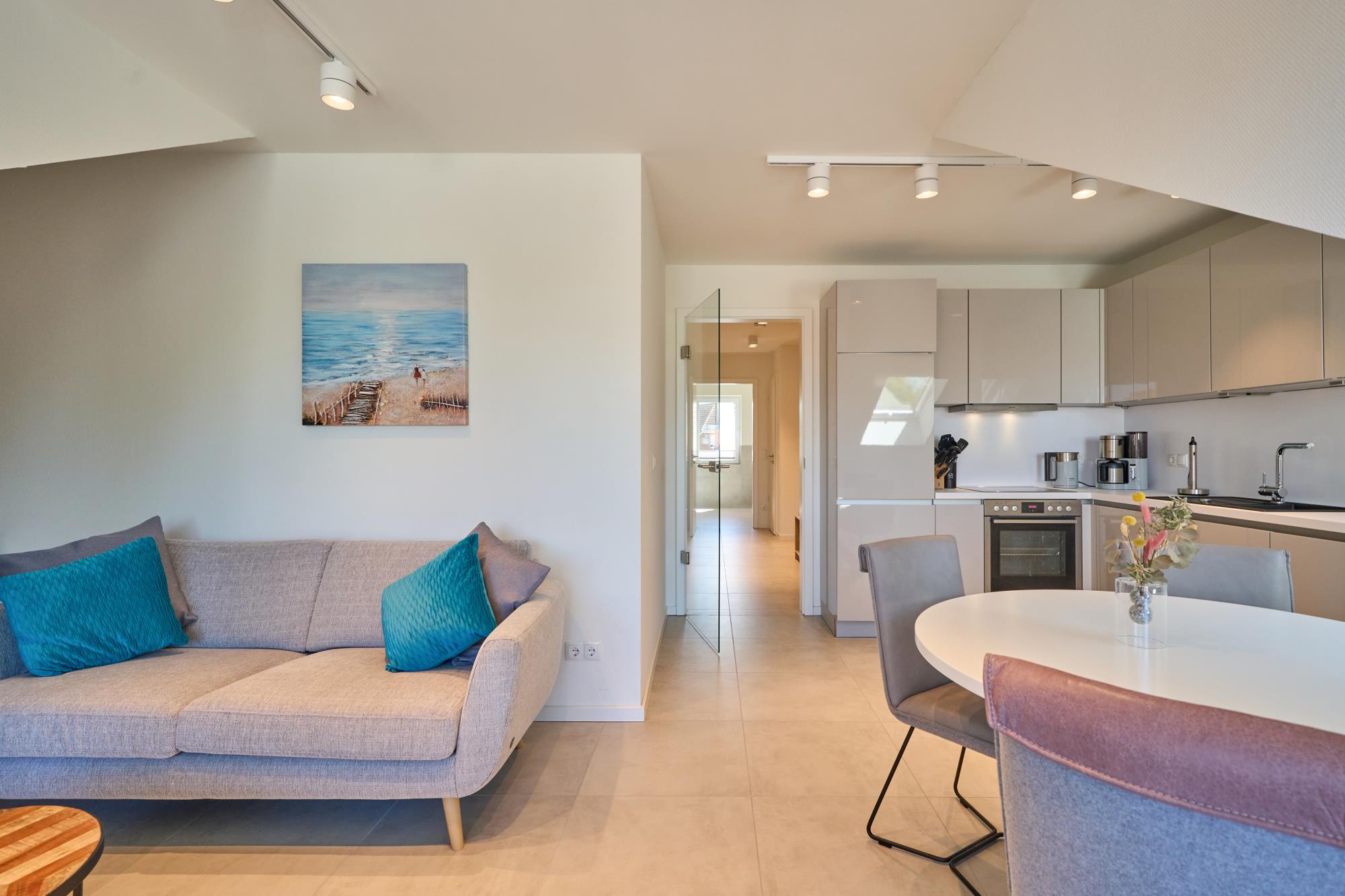 Der lichtdurchflutete Wohn- und Essbereich mit voll ausgestatteter Küche, Smart-TV, WLAN und Sofaecke schafft Raum für Genuss und gemeinsame Zeit.