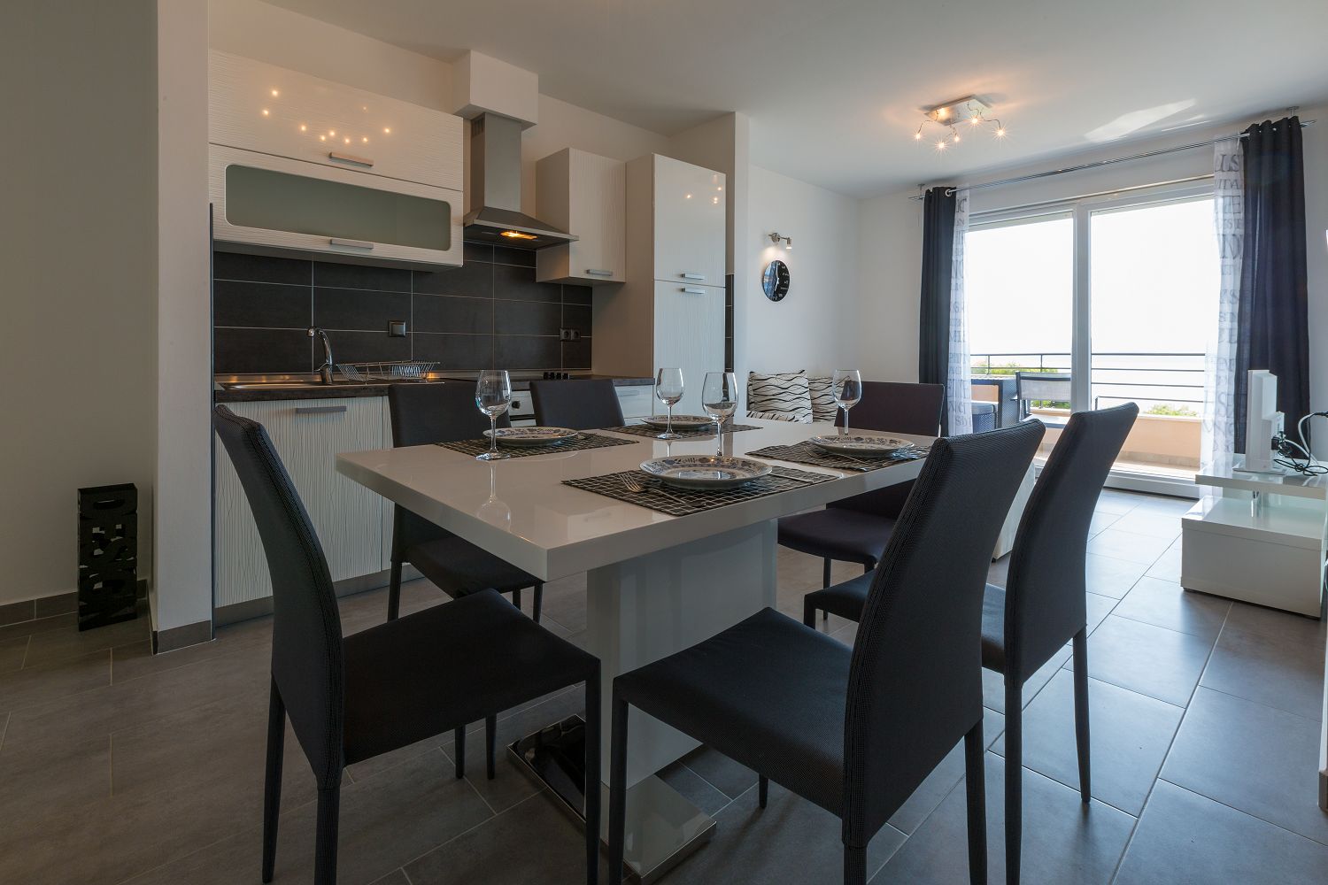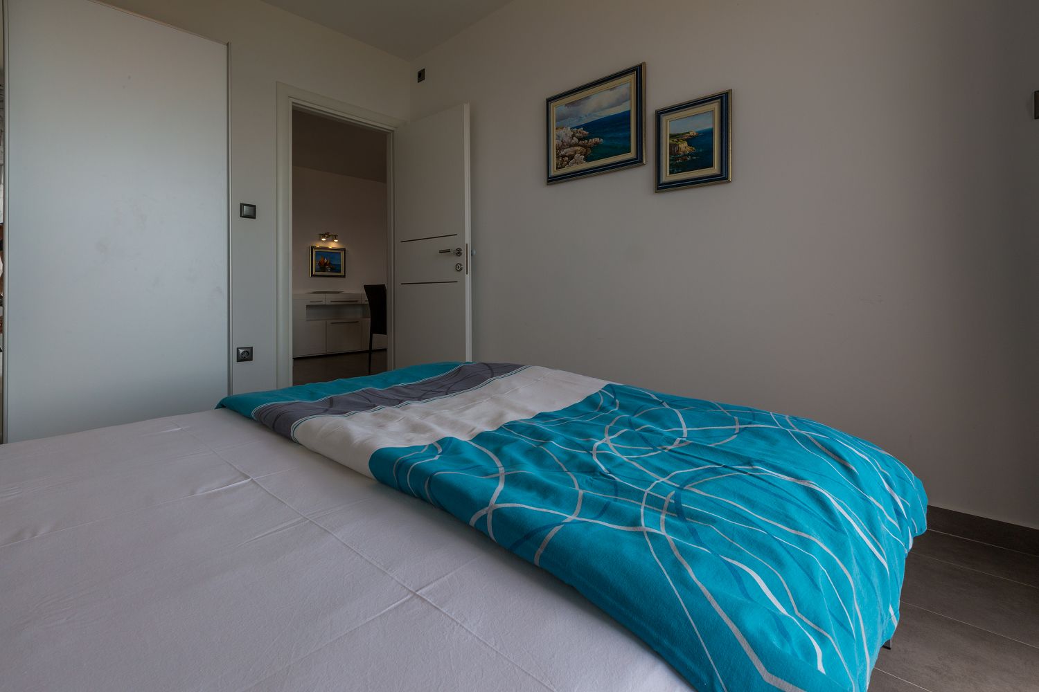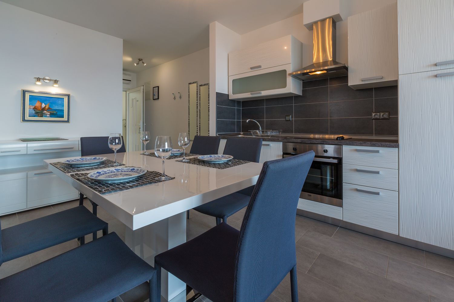 Highlight dieses Hauses ist die Dachterrasse mit Wellnessoase, die drei beheizte Whirlpools, Sonnenliegen, eine Sauna und zwei Loungeecken bietet. Diese kann man zwei Stunden am Tag gratis nutzen. Alle Möbel sind qualitativ hochwertig und modern. Die Wohnung besteht aus einem Wohn-/Esszimmer mit Küche, zwei Schlafzimmern, zwei Badezimmern, einem Eingangsbereich und einem sehr schönen Balkon. Vom Objekt bis zum Strand sind es 100 Meter und die Entfernung zum Zentrum beträgt 3 km. Das nächstgelegenste Lebensmittelgeschäft befindet sich 140 Meter von der Ferienimmobilie entfernt. In 20 Metern ist das umliegende Restaurant zu erreichen.