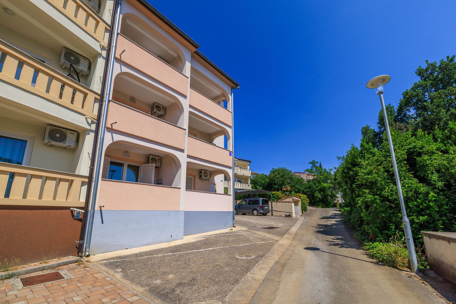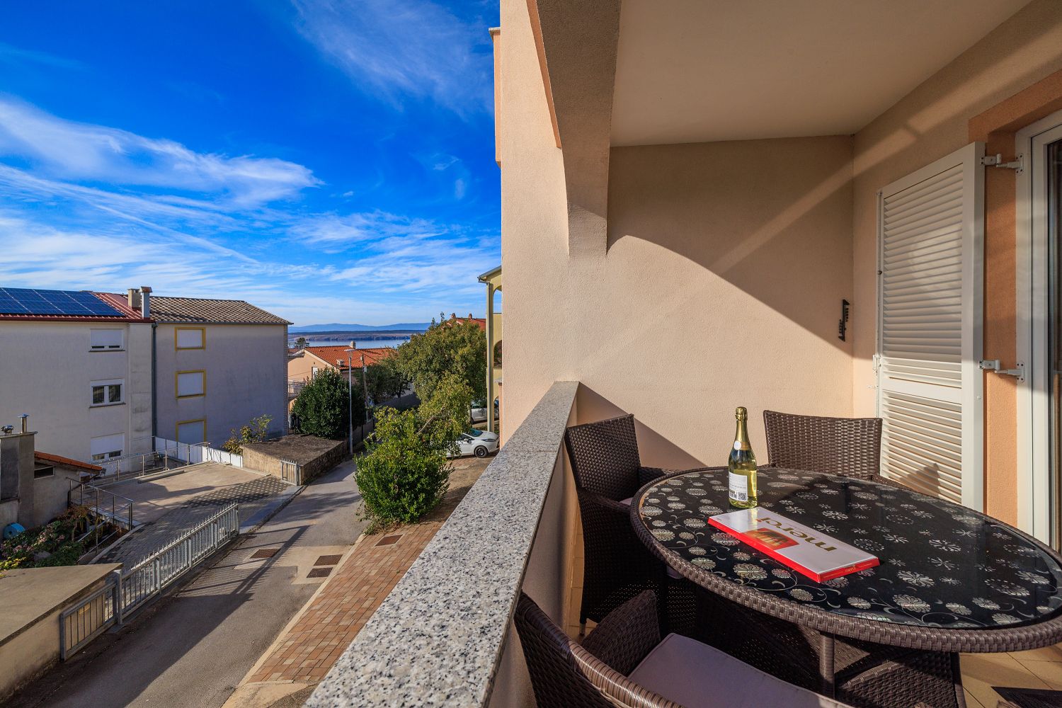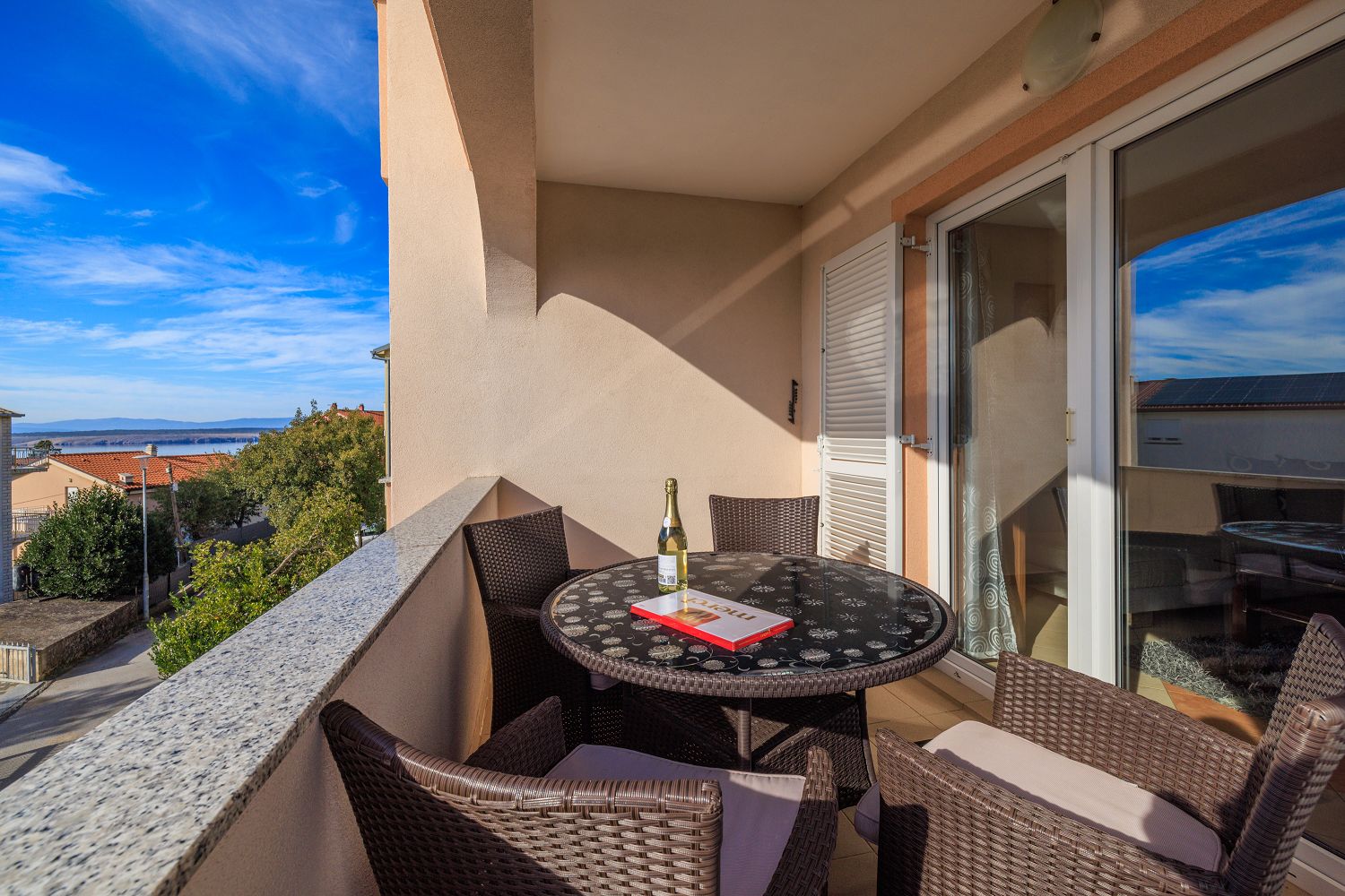 Diese wunderschöne, lichtdurchflutete Ferienwohnung besticht durch ihre zentrale Lage und ihren modernen Komfort. Beim Betreten erwartet Sie ein großzügiger Eingangsbereich, der nahtlos in den offenen Wohn- und Essbereich mit Küche übergeht. Die elegante Einbauküche ist mit allen nötigen Geräten ausgestattet und bietet genügend Platz für kulinarische Entfaltung. Ein besonderes Highlight ist der großzügige Balkon, der zum Entspannen einlädt und einen wunderbaren Blick auf die Adria bietet. Die Schlafzimmer sind ruhig gelegen und bieten ausreichend Stauraum. Das Badezimmer ist modern ausgestattet und verfügt über eine Dusche und eine Waschmaschine. Besonders hervorzuheben ist die perfekte Anbindung. Die Wohnung liegt nur wenige Gehminuten von Einkaufsmöglichkeiten und Restaurants entfernt. Auch Strände sind in unmittelbarer Nähe, sodass sich hier urbanes Leben und Entspannung ideal verbinden lassen.