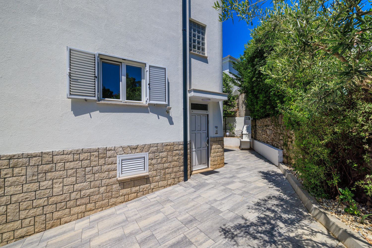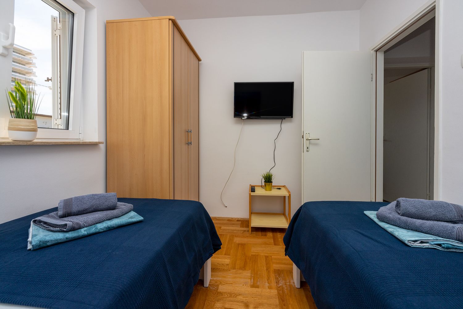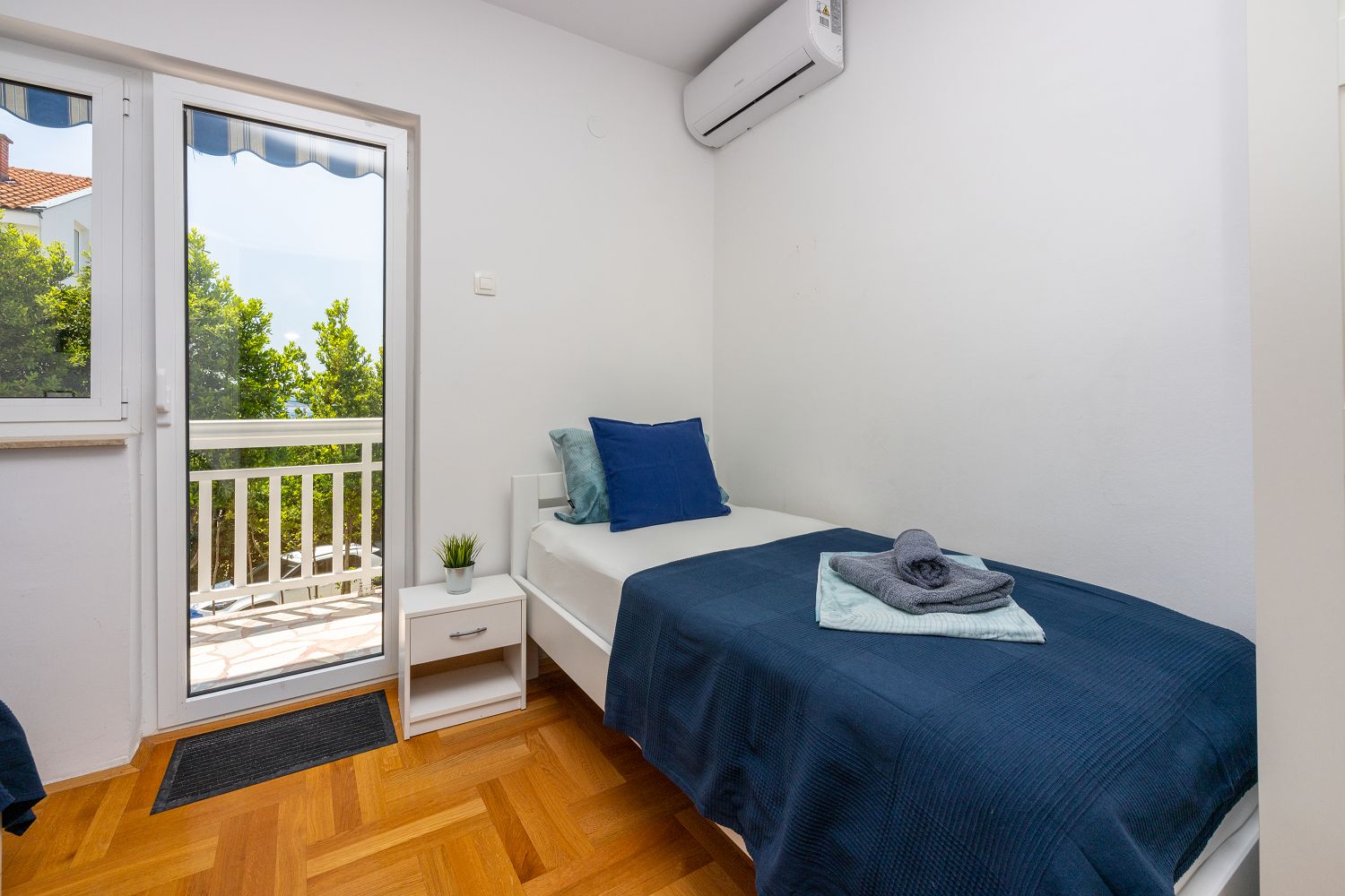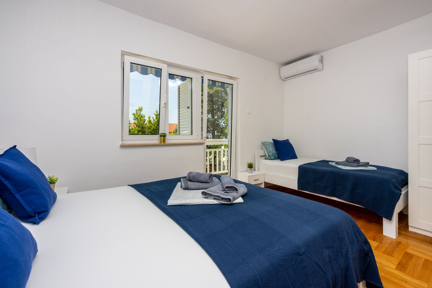 Diese Wohnung, die sich über eine ganze Etage erstreckt, wurde im Jahr 2018 komplett renoviert. Sie verfügt über eine Küche mit Essbereich im Eingangsbereich, zwei Schlafzimmer mit je einem Doppelbett und einem Einzelbett sowie ein Schlafzimmer mit zwei getrennten Betten. Außerdem gibt es ein Badezimmer und eine separate Toilette. Die beiden Schlafzimmer mit Doppelbetten liegen zur Meerseite, haben Zugang zum Balkon und sind klimatisiert. Vor dem Eingangsbereich steht eine 30 m² große Terrasse zur alleinigen Nutzung zur Verfügung. Sie ist überdacht und möbliert. Von der Küche aus ist die Terrasse gut zugänglich und aufgrund der Überdachung ideal als zweiter Essbereich nutzbar. Ein eigener, kostenfreier Parkplatz befindet sich auf dem Grundstück des Hauses.