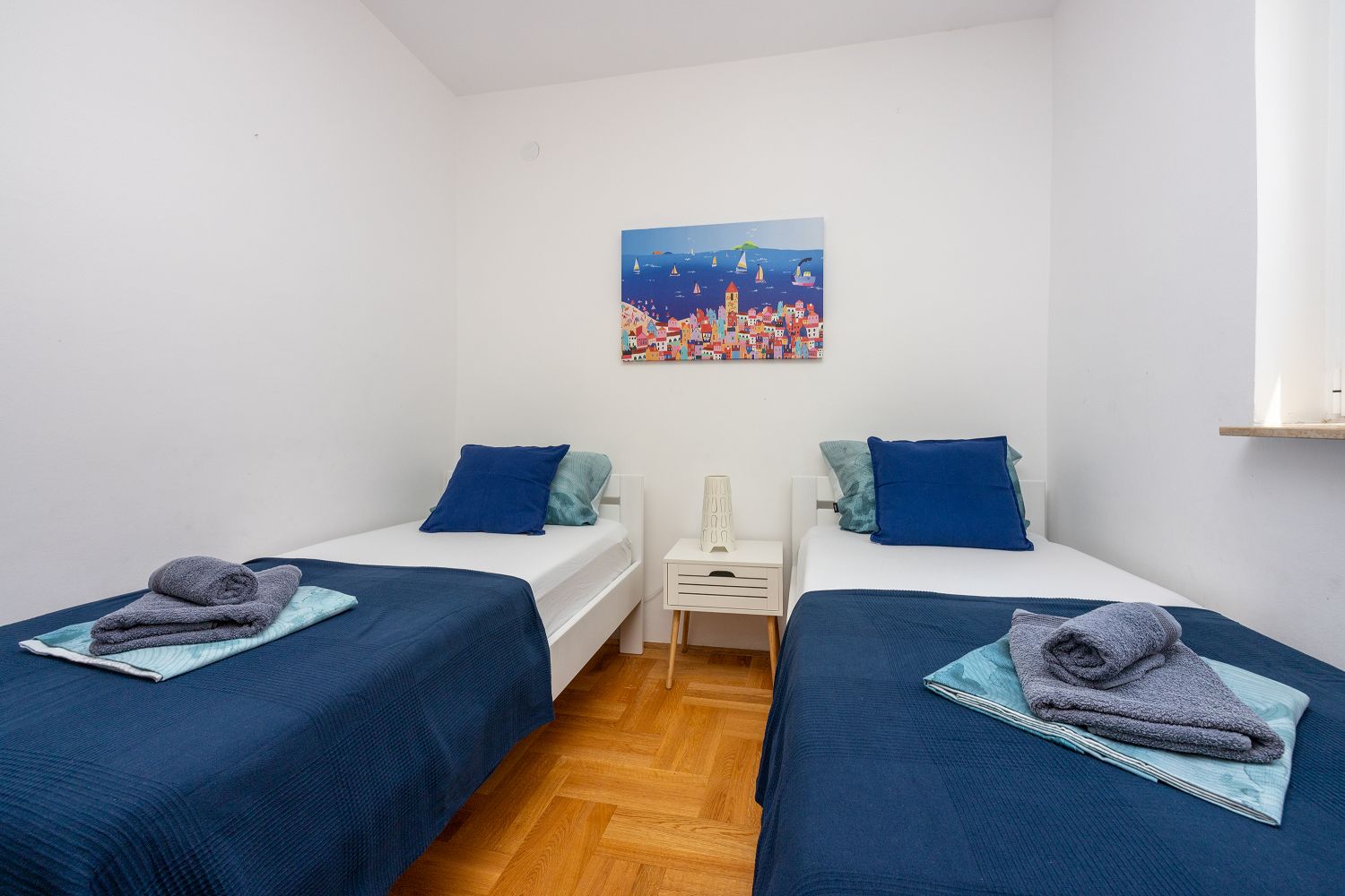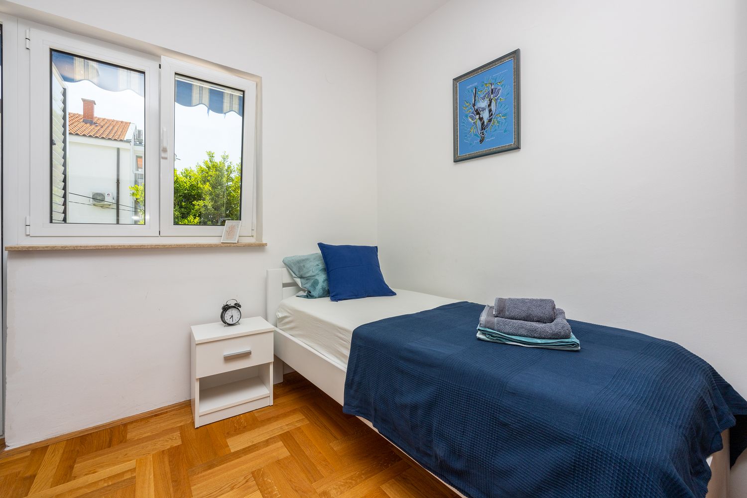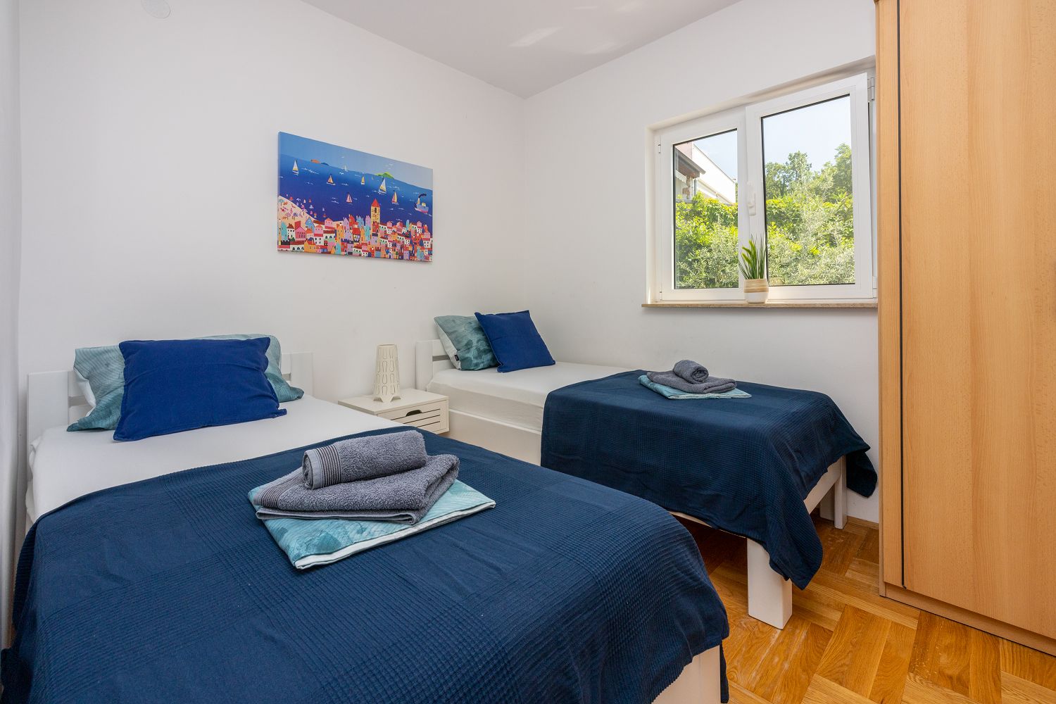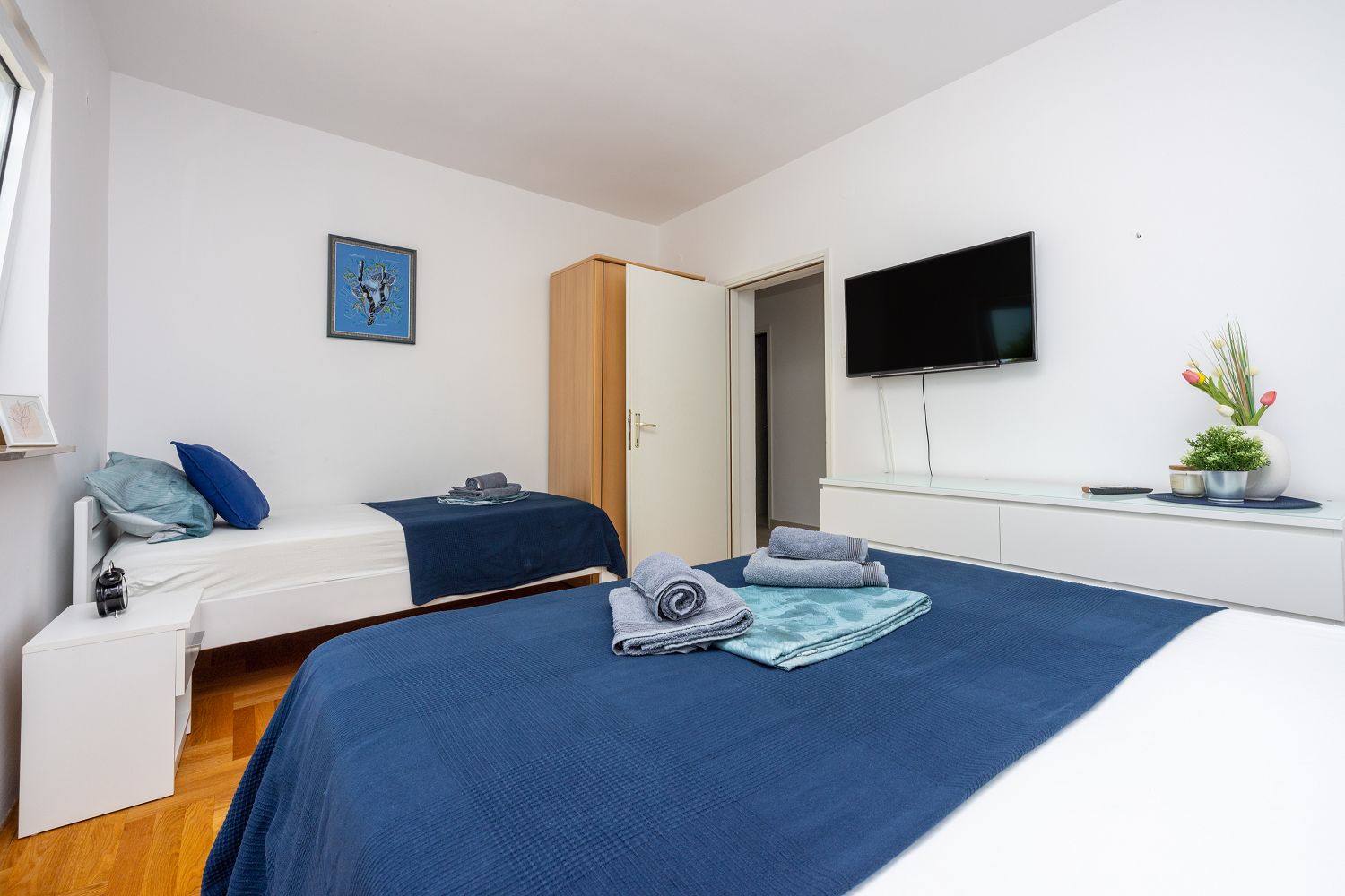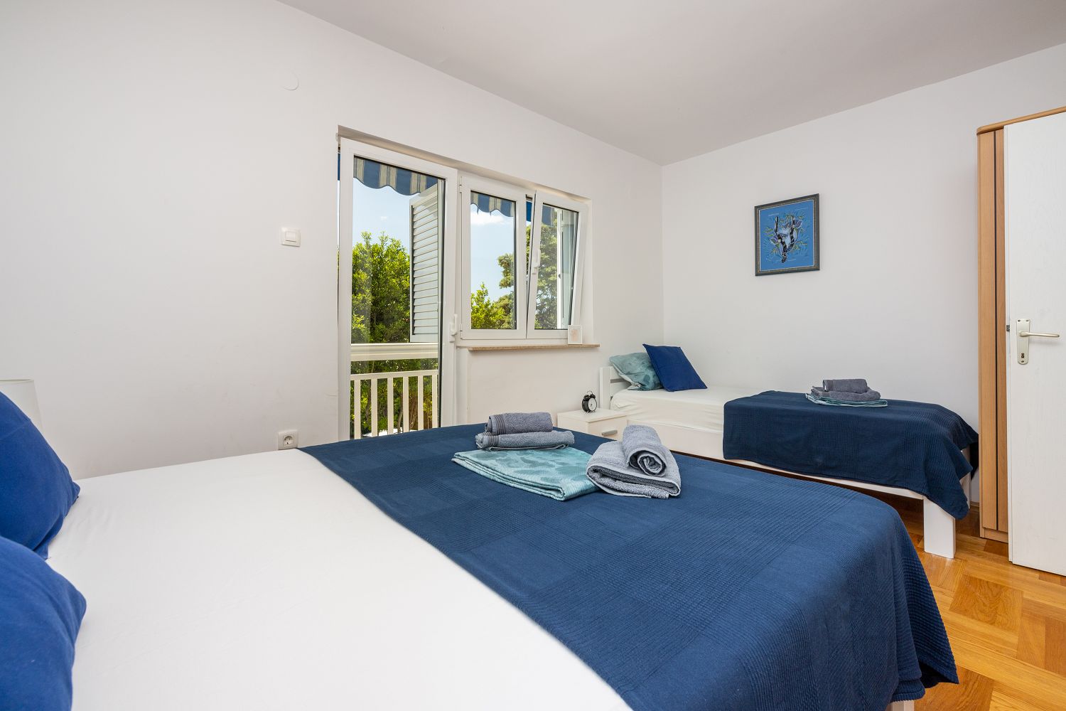 Diese Wohnung, die sich über eine ganze Etage erstreckt, wurde im Jahr 2018 komplett renoviert. Sie verfügt über eine Küche mit Essbereich im Eingangsbereich, zwei Schlafzimmer mit je einem Doppelbett und einem Einzelbett sowie ein Schlafzimmer mit zwei getrennten Betten. Außerdem gibt es ein Badezimmer und eine separate Toilette. Die beiden Schlafzimmer mit Doppelbetten liegen zur Meerseite, haben Zugang zum Balkon und sind klimatisiert. Vor dem Eingangsbereich steht eine 30 m² große Terrasse zur alleinigen Nutzung zur Verfügung. Sie ist überdacht und möbliert. Von der Küche aus ist die Terrasse gut zugänglich und aufgrund der Überdachung ideal als zweiter Essbereich nutzbar. Ein eigener, kostenfreier Parkplatz befindet sich auf dem Grundstück des Hauses.