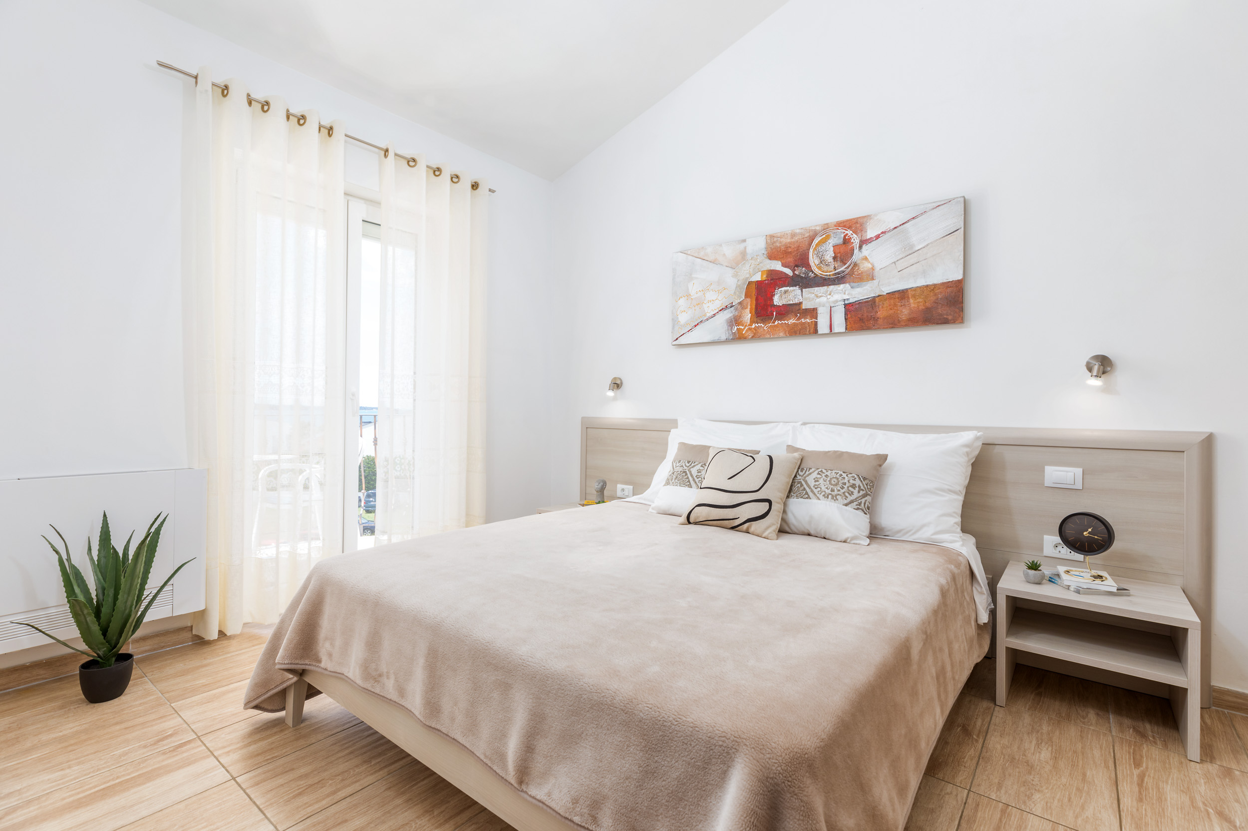 Die Zweizimmer-Wohnung 2+2 bietet Platz für max. 4 Personen (mindestens 2 Kinder erforderlich). Sie verfügt über ein Schlafzimmer mit Doppelbett (160cm x 200cm). Eine zweite Schlafmöglichkeit bietet das Schlafsofa (160cm x 200cm) im Wohnbereich. Die vollausgestattete Küche verfügt über einen Induktionsherd, Geschirr, Besteck, Kochtöpfe, Wasserkocher, Filterkaffeemaschine, Mikrowelle, Backofen und einen Kühlschrank mit Eisfach. Ein SAT-Fernseher und Klimaanlage sind ebenfalls vorhanden. Das Badezimmer ist mit Dusche, WC, Bidet und Waschbecken ausgestattet. Die Wohnung bietet ausserdem zwei Balkone mit Tisch und Stühlen, die zum Verweilen einladen. Fahrzeit ab kroatischer Grenze ca. 1h. Hinweis: Wenn Sie mehr als eine Unterkunft benötigen, ist dies bei uns in der Regel möglich, da wir über mehrere Objekte des gleichen Haustyps verfügen.