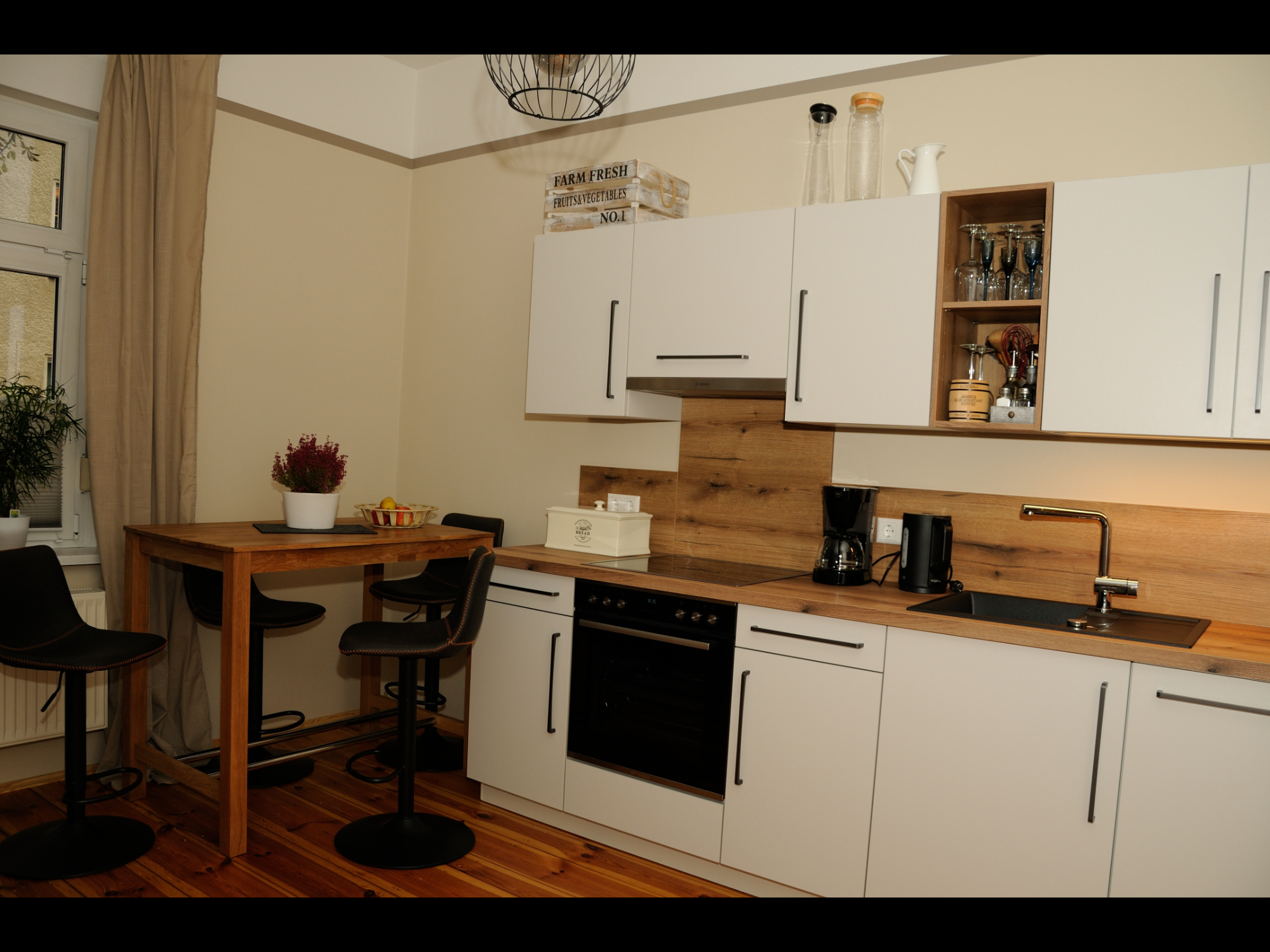 Herzlich willkommen in unserer modernen, gemütlich eingerichteten Ferienwohnung Alt-Finsterwalde in der Sängerstadt Finsterwalde im Süden Brandenburgs. Auf ca. 50 qm Wohnfläche bieten wir Ihnen eine stilvoll eingerichetete Wohnung für bis zu 4 Personen zzgl. Kleinkind (Babybett auf Wunsch verfügbar). Unsere geschmackvoll eingerichtete Ferienwohnung verfügt über ca. 50 qm Wohnfläche und bietet Platz für bis zu 4 Personen zzgl. Kleinkind (Babybett vorhanden). Das Wohnzimmer ist stilvoll mit einer gemütlichen Couch inkl. Schlaffunktion und einem Kamin ausgestattet. Das Schlafzimmer ist mit einem franz. Bett und Flachbild-TV eingerichtet. Die offene Küche ist modern und komplett eingerichtet inkl. Backofen, E-Herd, Kühlschrank inkl. Gefriermöglichkeit und Spülmaschine. Ein moderner Tresen inkl. Barhocker ist der Küche anliegend. Sozialverträgliche Haustiere sind bei Anmeldung herzlich willkommen. Internet via W-LAN nutzen Sie kostenlos. Ein PKW Stellplatz steht Ihnen ebenfalls kostenfrei zur Verfügung. Die Bettwäsche und Handtücher sind im Mietpreis bereits enthalten.