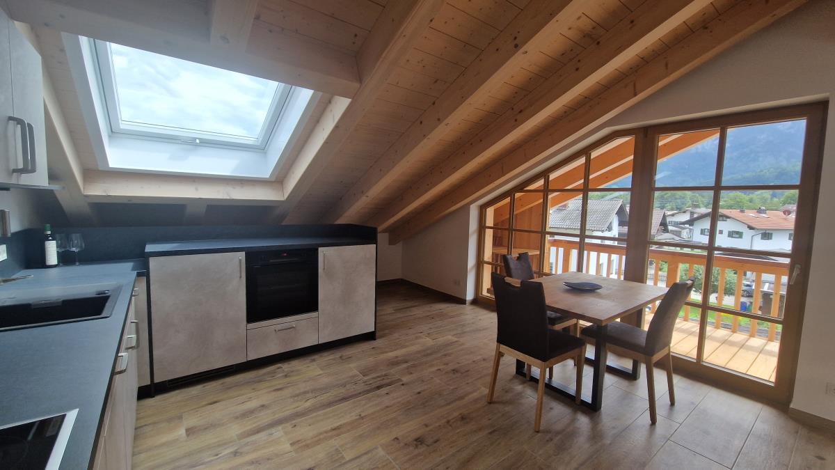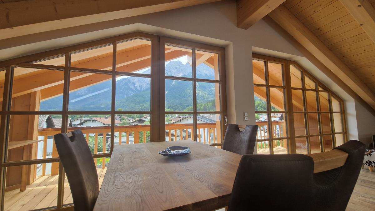 Die liebevoll und hochwertig ausgestattete Dachgeschosswohnung befindet sich im 2. Stock eines Neubaus mit nur 3 Einheiten. Sie ist sehr zentral gelegen. Vom tollen Balkon aus haben Sie einen grandiosen Blick auf das Zugspitzmassiv.
