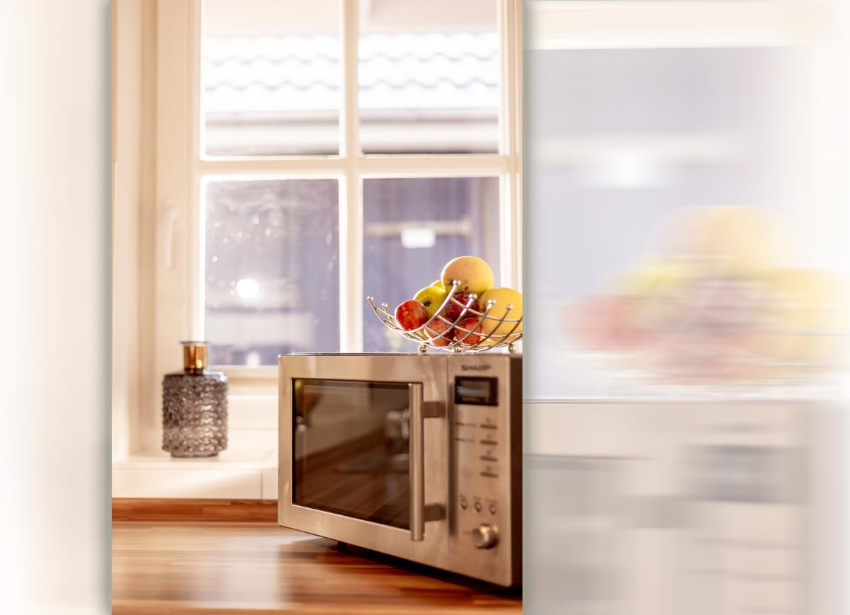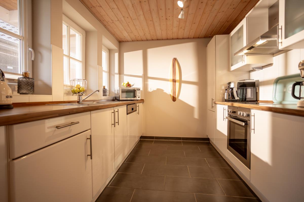 Die Küchenausstattung ist mehr als dürftig. Es fehlen Schälmesser, der Backofen war dreckig und darin lag noch das Backpapier vom Vornutzer, es fehlt ein Schneidebrett (man muss auf der Arbeitsplatte schneiden, dementsprechend sieht diese aus). An der Kaffeemaschine war der Filter abgebrochen, als wir dies bemängelten, bekamen wir zwar eine "neue" Kaffeemaschine, die jedoch nach Entkalken schrie und auch nicht wirklich sauber war. Die Wohnung ist zwar für 4 Personen gedacht, aber es fehlen entsprechend Töpfe und Pfannen, damit dann auch für 4 Personen etwas zu Essen machen könnte. Auch fehlten Topfuntersetzer. In der Senseo-Maschine steckte noch ein uralter Kaffeepad. Der Ofenhandschuh, der in der Küche an der Wand hing, war mehr als dreckig.