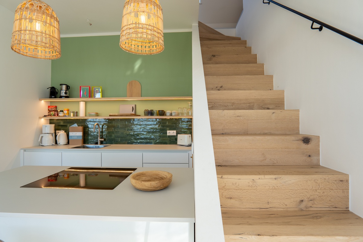 Im unteren Wohnbereich erwartet Sie ein heller, gemütlich eingerichteter Wohnraum mit Flatscreen-TV und Sitzgruppe sowie eine einladende Essecke. Die moderne, offen gestaltete Küche ist vollständig ausgestattet und lässt keine Wünsche offen.