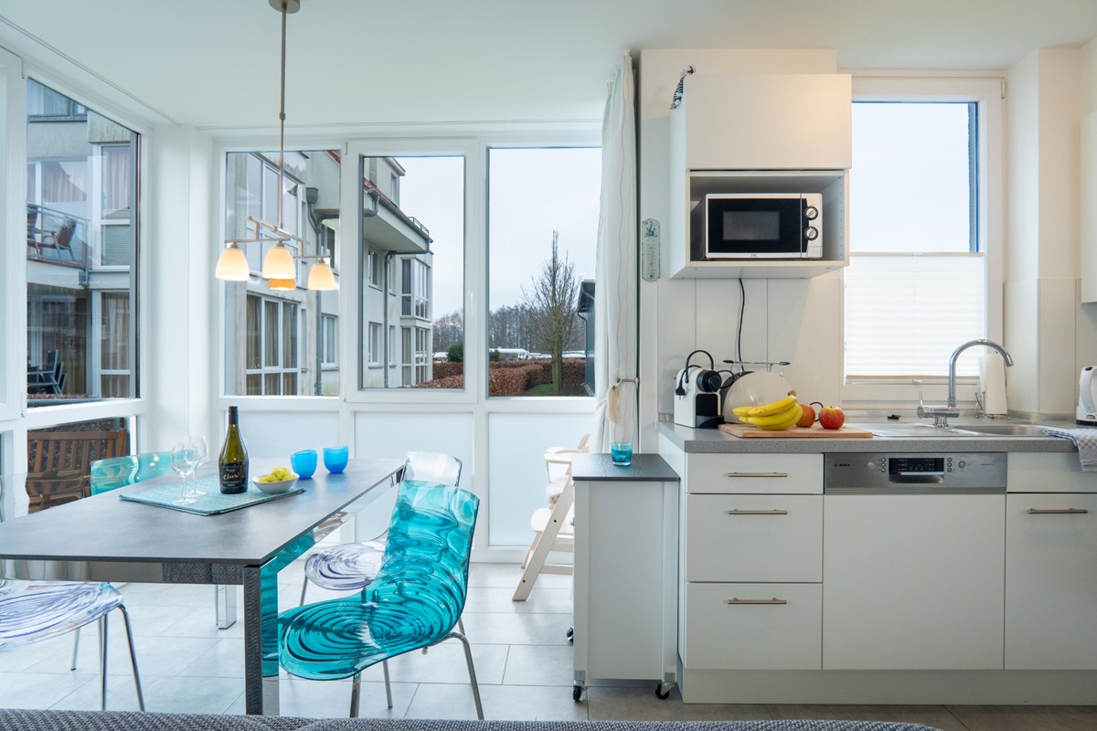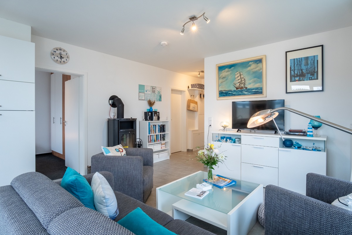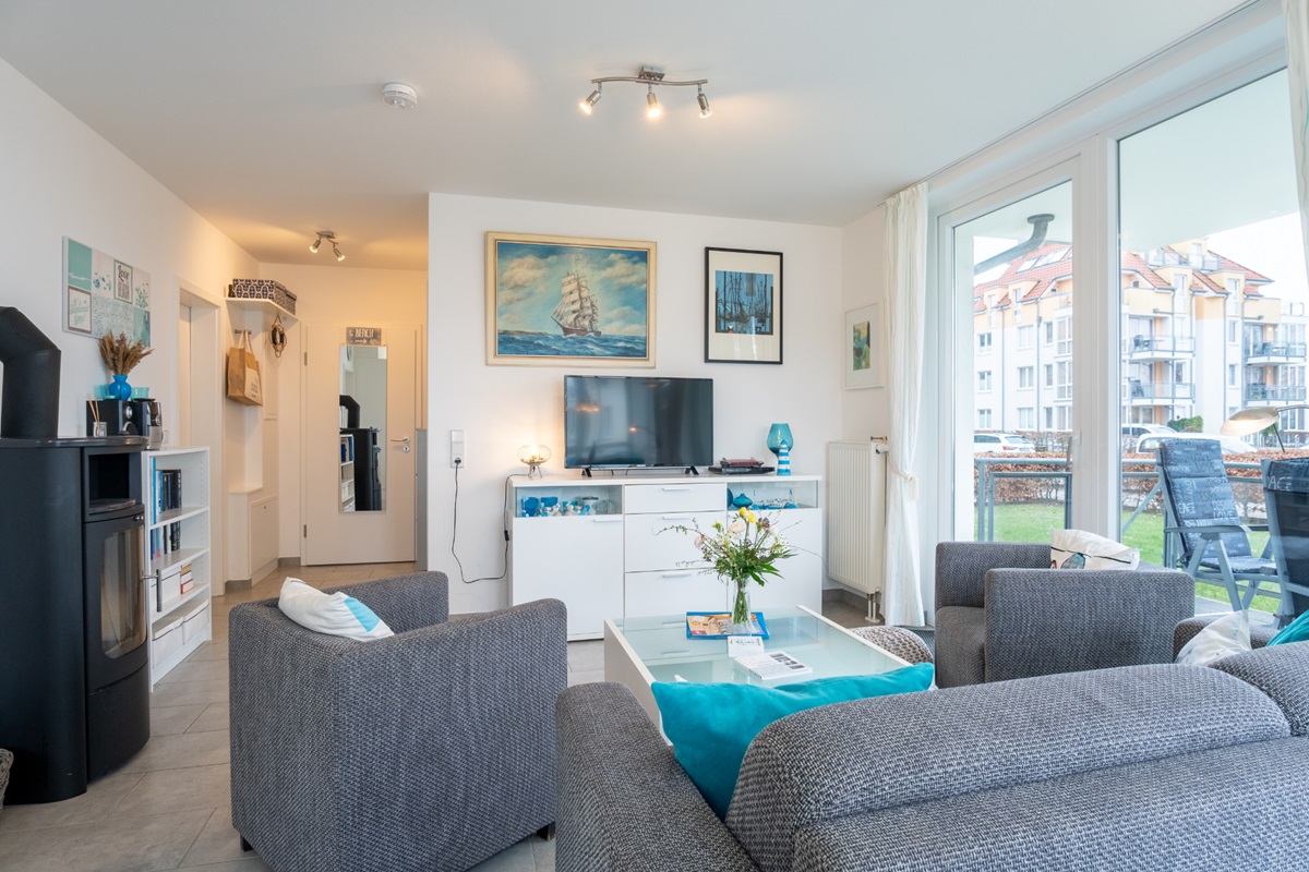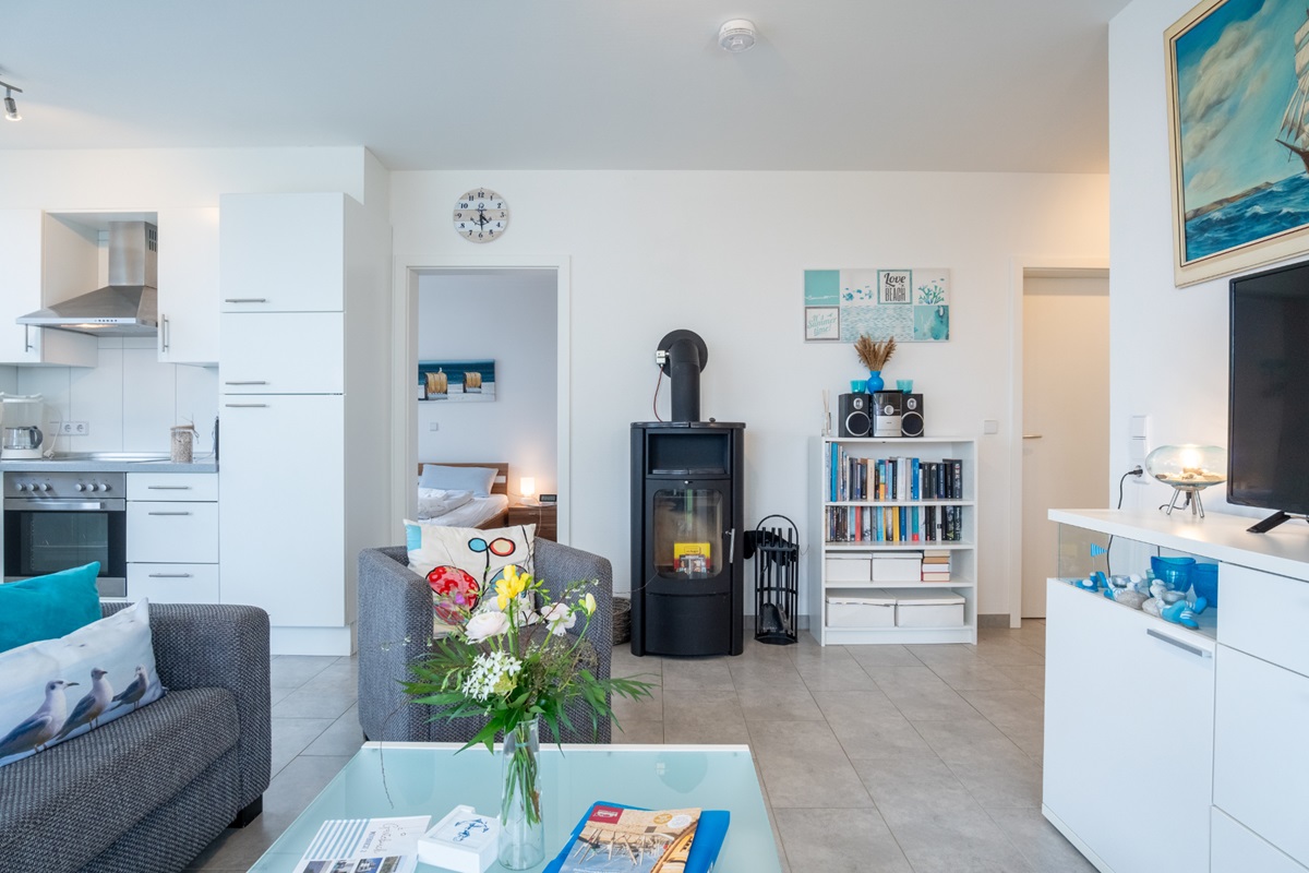 Die Wohnung verfügt über einen lichtdurchfluteten Wohnbereich mit einer gemütlichen Sitzecke mit Kaminofen, einer Essecke mit Blick ins Grüne und der angrenzenden offenen Küchenzeile. Vom Wohnbereich aus gelangt man auf die - man kann die Ostsee schon riechen. Beide Schlafzimmer sind mit bequemen Doppelbetten ausgestattet.