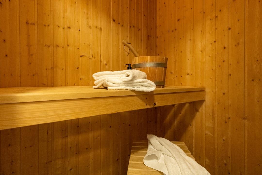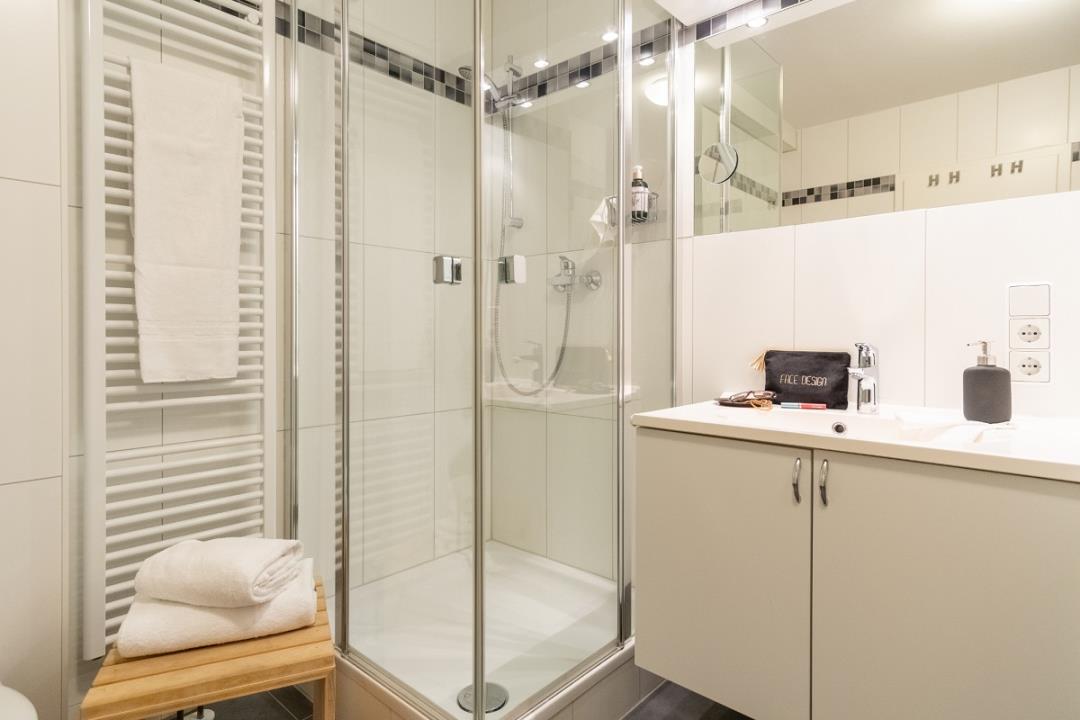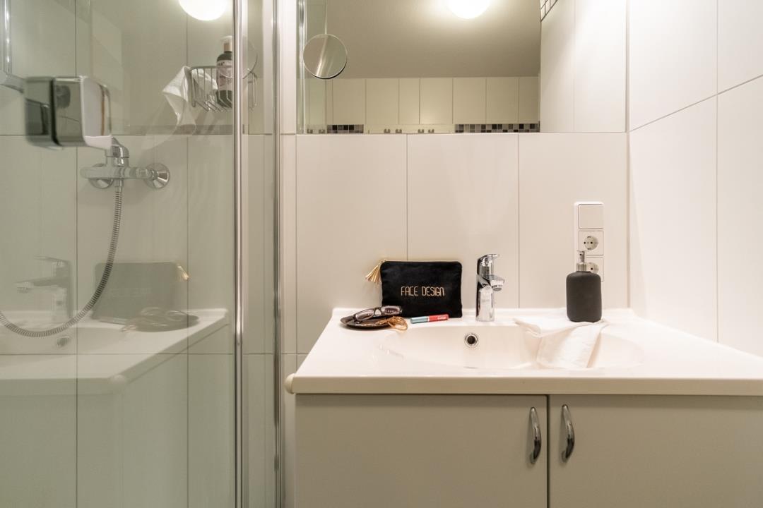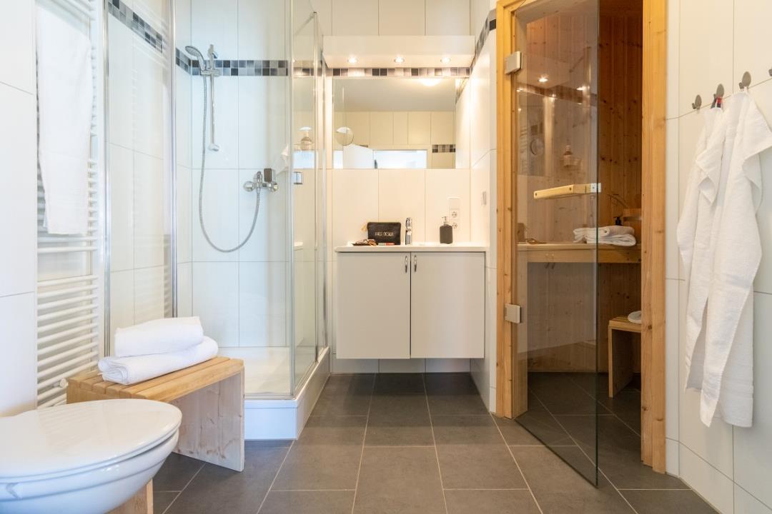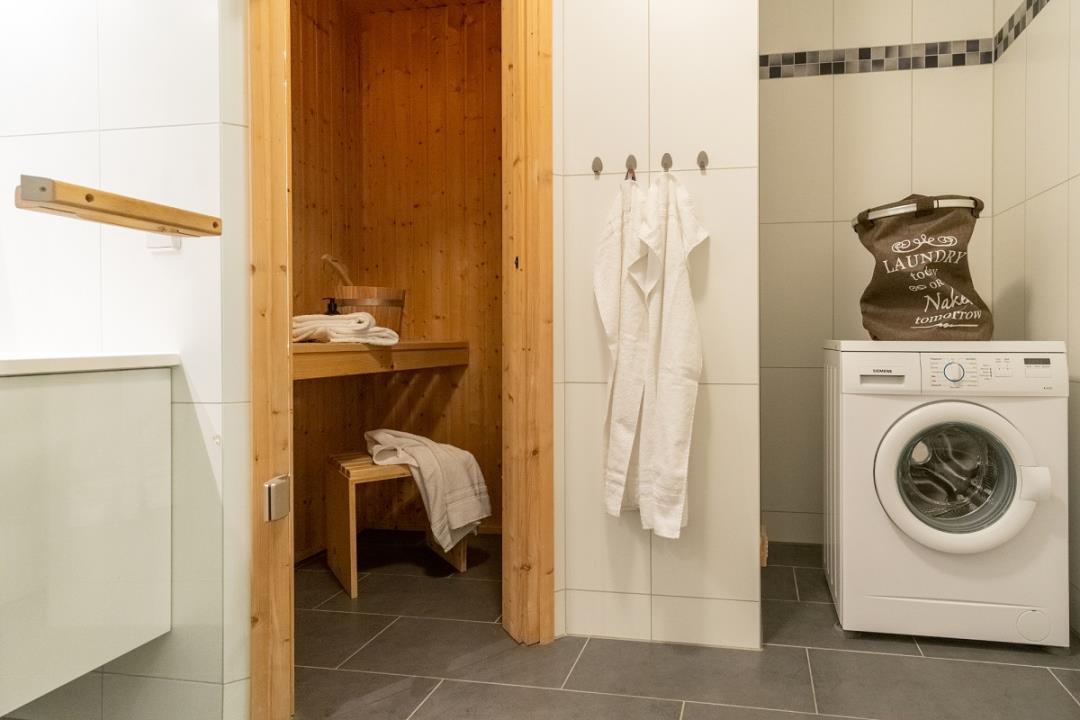 Das Wellnessbad präsentiert sich neben der großen Duschkabine auch mit einer wohnungseigenen Sauna. Außerdem steht Ihnen hier noch eine Waschmaschine zur kostenfreien Verfügung.
