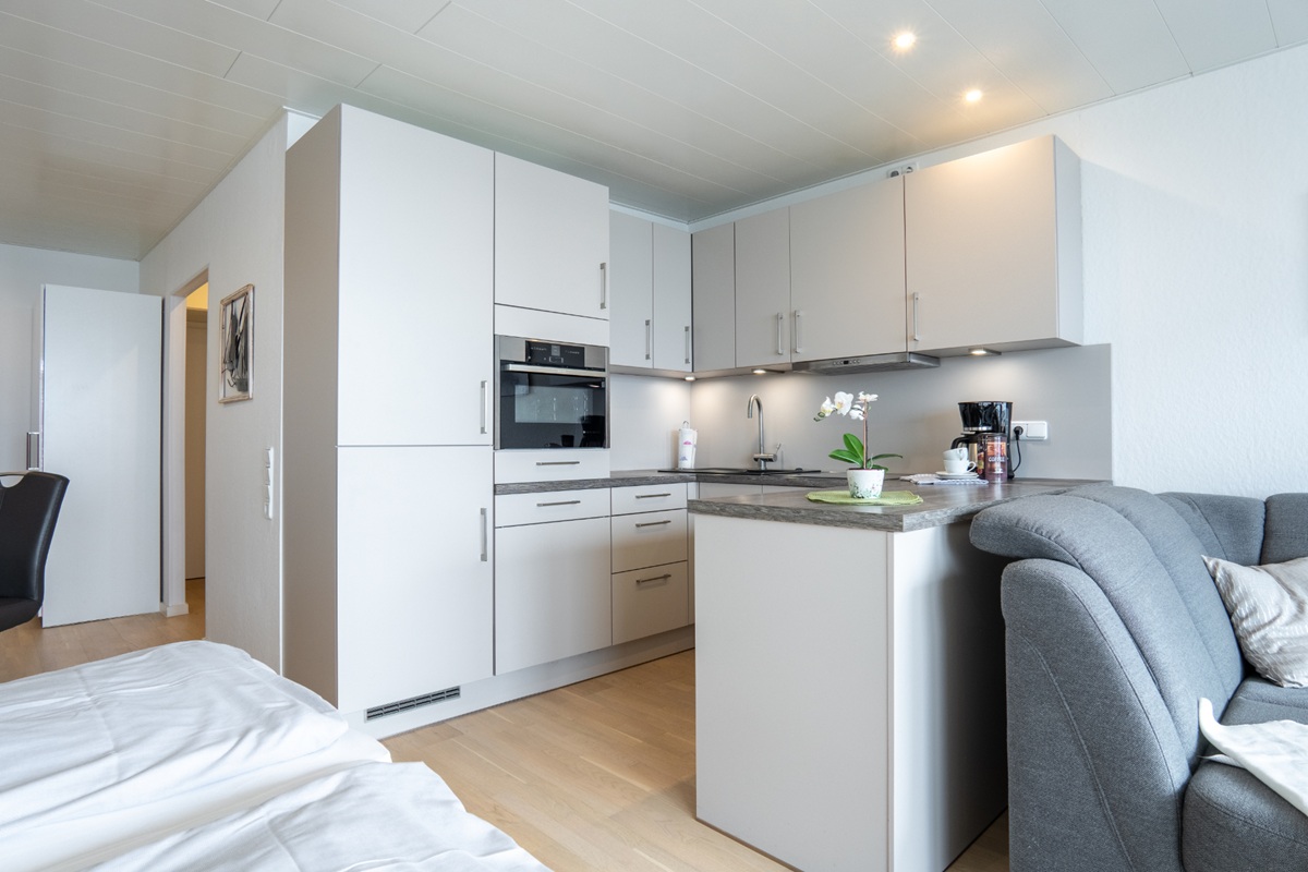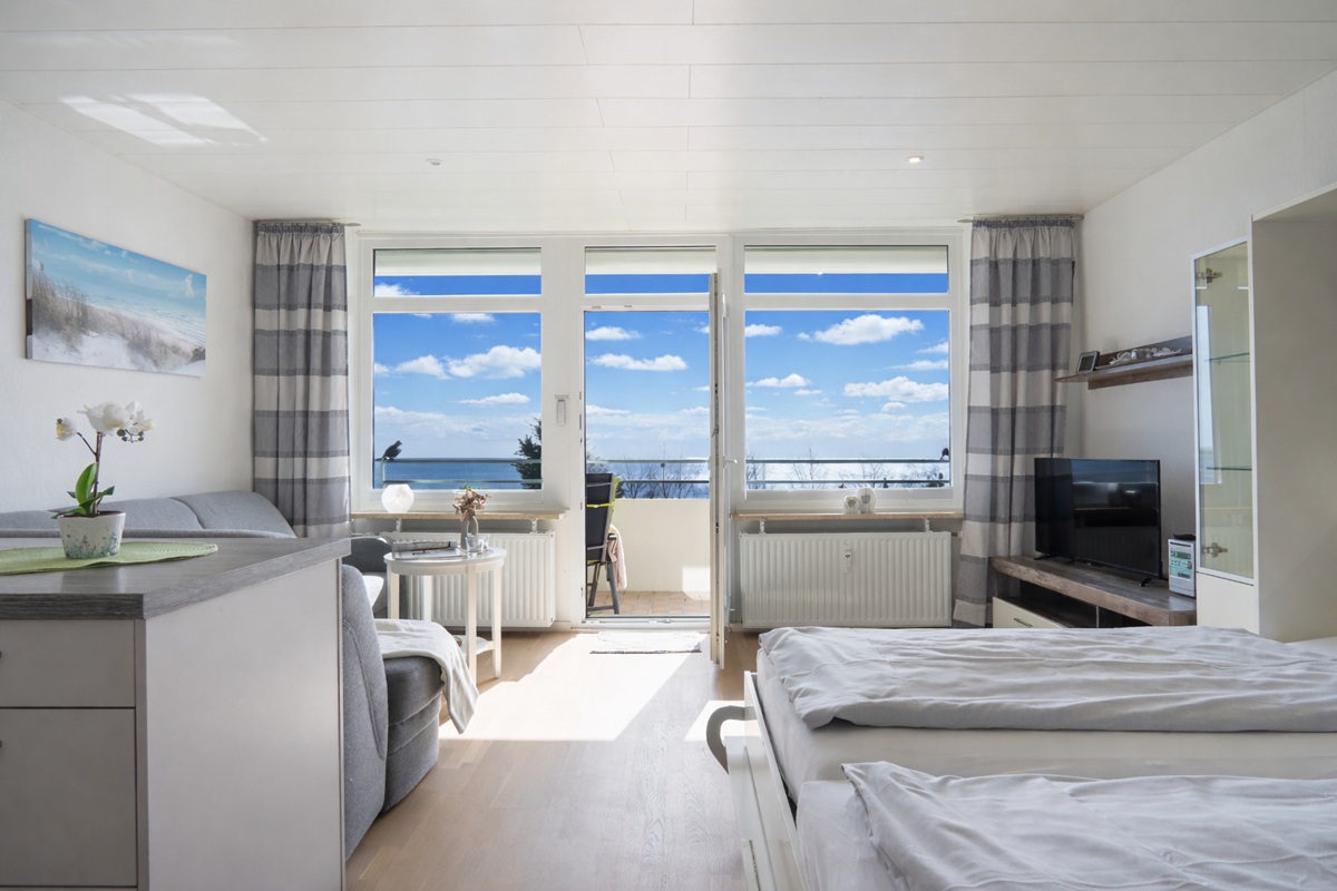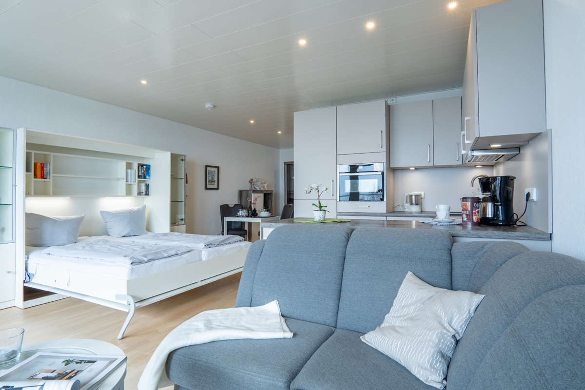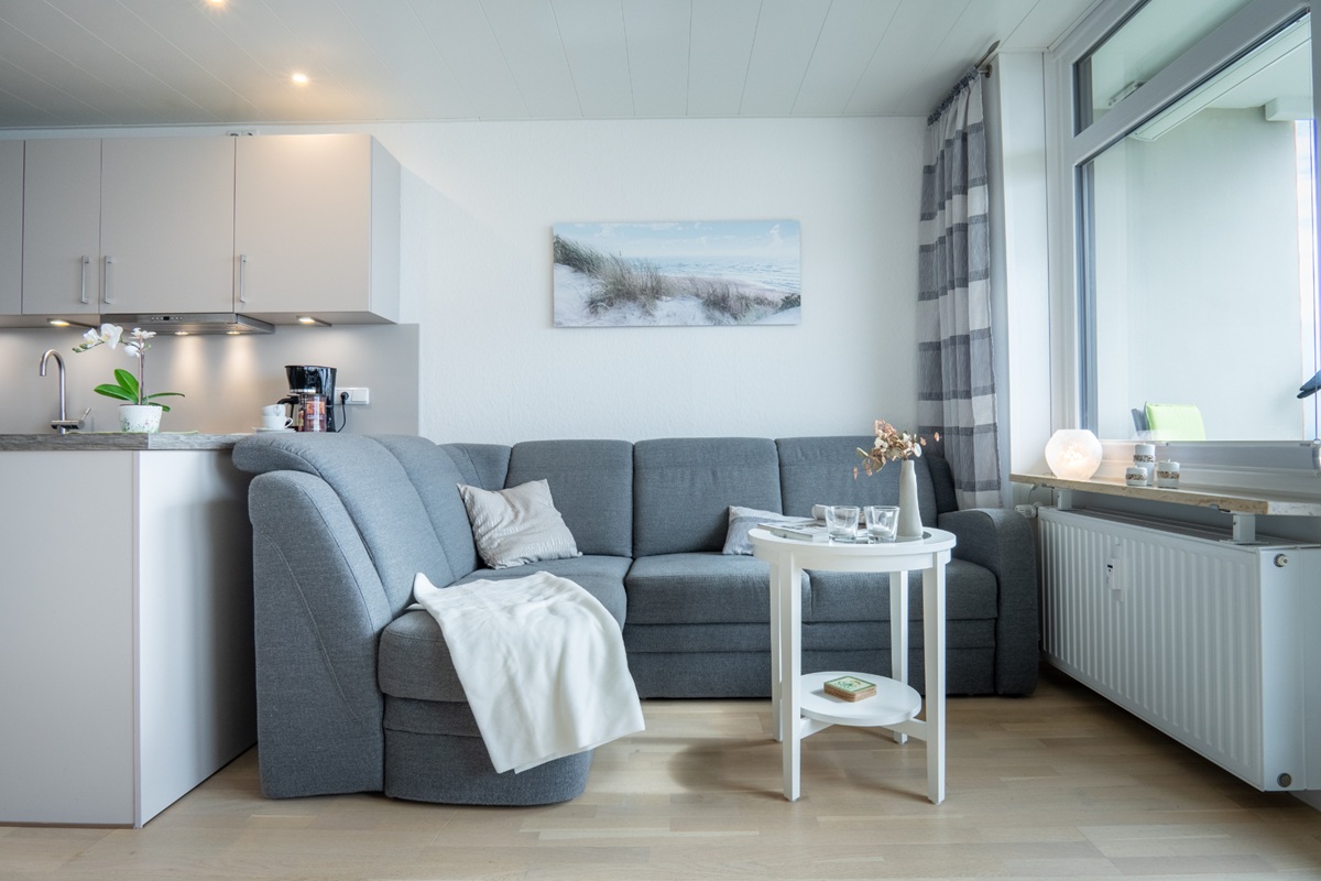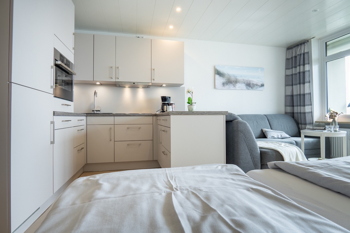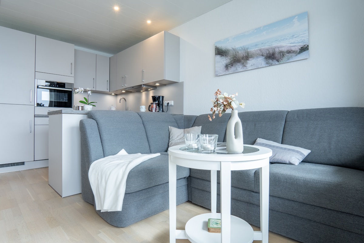 Die modernisierte 47m²-Wohnung in der 4. Etage im Haus 1 der Anlage "Vier Jahreszeiten" am Südstrand verfügt über einen großzügigen Wohn-Schlafbereich mit einem komfortablen Doppelschrankbett im hinteren Bereich, einer gemütlichen Sofaecke mit Flatscreen-TV und der Essecke für zwei Personen. Vom Wohnzimmer aus gelangen Sie auf den Südbalkon. Der offene Küchenbereich ist, für den Urlaubsbedarf, voll ausgestattet. Eine Kaffeemaschine gehört ebenso dazu, wie der Wasserkocher und ein Toaster. Geschirr und Besteck sind ausreichend vorhanden.