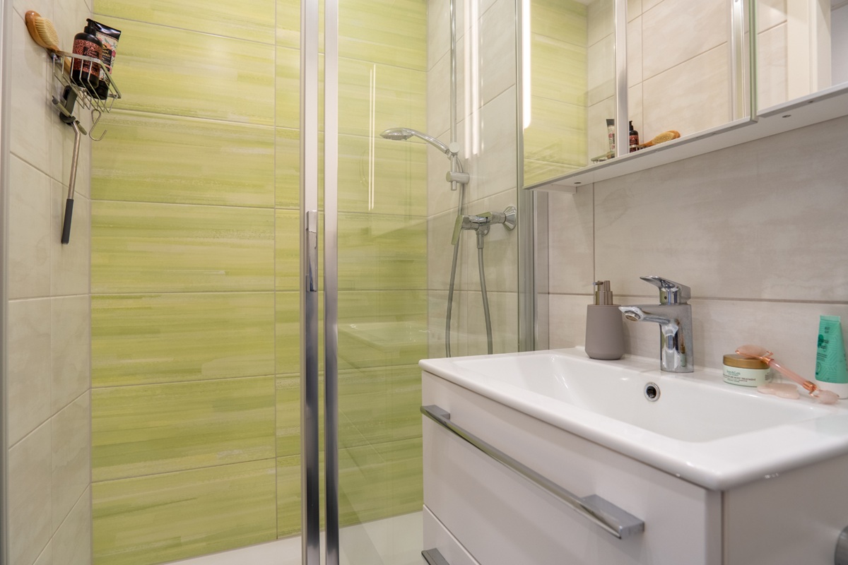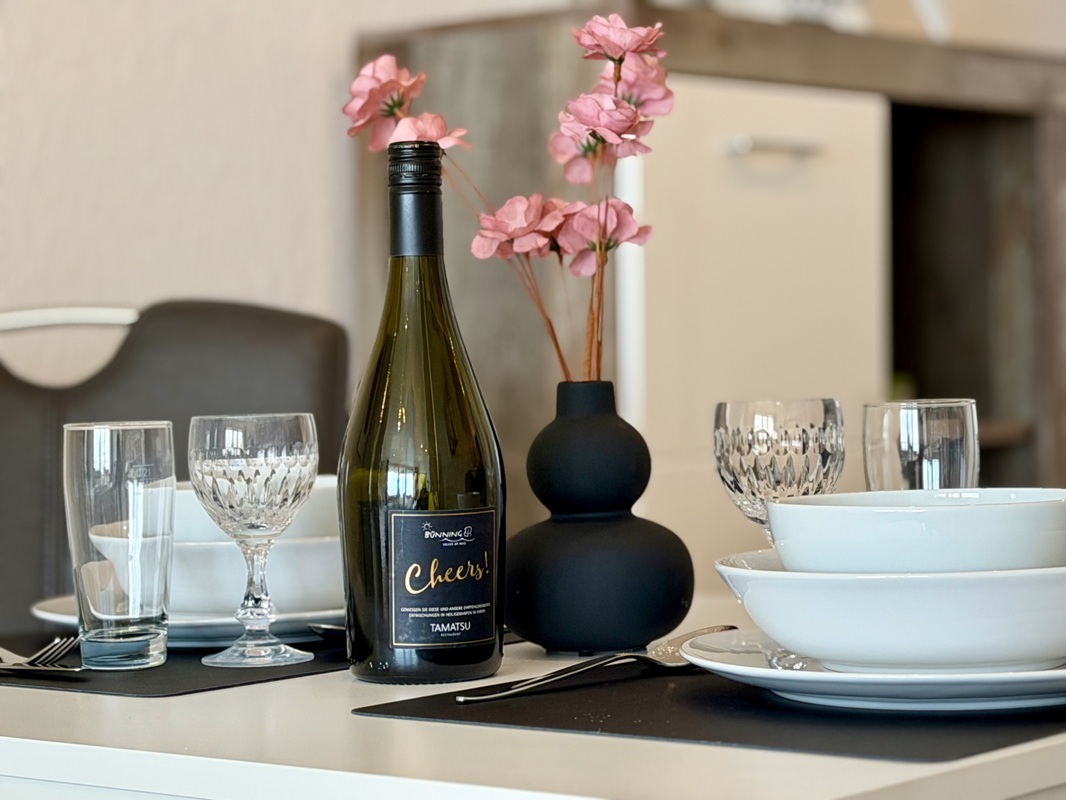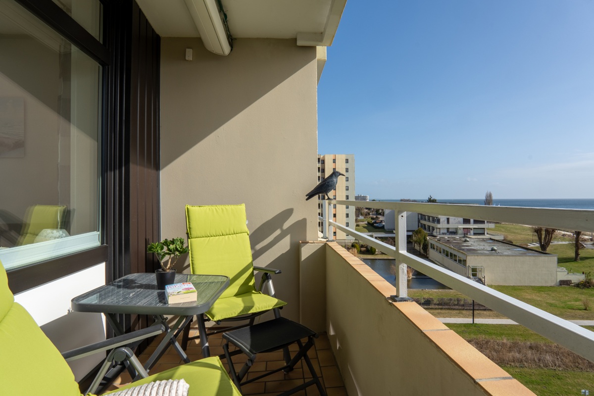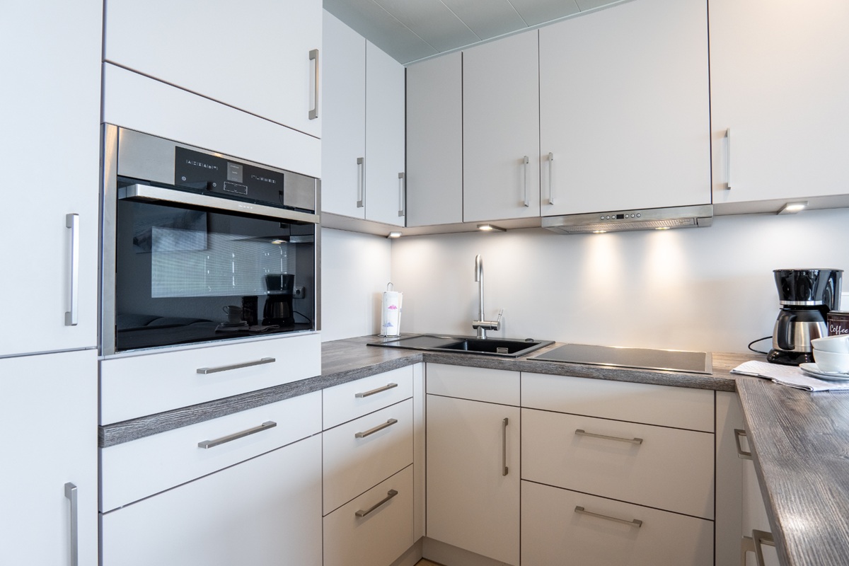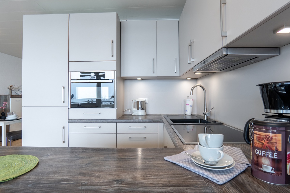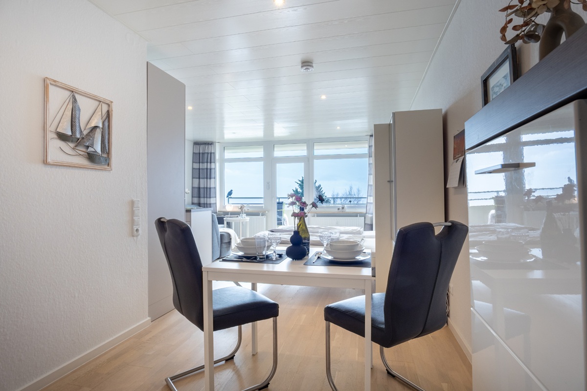 Die modernisierte 47m²-Wohnung in der 4. Etage im Haus 1 der Anlage "Vier Jahreszeiten" am Südstrand verfügt über einen großzügigen Wohn-Schlafbereich mit einem komfortablen Doppelschrankbett im hinteren Bereich, einer gemütlichen Sofaecke mit Flatscreen-TV und der Essecke für zwei Personen. Vom Wohnzimmer aus gelangen Sie auf den Südbalkon. Der offene Küchenbereich ist, für den Urlaubsbedarf, voll ausgestattet. Eine Kaffeemaschine gehört ebenso dazu, wie der Wasserkocher und ein Toaster. Geschirr und Besteck sind ausreichend vorhanden.