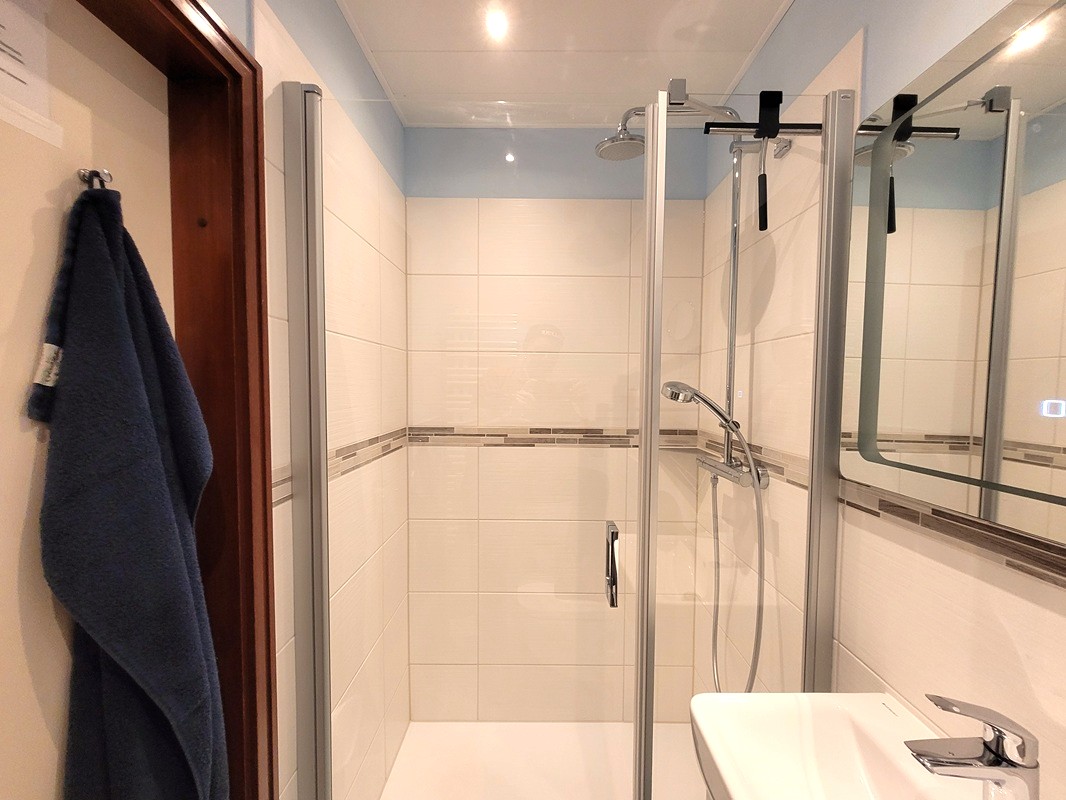 Die gemütliche 47m²-Wohnung befindet sich in der achten Etage verfügt über einen hellen Wohnbereich mit einem gemütlichen Sofa, Flatscreen-TV und einer Essecke für vier Personen. Vom Wohnzimmer aus gelangen Sie auf den Südbalkon mit herrlichem Merblick. Der offene Küchenbereich ist, für den Urlaubsbedarf, voll ausgestattet. Eine Kaffeemaschine gehört ebenso dazu, wie der Wasserkocher und ein Toaster. Geschirr und Besteck sind ausreichend vorhanden. Das Appartement verfügt über zwei separates Schlafzimmer: im Elternschlafzimmer wartet ein bequemes Doppelbett (ca. 160200). Das Kinderzimmer hält ein kleines Doppelbett (ca. 120200cm) vor. Die beiden Zimmer verfügen über Oberlichter, die sehr gut belichtet werden und die über eine Kurbel zum Lüften geöffnet werden können.