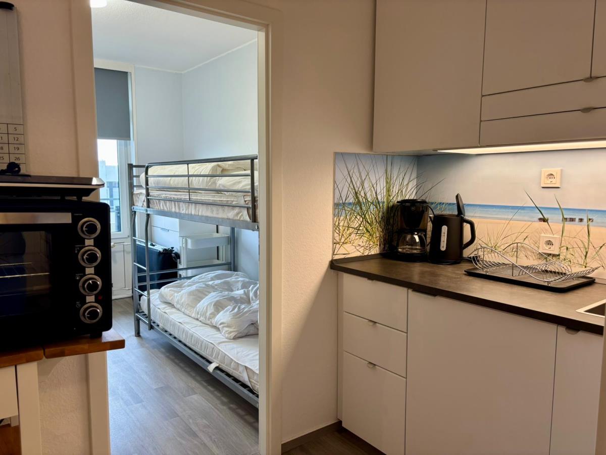 Das Kinderzimmer ist mit einem praktischen Etagenbett ausgestattet und bietet den kleinen Gästen einen gemütlichen Rückzugsort nach einem aufregenden Tag am Strand. Der Elternschlafbereich befindet sich im hinteren Teil des Wohnzimmers und hält ein komfortables Doppelbett für erholsame Nächte bereit.