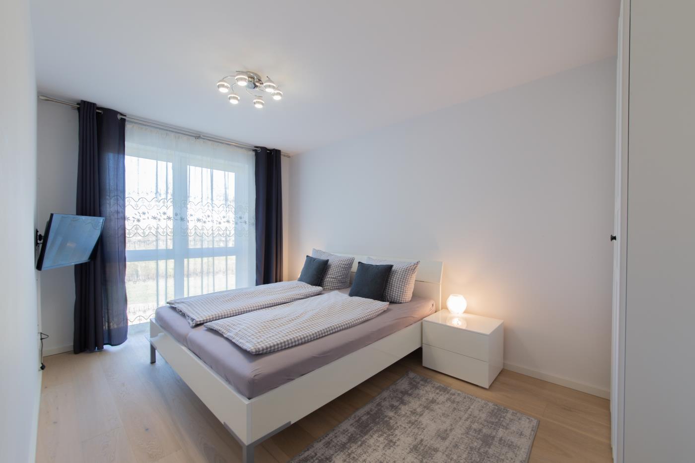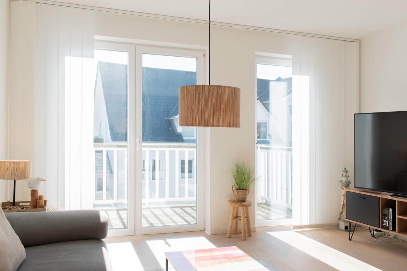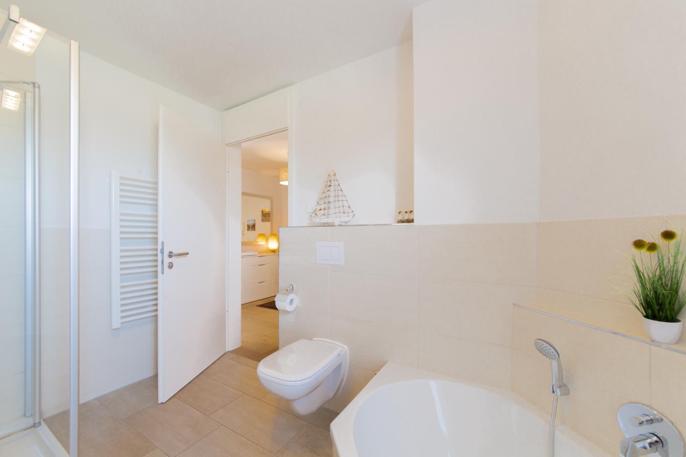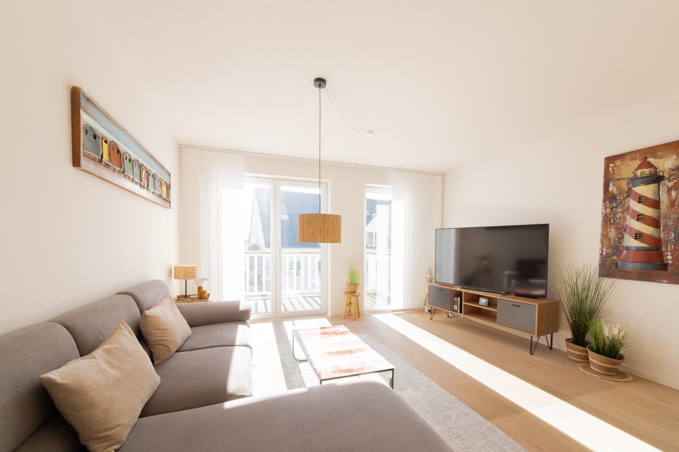 Drei Zimmer bieten Platz für bis zu vier Personen. Beide Schlafzimmer sind mit bequemen Doppelbetten (1,80 er Breite) und Kleiderschränken ausgestattet. Die offene Küche bietet Ihnen alles für einen ausschweifenden Kochabend und lässt keine Wünsche offen. Bodentiefe Fenster im Wohnzimmer sorgen den ganzen Tag für eine helle und freundliche Atmosphäre und die gemütliche Couchecke lädt zum Verweilen ein. Vom Wohnzimmer aus gelangen Sie auf den großzügigen, möblierten und südlich ausgerichteten Balkon von dem Sie einen seitlichen Meerblick genießen können. Das moderne Badezimmer ist mit einer Badewanne, Regendusche und einem WC ausgestattet. Eine Fußbodenheizung sorgt in der ganzen Wohnung auch im Winter für wohlige Wärme.