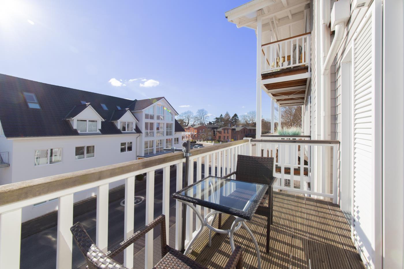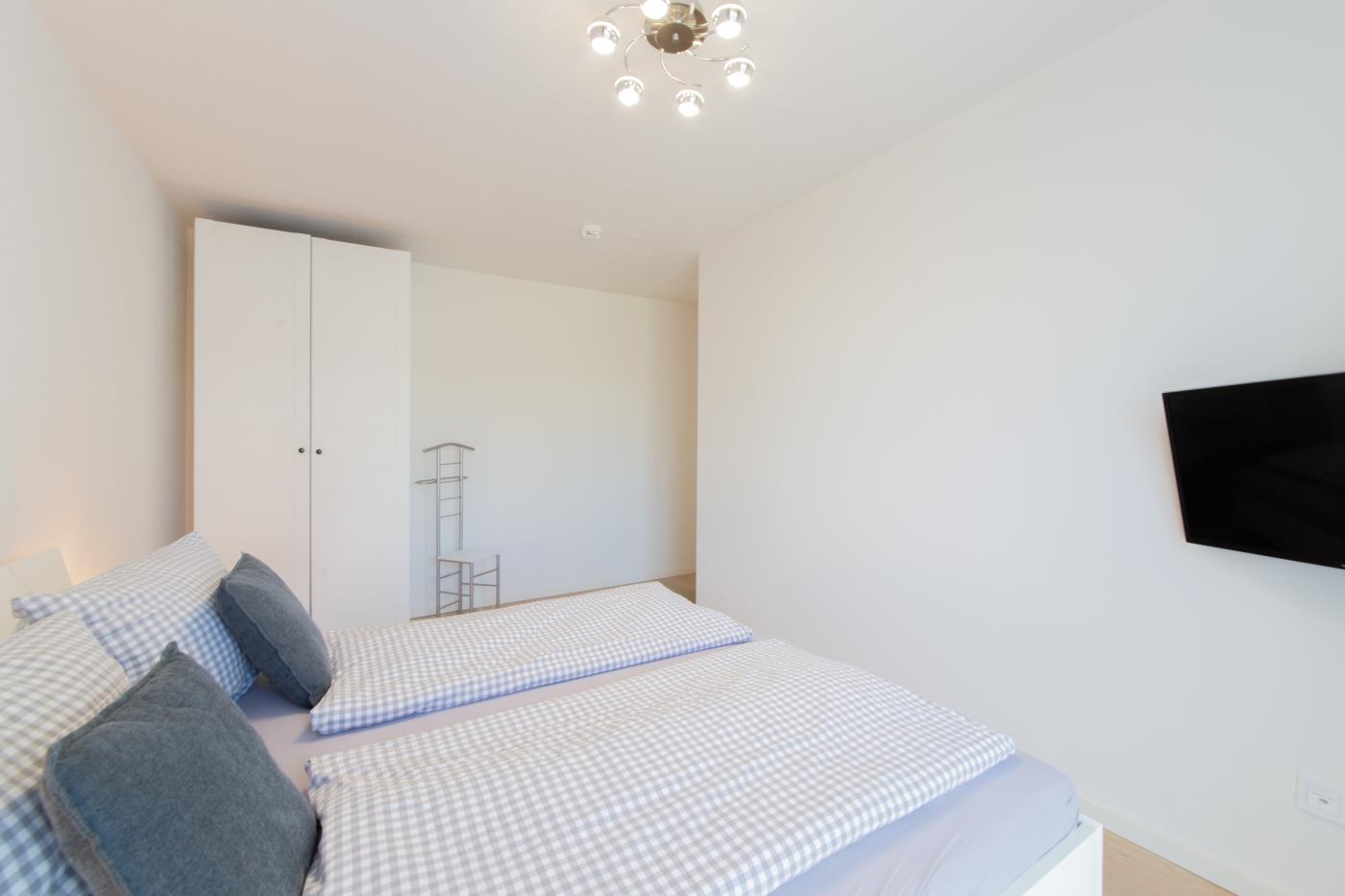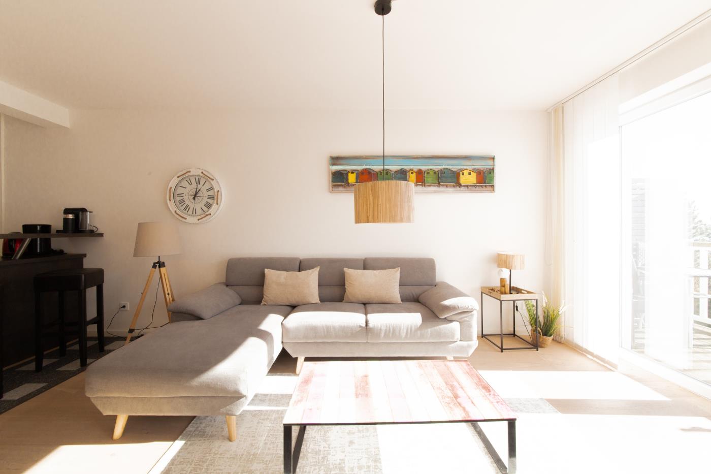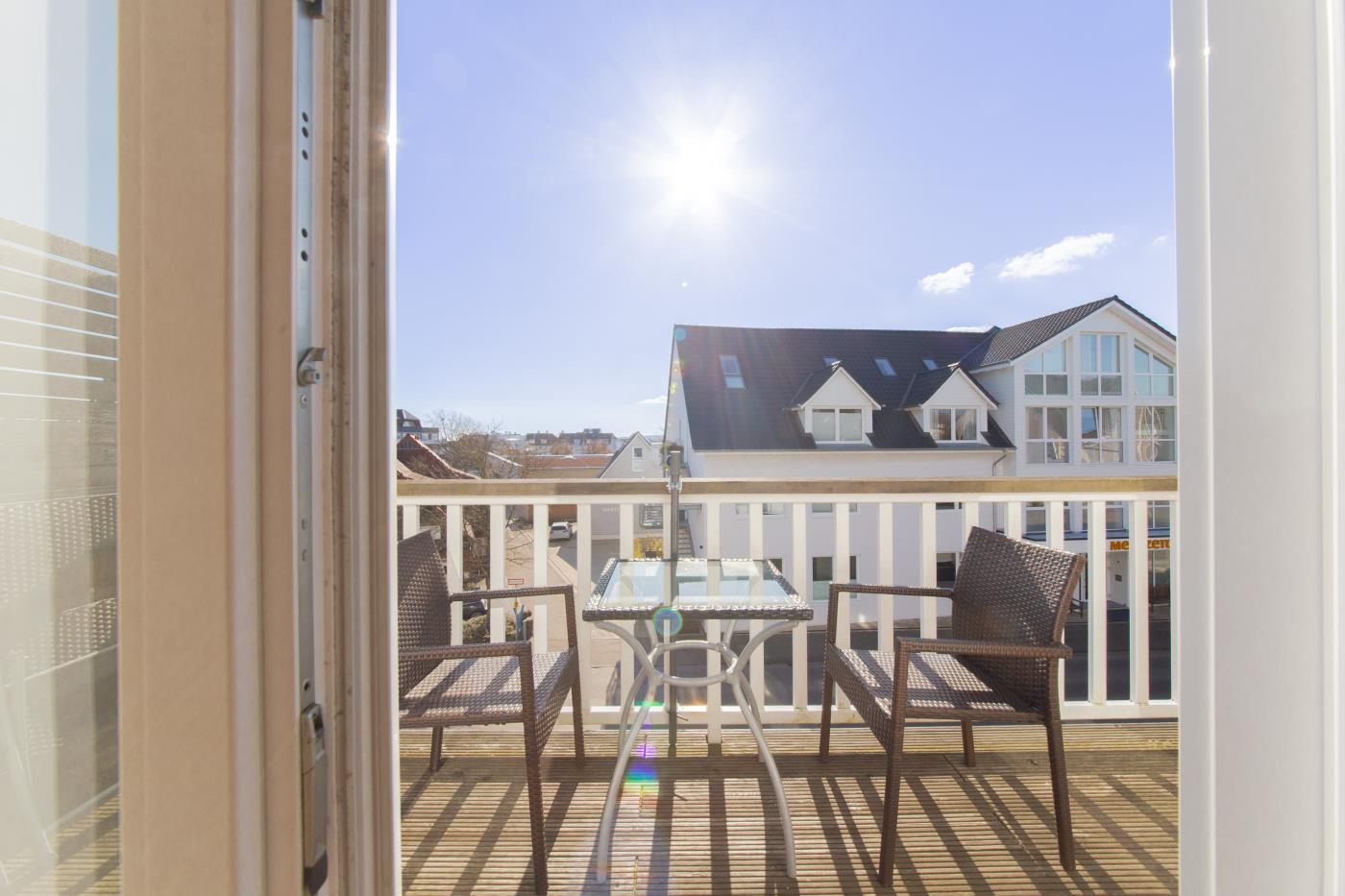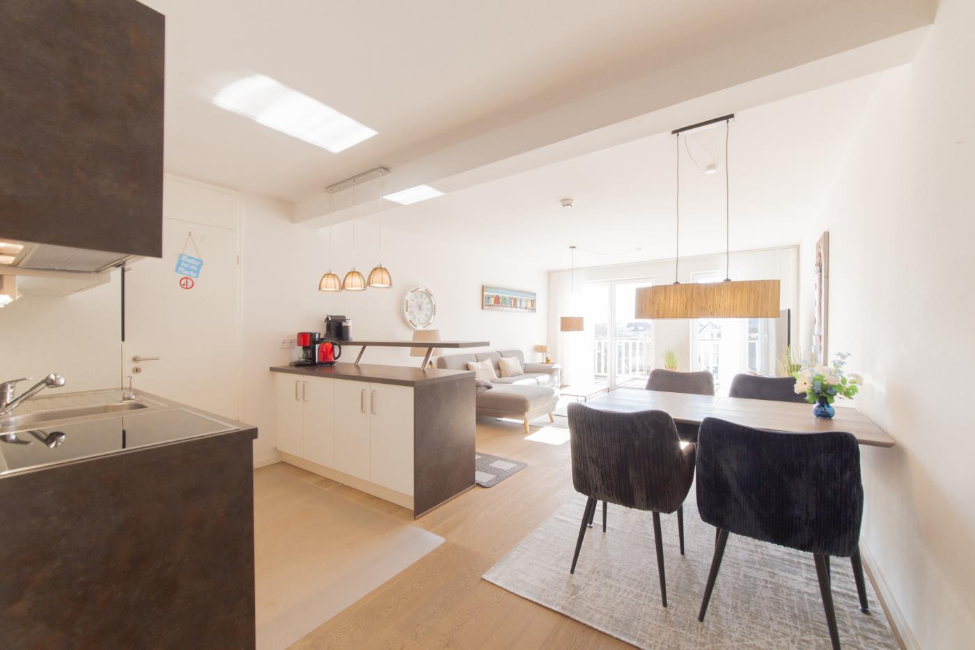 Drei Zimmer bieten Platz für bis zu vier Personen. Beide Schlafzimmer sind mit bequemen Doppelbetten (1,80 er Breite) und Kleiderschränken ausgestattet. Die offene Küche bietet Ihnen alles für einen ausschweifenden Kochabend und lässt keine Wünsche offen. Bodentiefe Fenster im Wohnzimmer sorgen den ganzen Tag für eine helle und freundliche Atmosphäre und die gemütliche Couchecke lädt zum Verweilen ein. Vom Wohnzimmer aus gelangen Sie auf den großzügigen, möblierten und südlich ausgerichteten Balkon von dem Sie einen seitlichen Meerblick genießen können. Das moderne Badezimmer ist mit einer Badewanne, Regendusche und einem WC ausgestattet. Eine Fußbodenheizung sorgt in der ganzen Wohnung auch im Winter für wohlige Wärme.