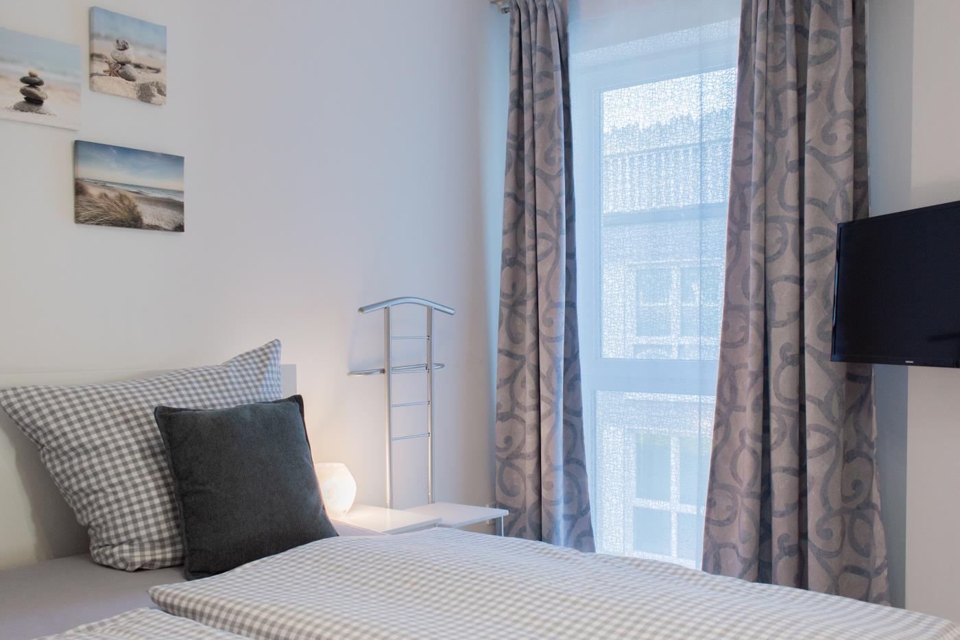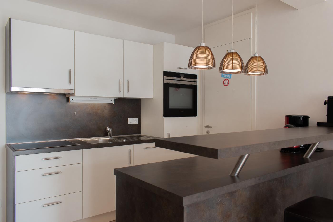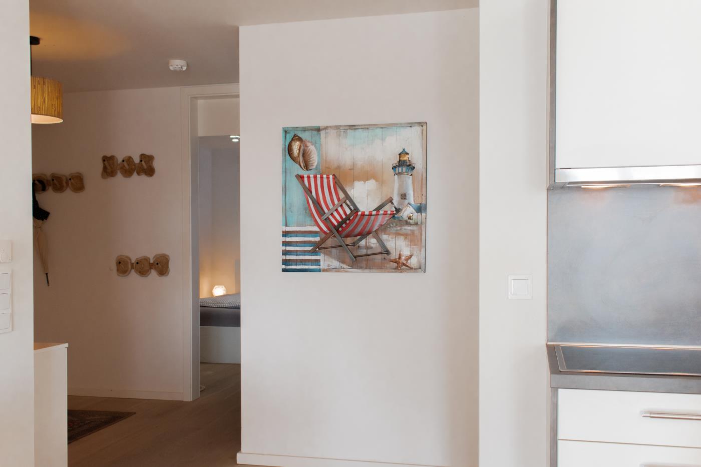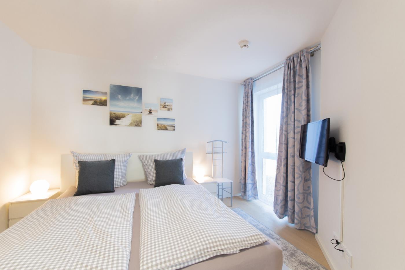 Drei Zimmer bieten Platz für bis zu vier Personen. Beide Schlafzimmer sind mit bequemen Doppelbetten (1,80 er Breite) und Kleiderschränken ausgestattet. Die offene Küche bietet Ihnen alles für einen ausschweifenden Kochabend und lässt keine Wünsche offen. Bodentiefe Fenster im Wohnzimmer sorgen den ganzen Tag für eine helle und freundliche Atmosphäre und die gemütliche Couchecke lädt zum Verweilen ein. Vom Wohnzimmer aus gelangen Sie auf den großzügigen, möblierten und südlich ausgerichteten Balkon von dem Sie einen seitlichen Meerblick genießen können. Das moderne Badezimmer ist mit einer Badewanne, Regendusche und einem WC ausgestattet. Eine Fußbodenheizung sorgt in der ganzen Wohnung auch im Winter für wohlige Wärme.