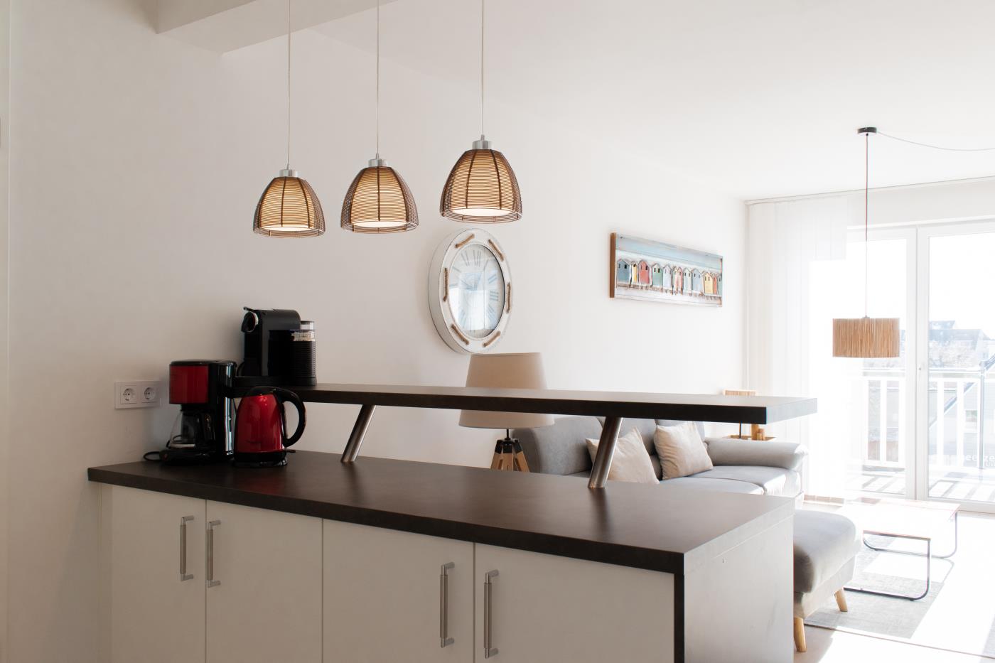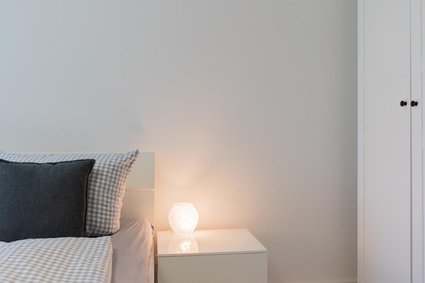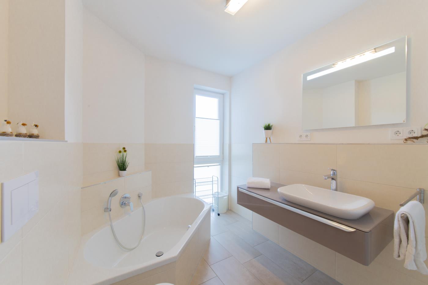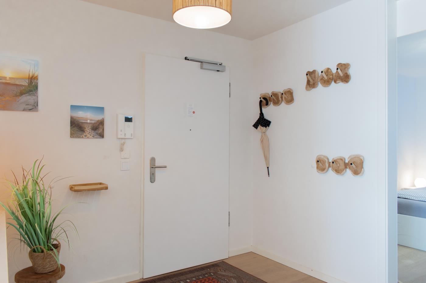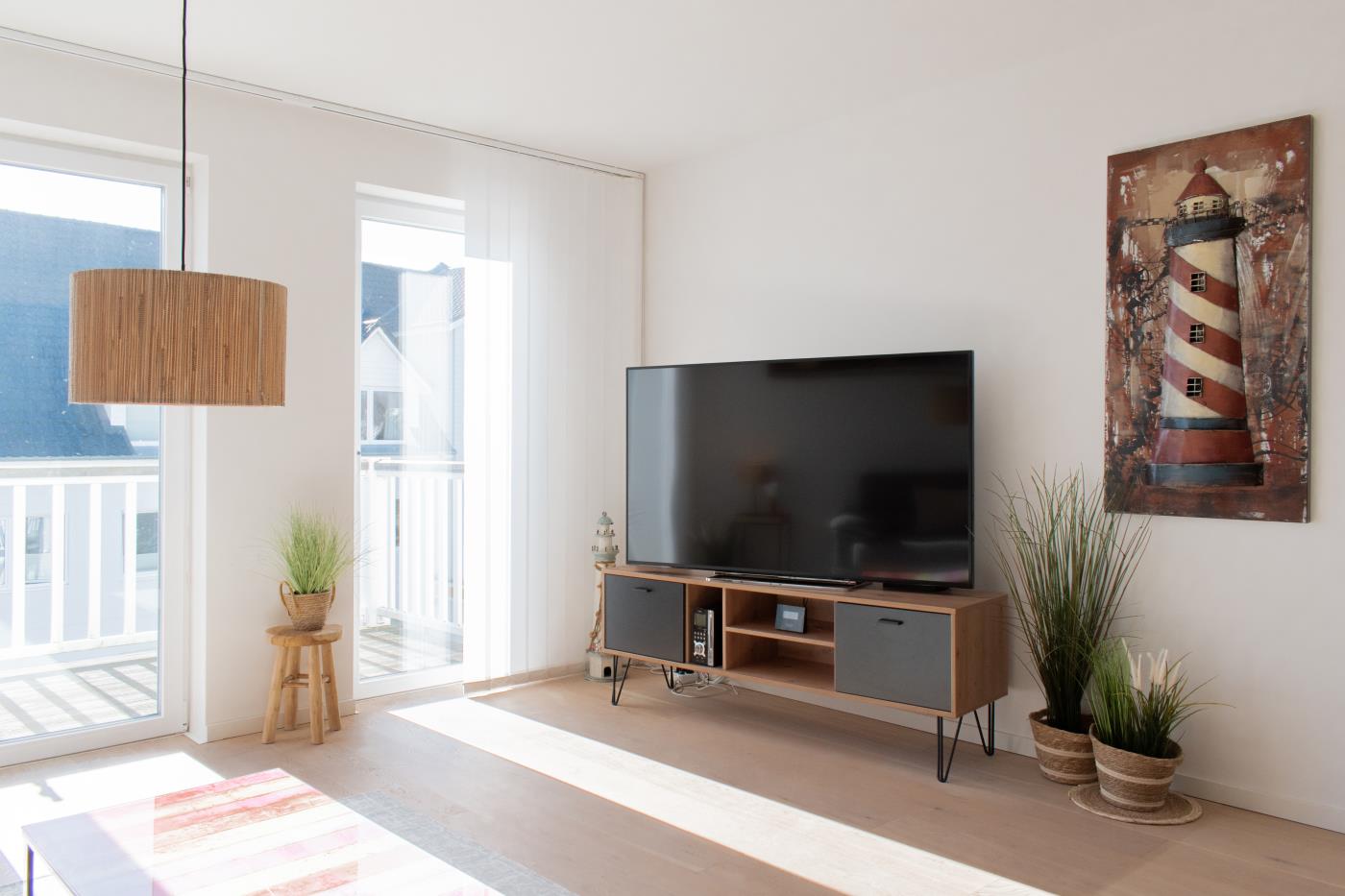 Drei Zimmer bieten Platz für bis zu vier Personen. Beide Schlafzimmer sind mit bequemen Doppelbetten (1,80 er Breite) und Kleiderschränken ausgestattet. Die offene Küche bietet Ihnen alles für einen ausschweifenden Kochabend und lässt keine Wünsche offen. Bodentiefe Fenster im Wohnzimmer sorgen den ganzen Tag für eine helle und freundliche Atmosphäre und die gemütliche Couchecke lädt zum Verweilen ein. Vom Wohnzimmer aus gelangen Sie auf den großzügigen, möblierten und südlich ausgerichteten Balkon von dem Sie einen seitlichen Meerblick genießen können. Das moderne Badezimmer ist mit einer Badewanne, Regendusche und einem WC ausgestattet. Eine Fußbodenheizung sorgt in der ganzen Wohnung auch im Winter für wohlige Wärme.
