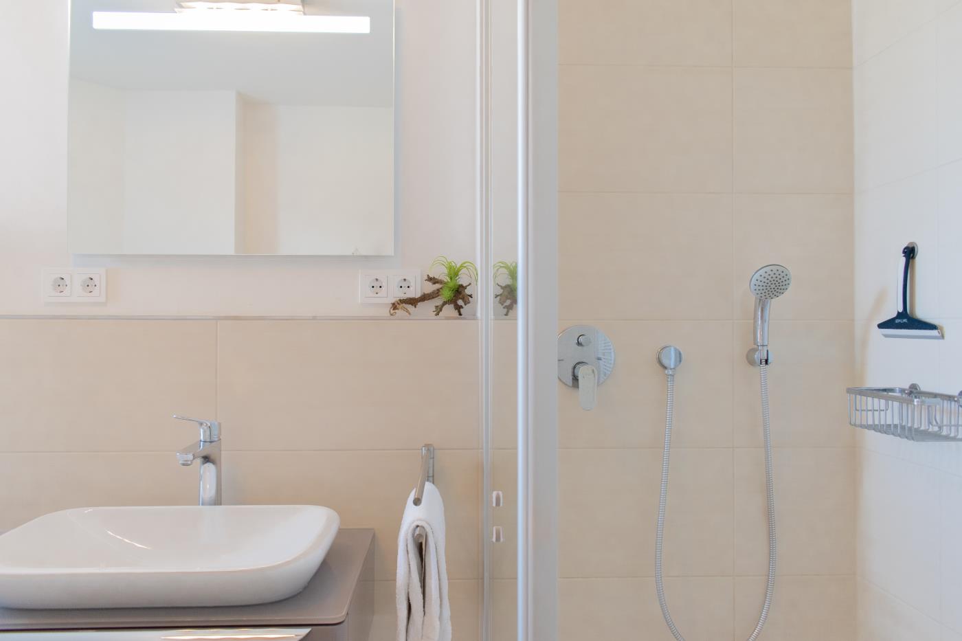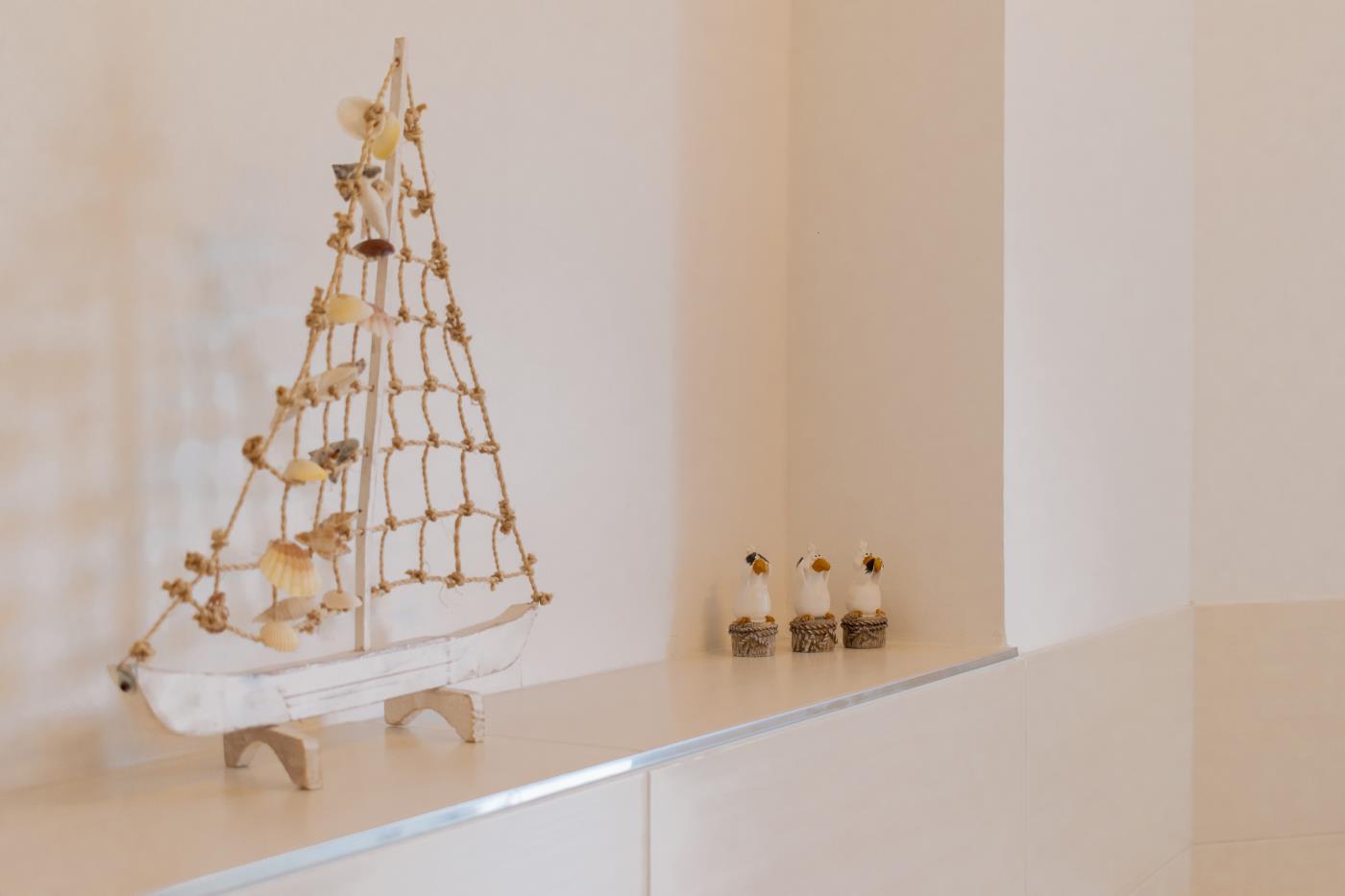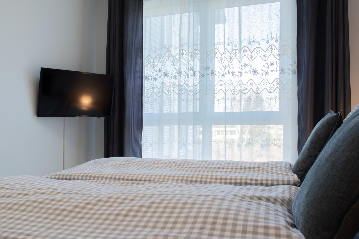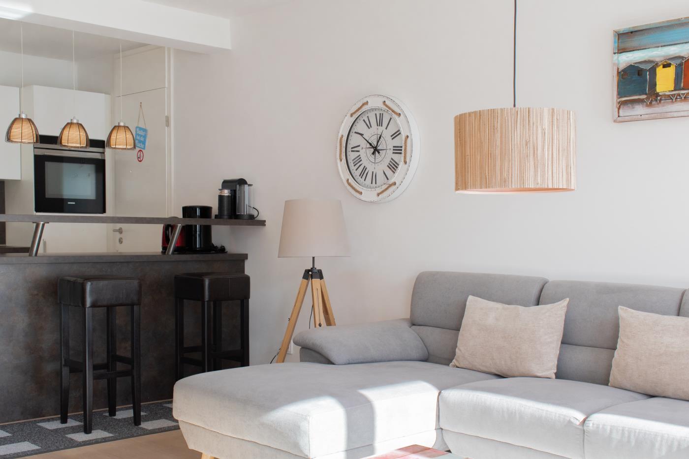 Drei Zimmer bieten Platz für bis zu vier Personen. Beide Schlafzimmer sind mit bequemen Doppelbetten (1,80 er Breite) und Kleiderschränken ausgestattet. Die offene Küche bietet Ihnen alles für einen ausschweifenden Kochabend und lässt keine Wünsche offen. Bodentiefe Fenster im Wohnzimmer sorgen den ganzen Tag für eine helle und freundliche Atmosphäre und die gemütliche Couchecke lädt zum Verweilen ein. Vom Wohnzimmer aus gelangen Sie auf den großzügigen, möblierten und südlich ausgerichteten Balkon von dem Sie einen seitlichen Meerblick genießen können. Das moderne Badezimmer ist mit einer Badewanne, Regendusche und einem WC ausgestattet. Eine Fußbodenheizung sorgt in der ganzen Wohnung auch im Winter für wohlige Wärme.