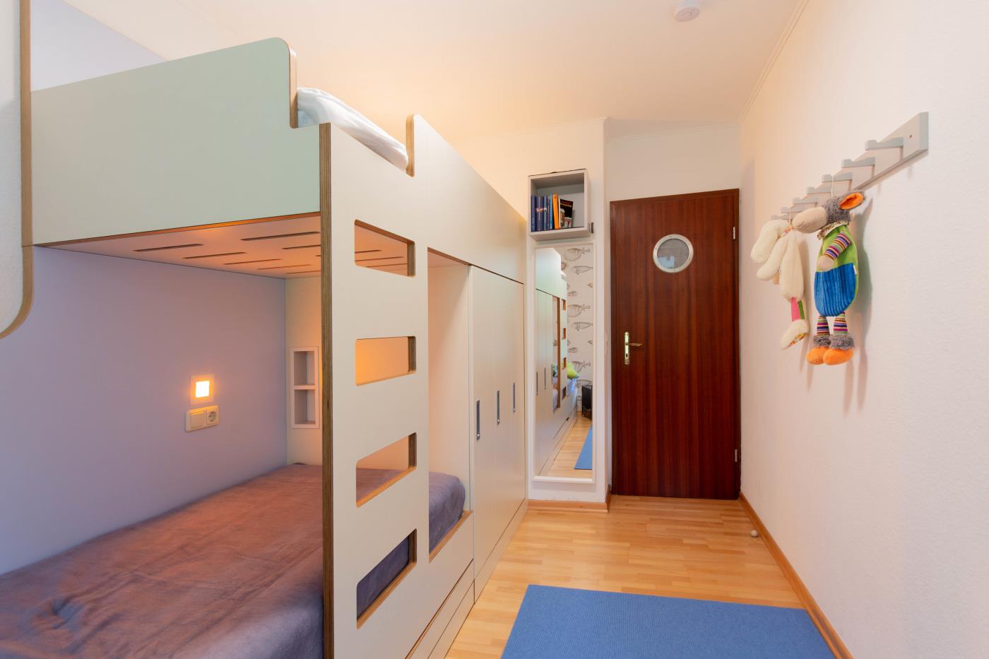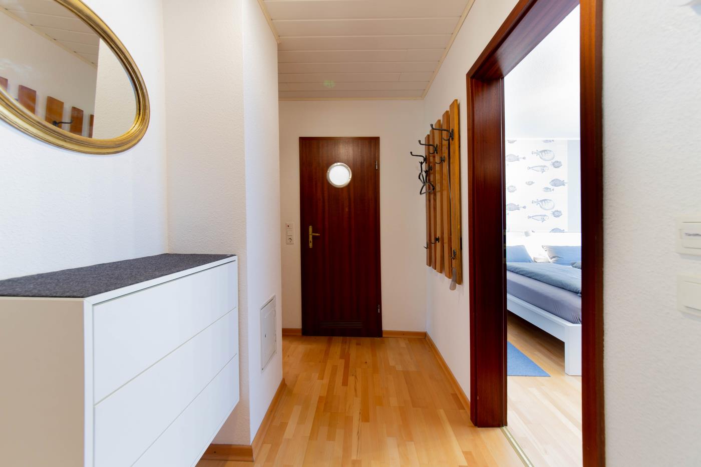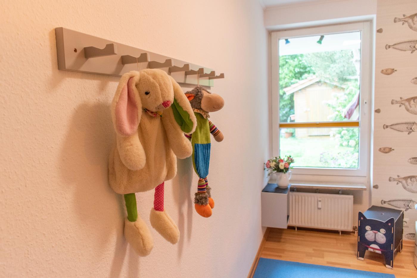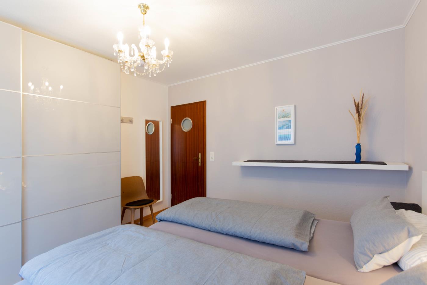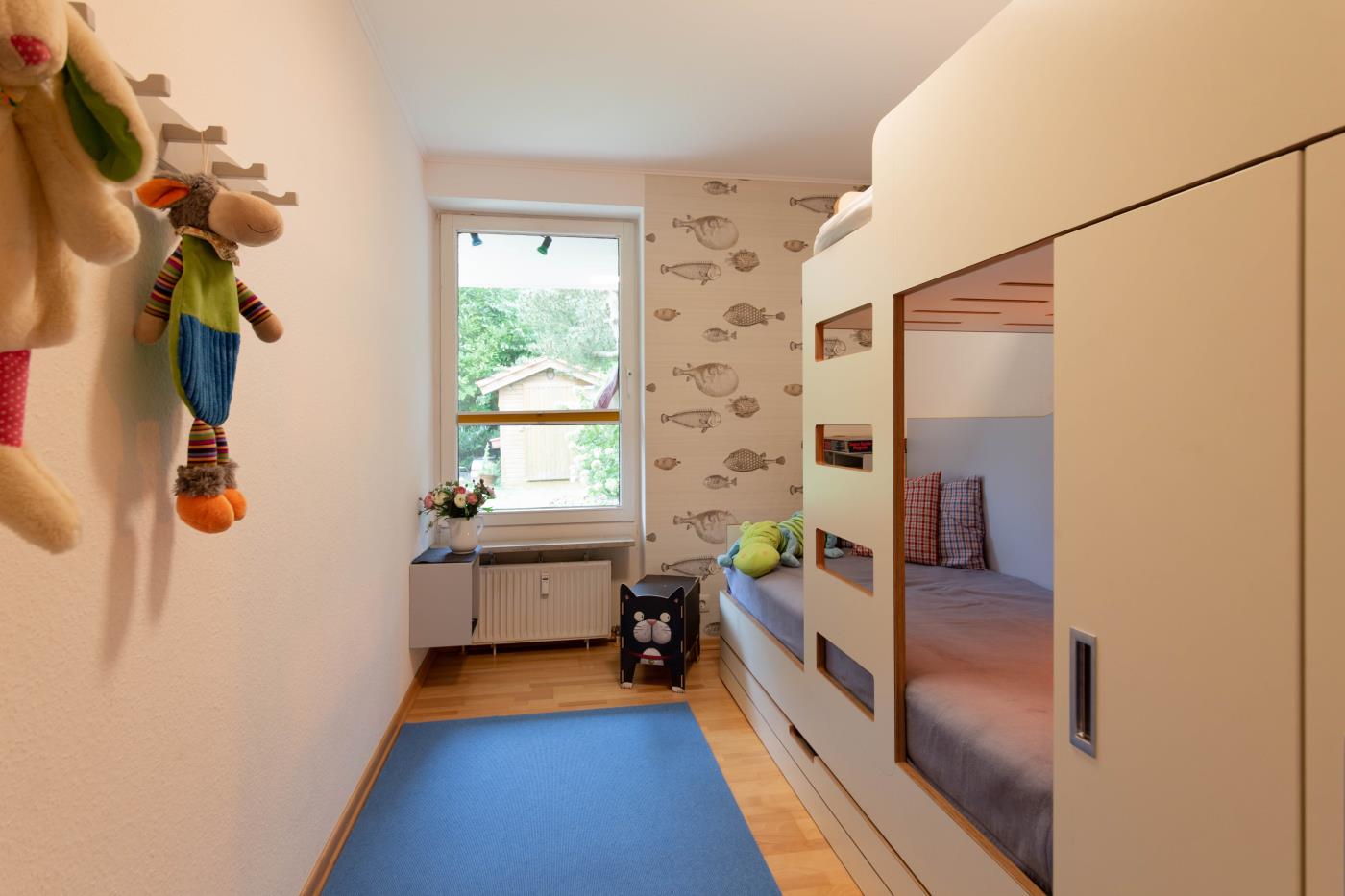 Der lichtdurchflutete Wohnraum ist geschickt aufgeteilt: Die offene Küche verfügt über eine Kochinsel, sodass man auch im Urlaub gemeinsam kulinarische Highlights zaubern kann. Der Essplatz befindet sich direkt daneben und die große Sitzecke an der Fensterfront lädt zum gemütlichen Verweilen ein. Von hier gelangen Sie in den wunderschönen uneinsehbaren Garten mit einer Terrasse und Strandkorb. Dank der Ausrichtung nach Süden, lässt sich hier wunderbar die Ostseesonne genießen. Das größere der beiden Schlafzimmer ist mit einem bequemen Doppelbett (1,80er Breite) ausgestattet und im geräumigen Kleiderschrank können Sie ohne Probleme Ihre gesamte Urlaubsgarderobe verstauen. Das kleinere Schlafzimmer verfügt über ein Etagenbett mit je 0,80er Breite und eine liebevoll gestaltete Spielecke für Kinder. Abgerundet wird diese familienfreundliche Ferienwohnung durch das innenliegende Badezimmer, welches mit einer Dusche mit Duschvorhang und einem Handtuchheizkörper ausgestattet ist.