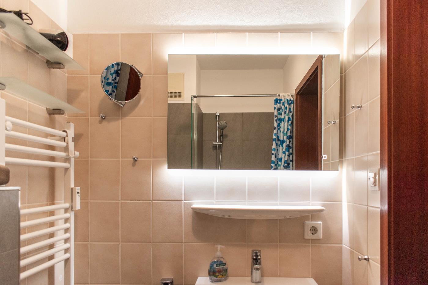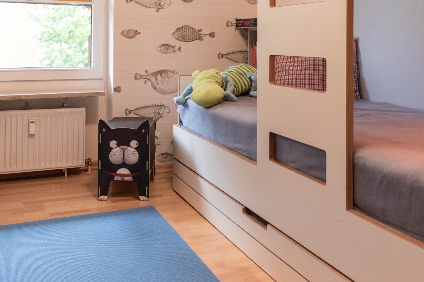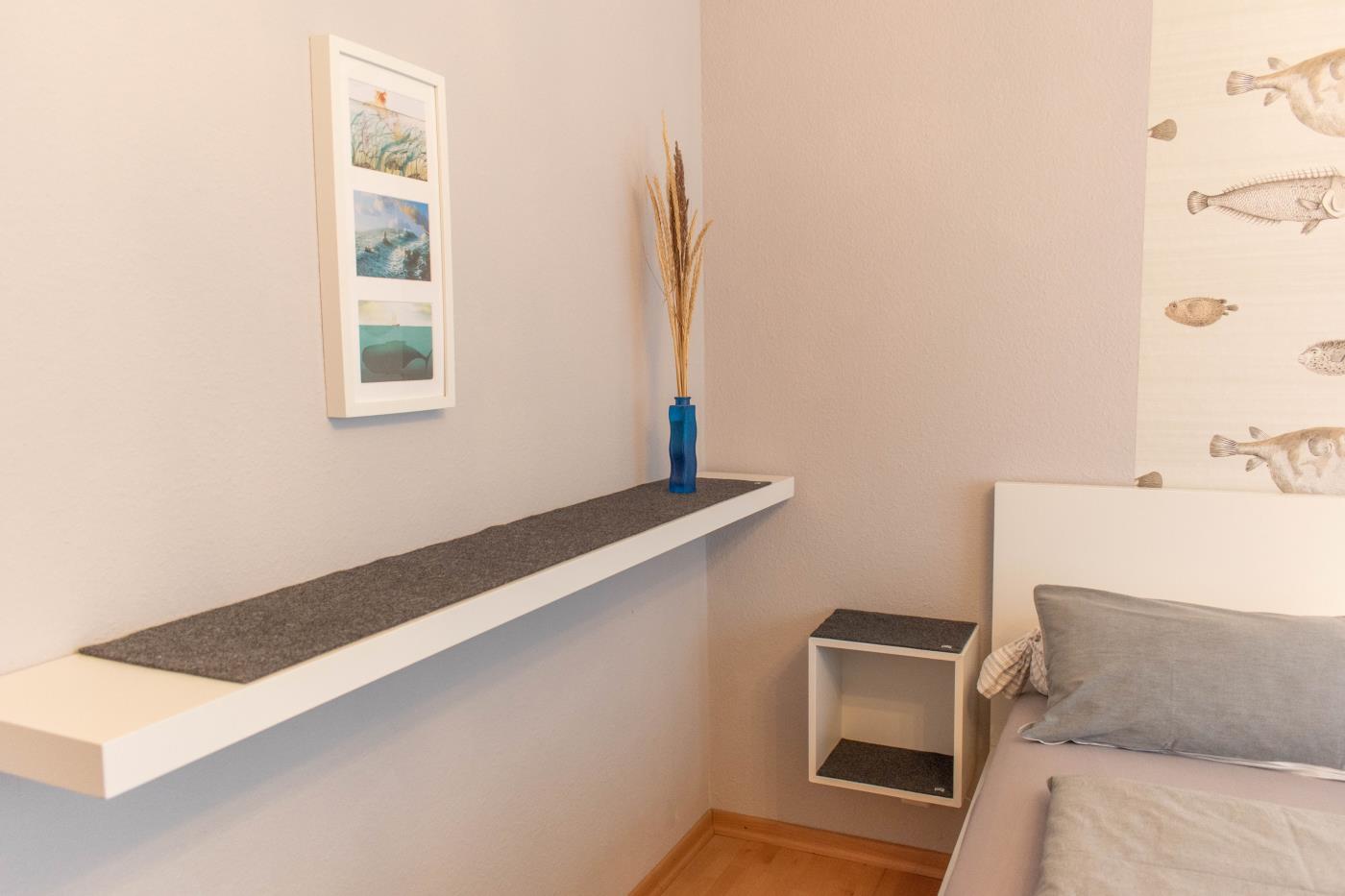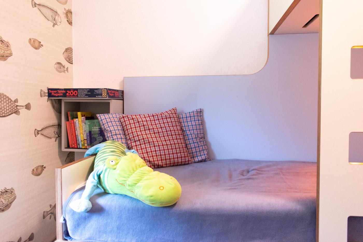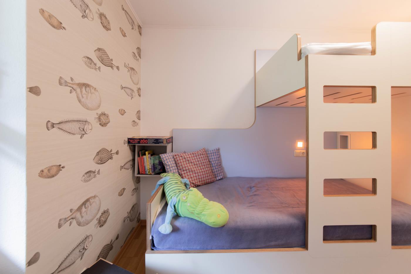 Der lichtdurchflutete Wohnraum ist geschickt aufgeteilt: Die offene Küche verfügt über eine Kochinsel, sodass man auch im Urlaub gemeinsam kulinarische Highlights zaubern kann. Der Essplatz befindet sich direkt daneben und die große Sitzecke an der Fensterfront lädt zum gemütlichen Verweilen ein. Von hier gelangen Sie in den wunderschönen uneinsehbaren Garten mit einer Terrasse und Strandkorb. Dank der Ausrichtung nach Süden, lässt sich hier wunderbar die Ostseesonne genießen. Das größere der beiden Schlafzimmer ist mit einem bequemen Doppelbett (1,80er Breite) ausgestattet und im geräumigen Kleiderschrank können Sie ohne Probleme Ihre gesamte Urlaubsgarderobe verstauen. Das kleinere Schlafzimmer verfügt über ein Etagenbett mit je 0,80er Breite und eine liebevoll gestaltete Spielecke für Kinder. Abgerundet wird diese familienfreundliche Ferienwohnung durch das innenliegende Badezimmer, welches mit einer Dusche mit Duschvorhang und einem Handtuchheizkörper ausgestattet ist.