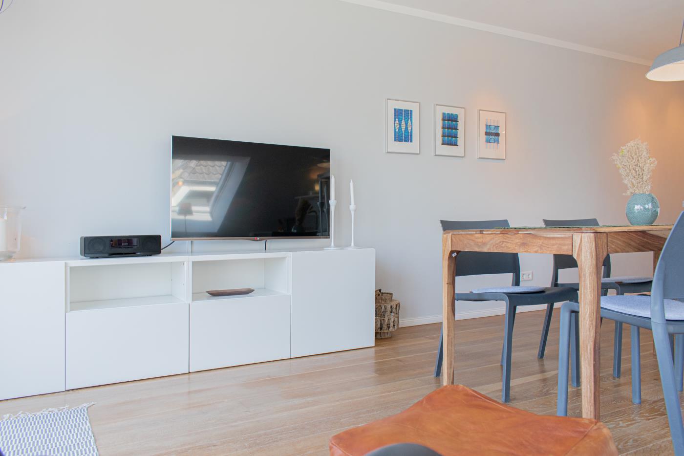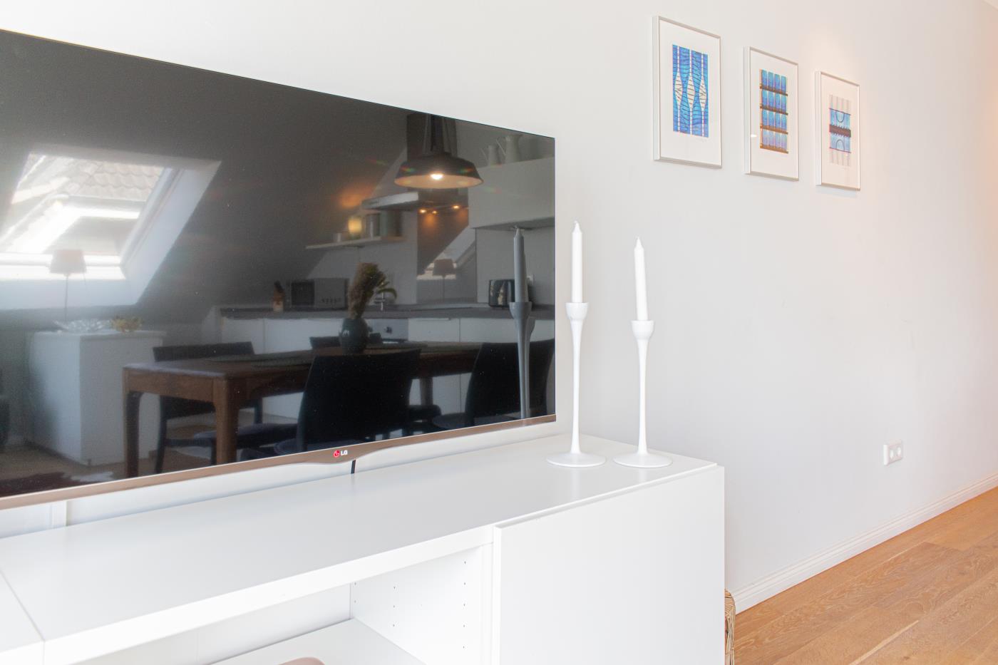 Unterhaltung am Abend: Ein großer LED-TV im Wohnzimmer mit Blu-Ray-Player lädt zu langen DVD-Abenden ein. Zwei weitere LED-TV's befinden sich in den zwei Schlafzimmern. WLAN-Zugang und eine Stereoanlage mit iPod-Anschluss gehören ebenfalls zum Entertaiment.