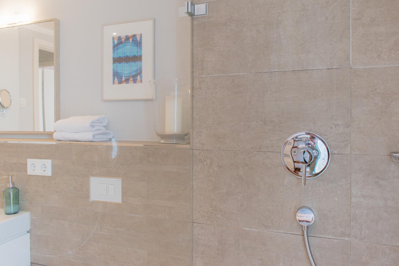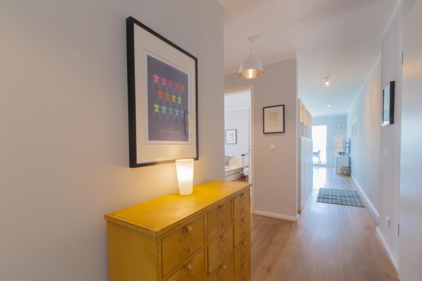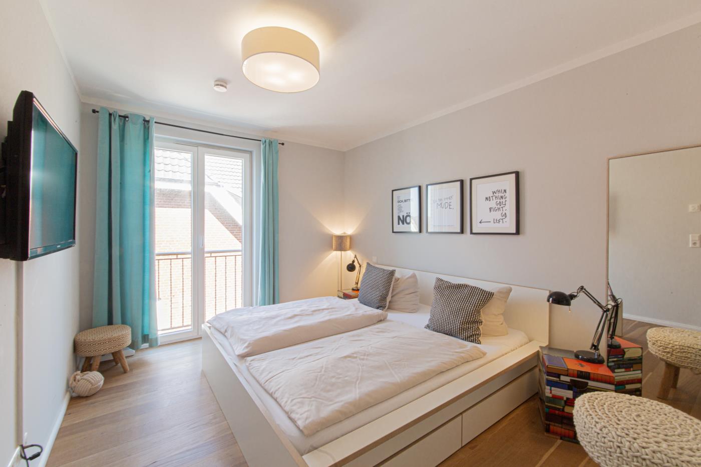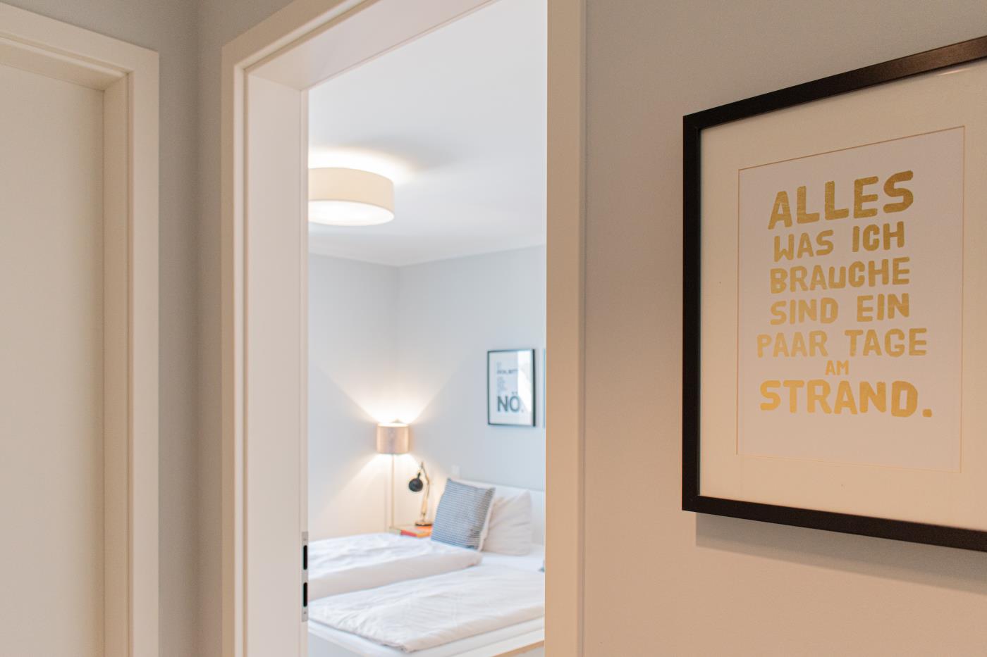 Drei Zimmer bieten Platz für bis zu vier Personen. Beide Schlafzimmer sind mit bequemen Doppelbetten (1,80 er Breite - durchgehende Matratze) ausgestattet. Die offene Küche ist komplett ausgestattet und lässt keine Wünsche offen. Bodentiefe Fenster im Wohnzimmer sorgen den ganzen Tag für eine helle und freundliche Atmosphäre. Vom Wohnzimmer aus gelangt man auf den großzügigen, möblierten Balkon von dem man einen traumhaften Meerblick genießen darf. Zwei Gartenliegen laden zum relaxen ein. Das moderne Badezimmer ist mit einer Regendusche und einem WC ausgestattet. Außerdem gibt es noch ein Gäste-WC in dem sich auch die Waschmaschine und der Trockner befinden. Eine Fußbodenheizung in der ganzen Wohnung rundet das vielfältige Angebot ab.