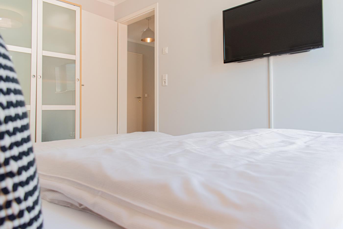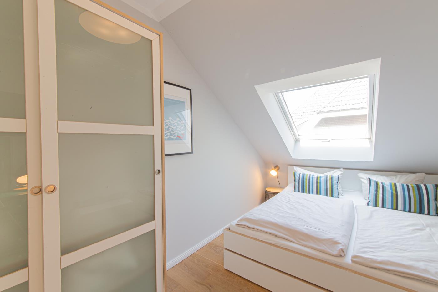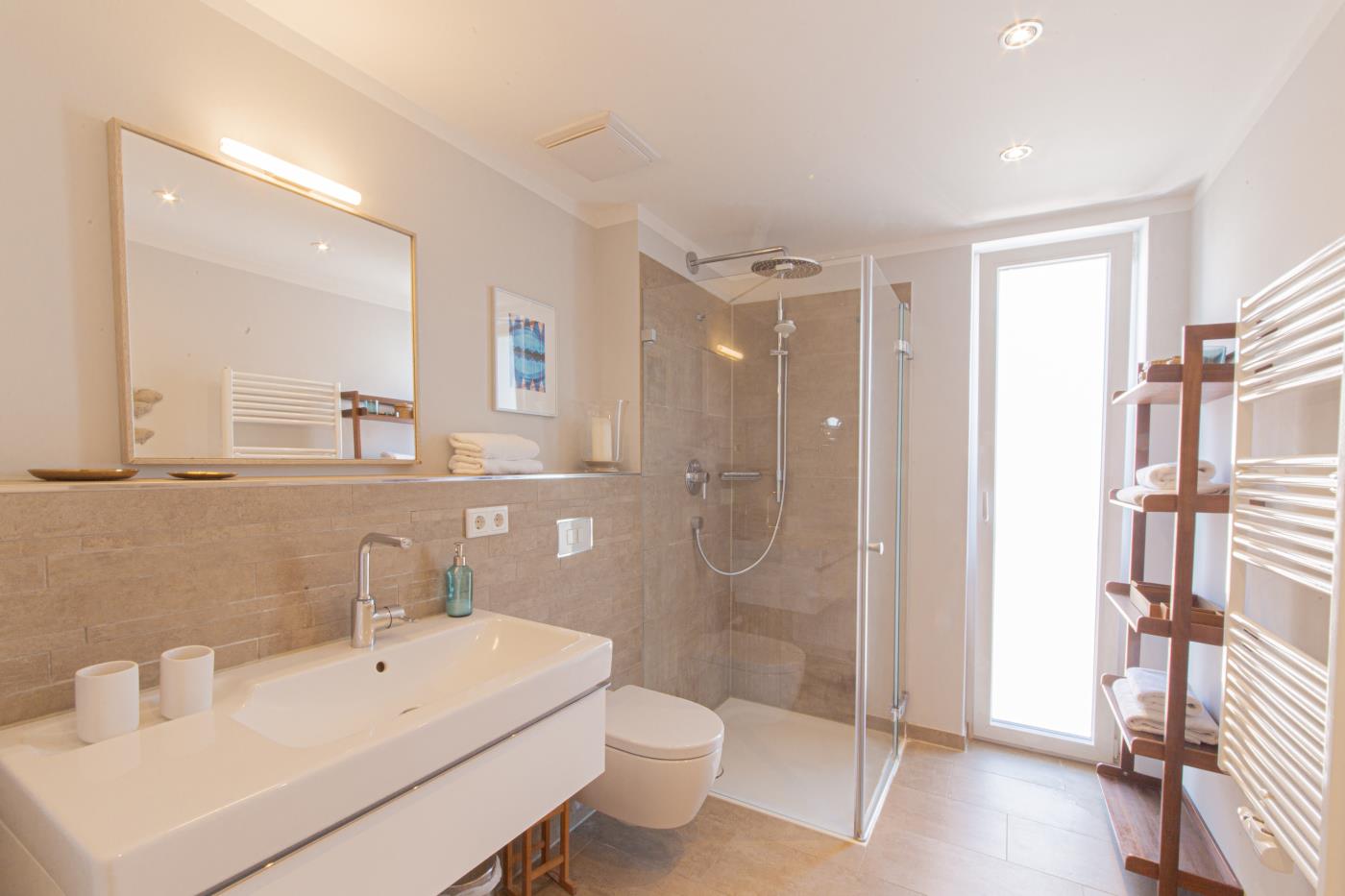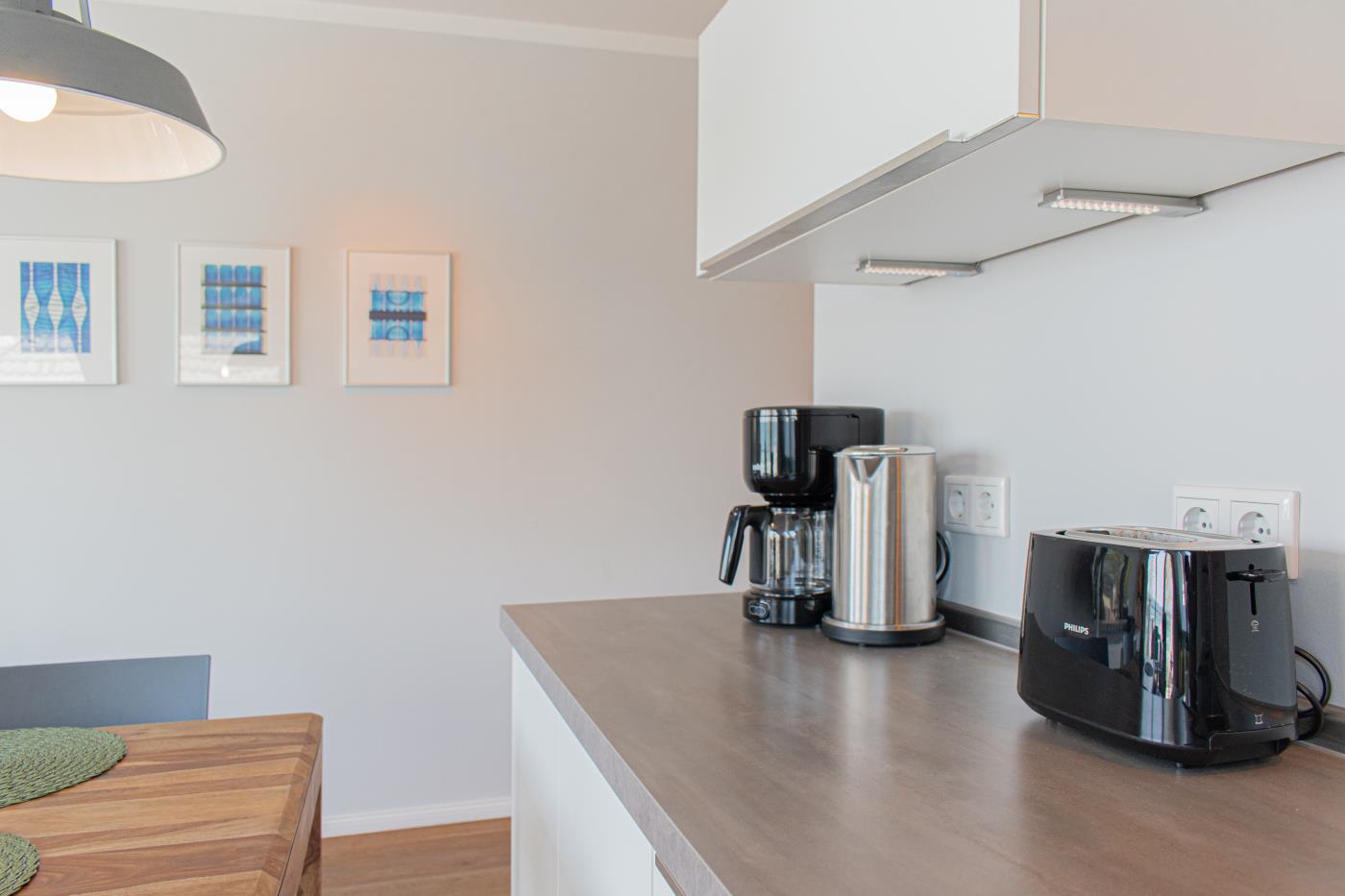 Drei Zimmer bieten Platz für bis zu vier Personen. Beide Schlafzimmer sind mit bequemen Doppelbetten (1,80 er Breite - durchgehende Matratze) ausgestattet. Die offene Küche ist komplett ausgestattet und lässt keine Wünsche offen. Bodentiefe Fenster im Wohnzimmer sorgen den ganzen Tag für eine helle und freundliche Atmosphäre. Vom Wohnzimmer aus gelangt man auf den großzügigen, möblierten Balkon von dem man einen traumhaften Meerblick genießen darf. Zwei Gartenliegen laden zum relaxen ein. Das moderne Badezimmer ist mit einer Regendusche und einem WC ausgestattet. Außerdem gibt es noch ein Gäste-WC in dem sich auch die Waschmaschine und der Trockner befinden. Eine Fußbodenheizung in der ganzen Wohnung rundet das vielfältige Angebot ab.