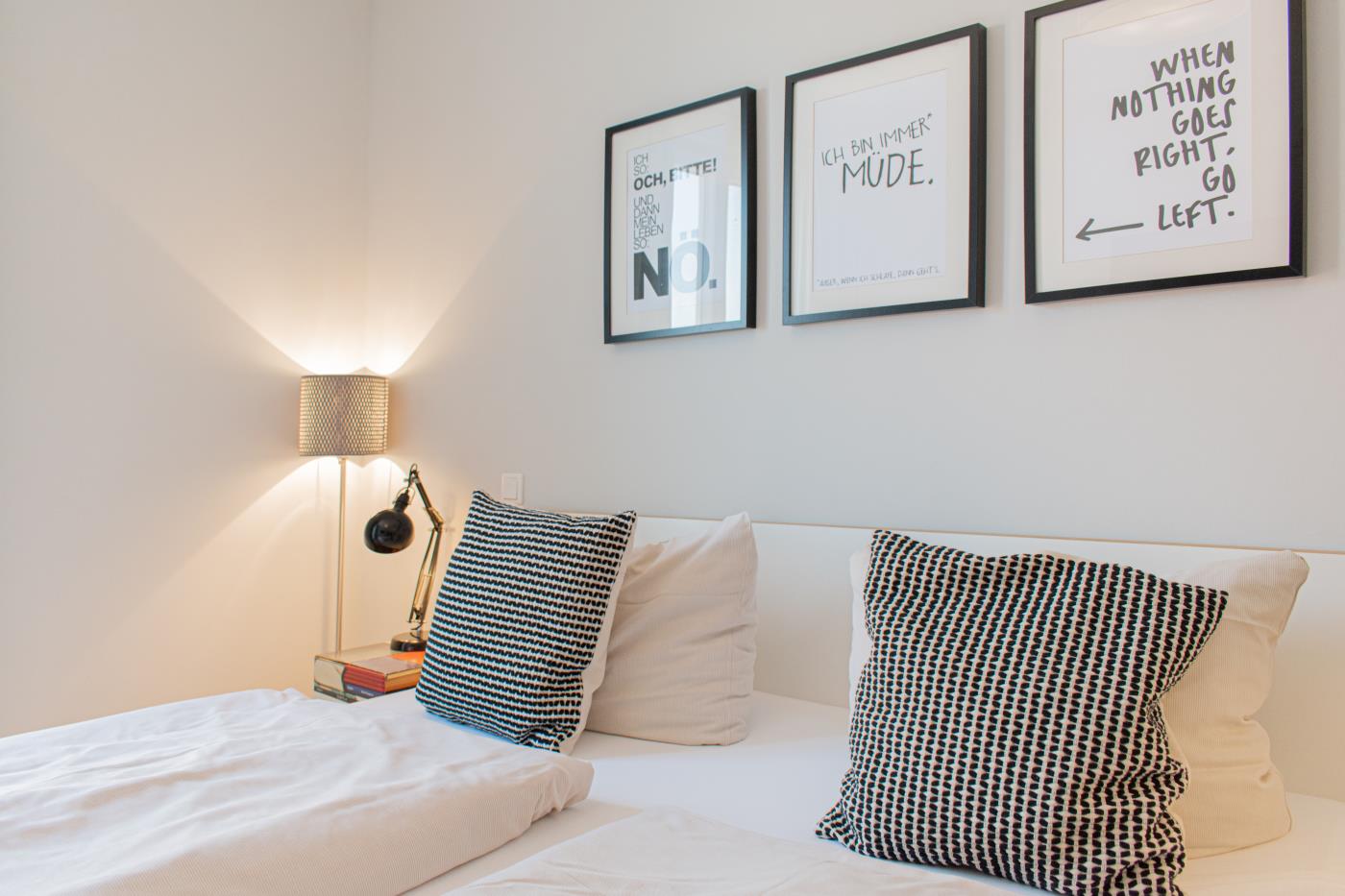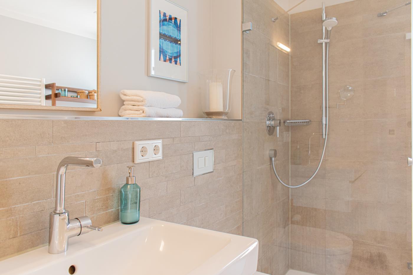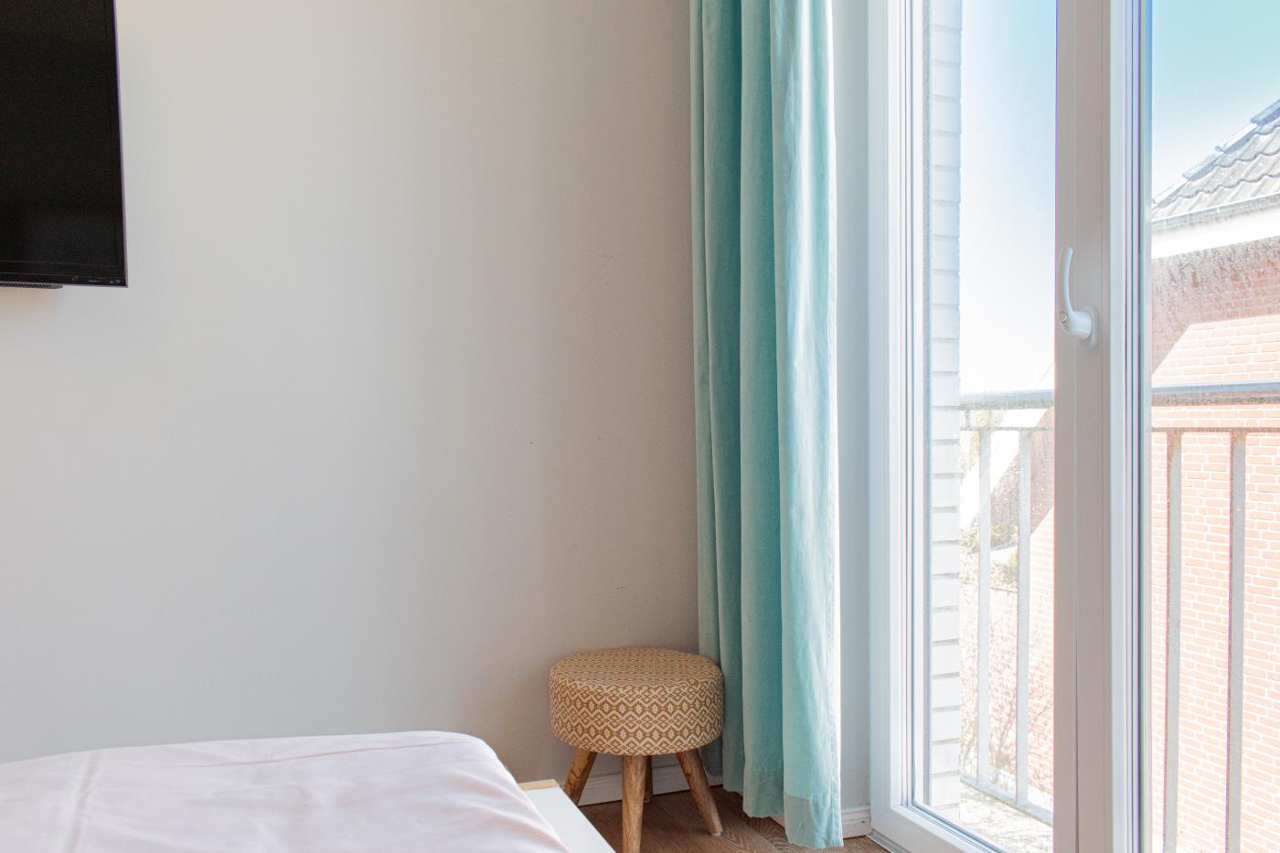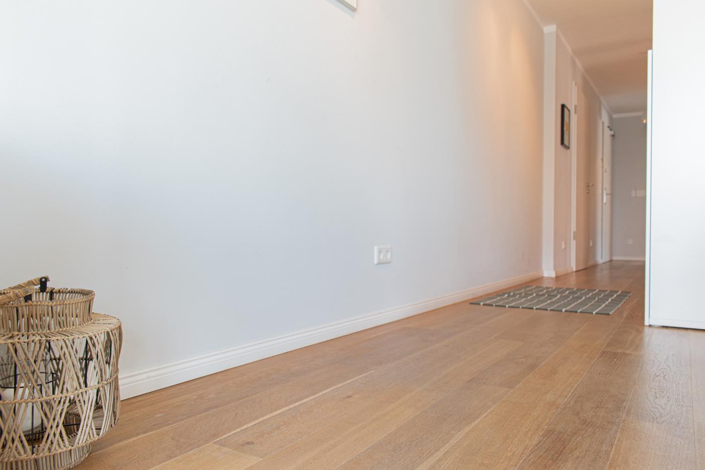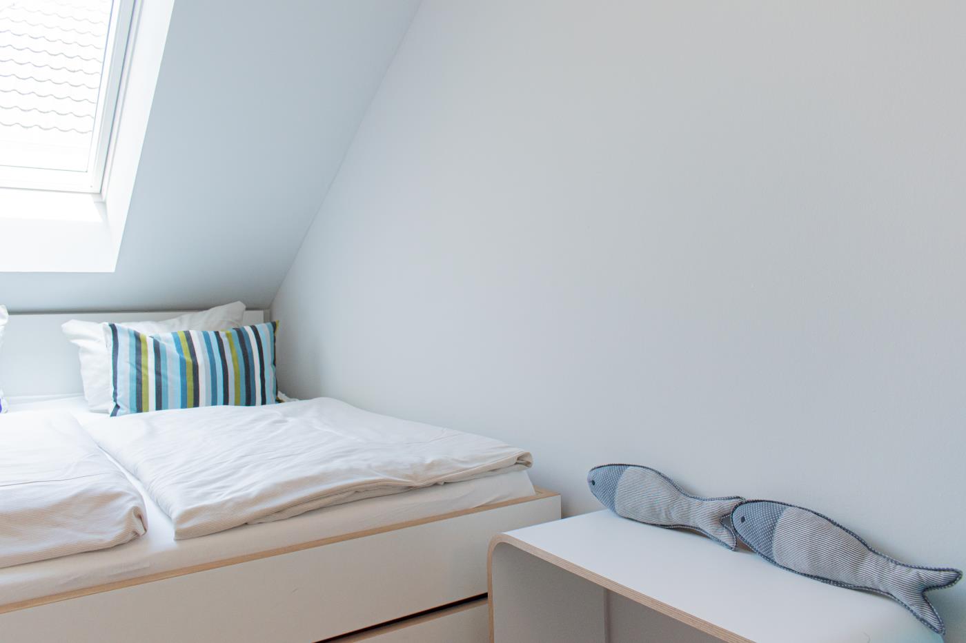 Drei Zimmer bieten Platz für bis zu vier Personen. Beide Schlafzimmer sind mit bequemen Doppelbetten (1,80 er Breite - durchgehende Matratze) ausgestattet. Die offene Küche ist komplett ausgestattet und lässt keine Wünsche offen. Bodentiefe Fenster im Wohnzimmer sorgen den ganzen Tag für eine helle und freundliche Atmosphäre. Vom Wohnzimmer aus gelangt man auf den großzügigen, möblierten Balkon von dem man einen traumhaften Meerblick genießen darf. Zwei Gartenliegen laden zum relaxen ein. Das moderne Badezimmer ist mit einer Regendusche und einem WC ausgestattet. Außerdem gibt es noch ein Gäste-WC in dem sich auch die Waschmaschine und der Trockner befinden. Eine Fußbodenheizung in der ganzen Wohnung rundet das vielfältige Angebot ab.
